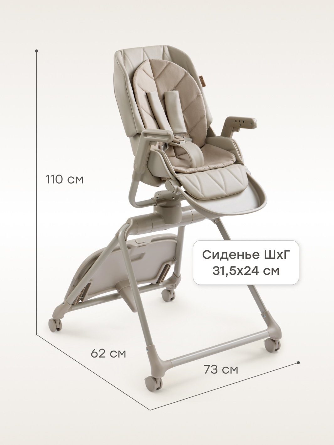 Основной чехол изготовлен из экологичной кожи, устойчивой к загрязнениям и легко очищающейся влажной тканью. Столешницу можно снять и мыть отдельно в посудомоечной машине. Для дополнительной защиты мягких частей тела ребенка предусмотрены мягкие вставки из натурального хлопка, удобные и приятные на ощупь.