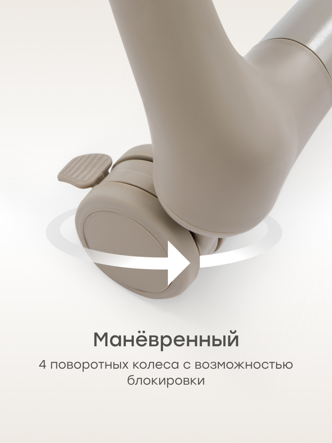 При желании стул легко складывается и занимает минимум пространства при хранении. Колеса со специальными фиксаторами позволяют свободно передвигаться по дому и обеспечивают устойчивость конструкции на месте.