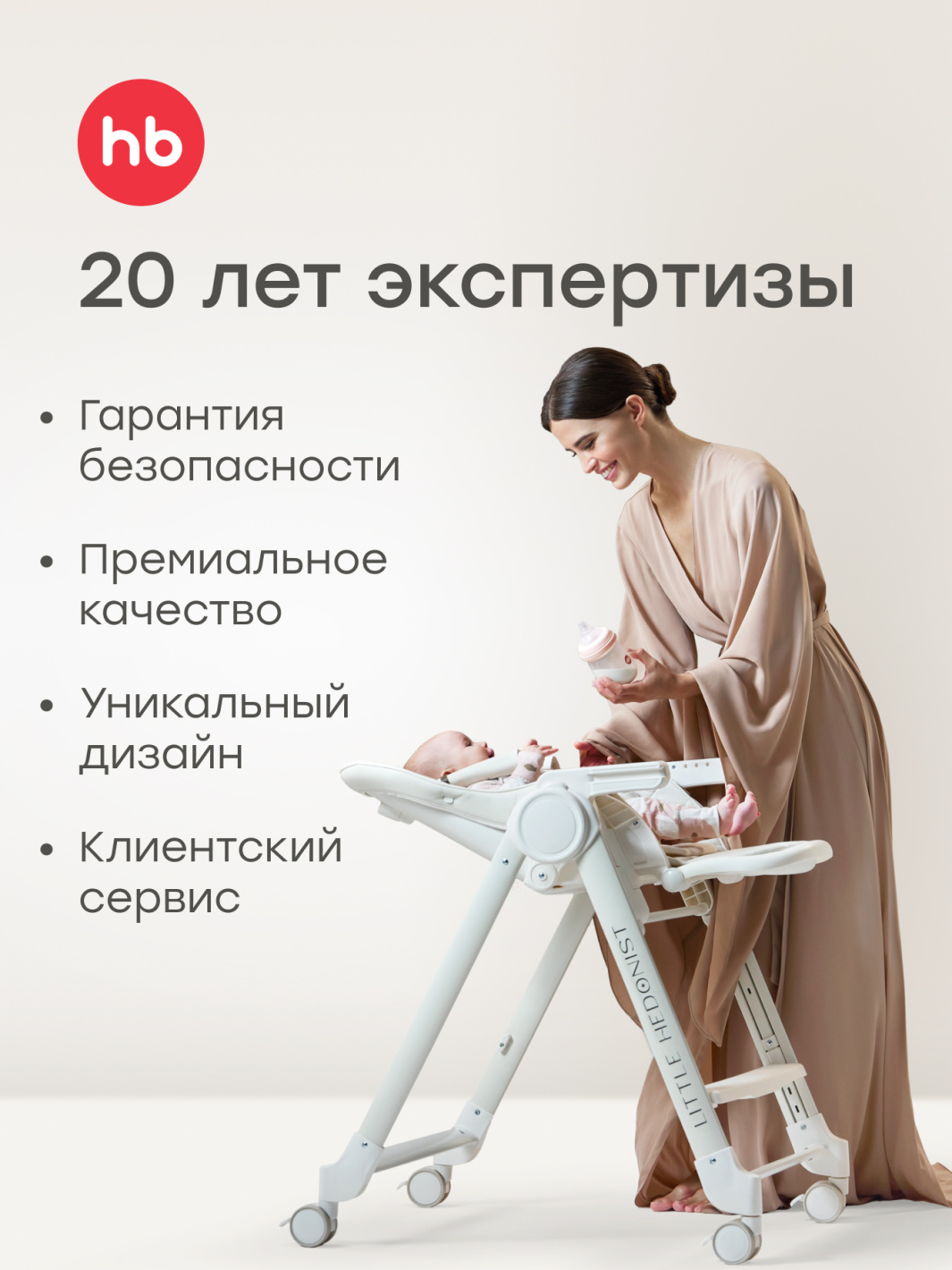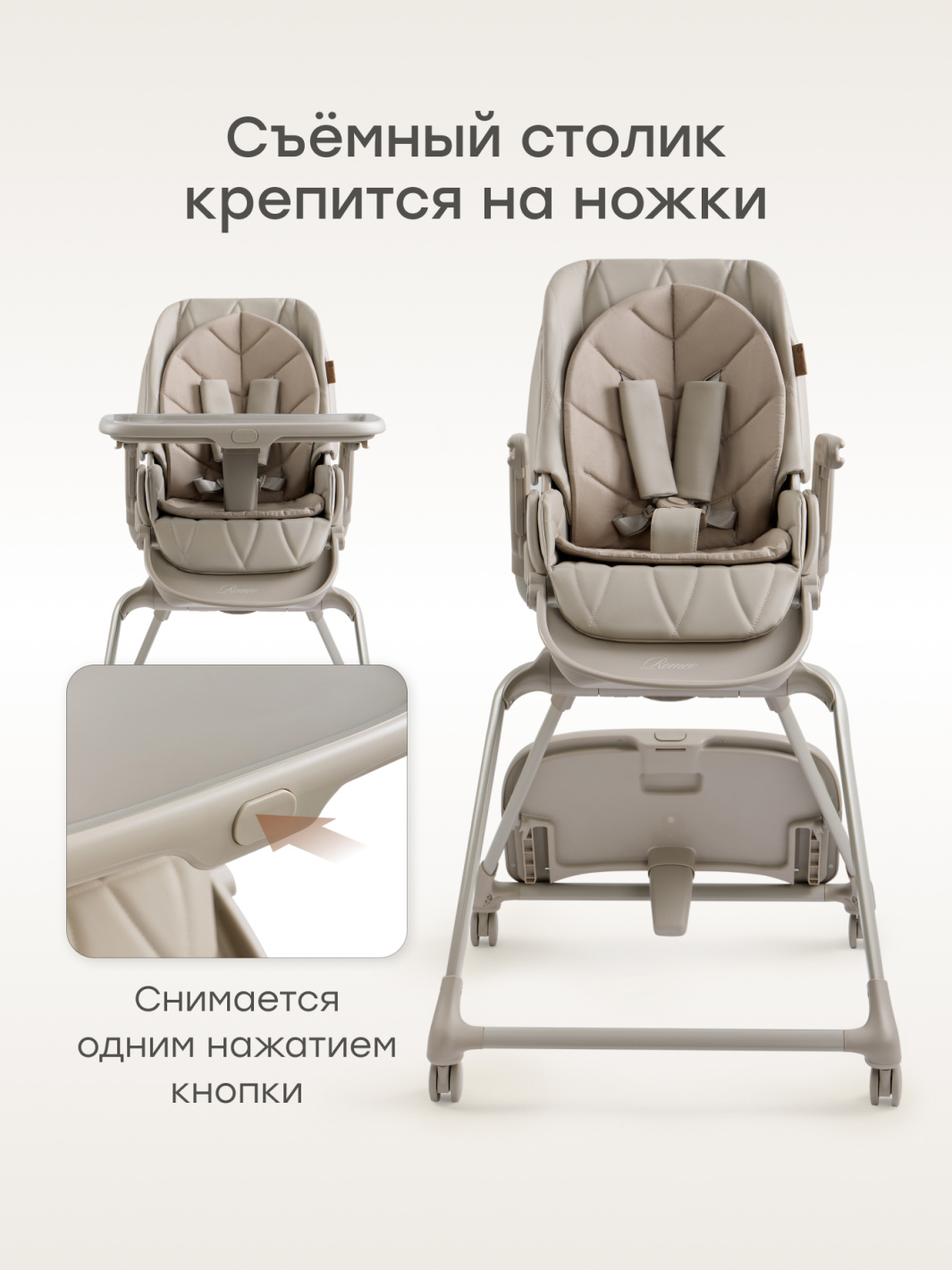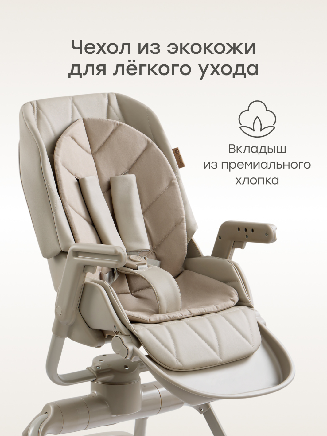 Основной чехол изготовлен из экологичной кожи, устойчивой к загрязнениям и легко очищающейся влажной тканью. Столешницу можно снять и мыть отдельно в посудомоечной машине. Для дополнительной защиты мягких частей тела ребенка предусмотрены мягкие вставки из натурального хлопка, удобные и приятные на ощупь.