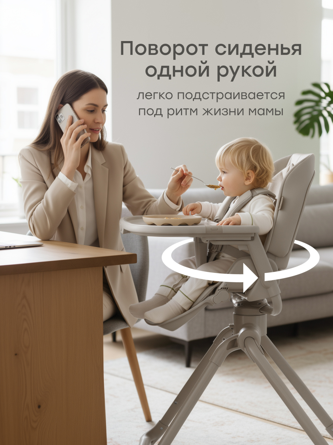 Благодаря поворотному механизму ребенок всегда находится рядом с вами. Больше не нужно постоянно перемещать стульчик для кормления ребенка туда-сюда. Просто нажмите кнопку, и ваш малыш сможет наблюдать любимые мультфильмы прямо напротив вас. Затем, нажимая на рычаг, верните стульчик обратно за столик всего одним движением руки.