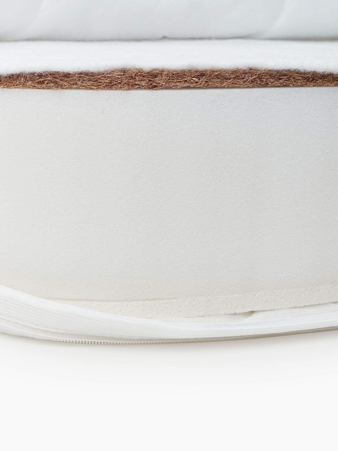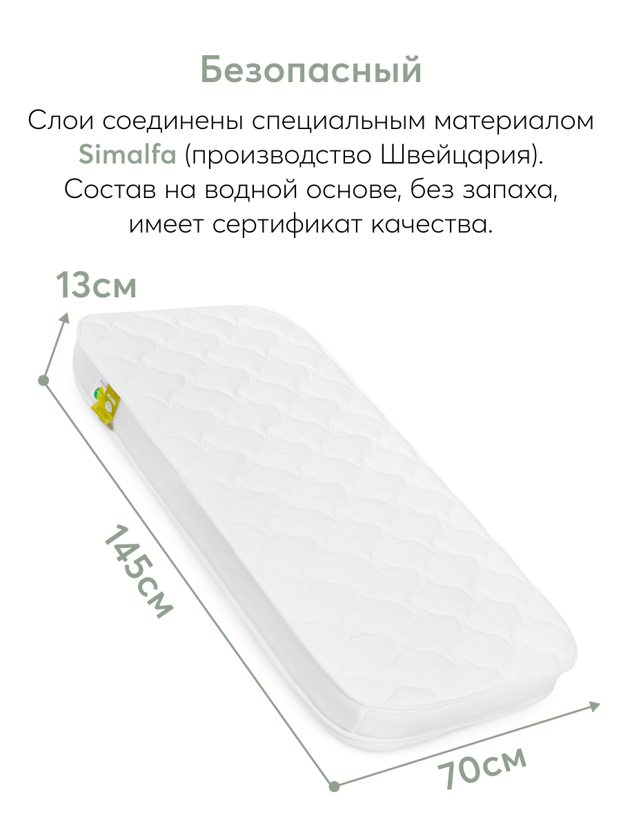 Матрас Happy Baby идеально подходит для малышей с самого рождения и соответствует всем требованиям для здорового сна ребенка: он жесткий, без пружин, изготовлен из качественных материалов и имеет толщину 130 мм. Модель предназначена для сна в разном возрасте. С одной стороны слой натуральной латексированной кокосовой койры 10мм, он обеспечивает максимальный ортопедический эффект, необходимый новорожденному (жесткость 5 из 5). С другой — латекс, природный эластичный материал, который подарит ребенку особый комфорт благодаря точечному распределению нагрузки. На этой стороне мы рекомендуем спать детям после года (слой 10 мм, жесткость 4 из 5).