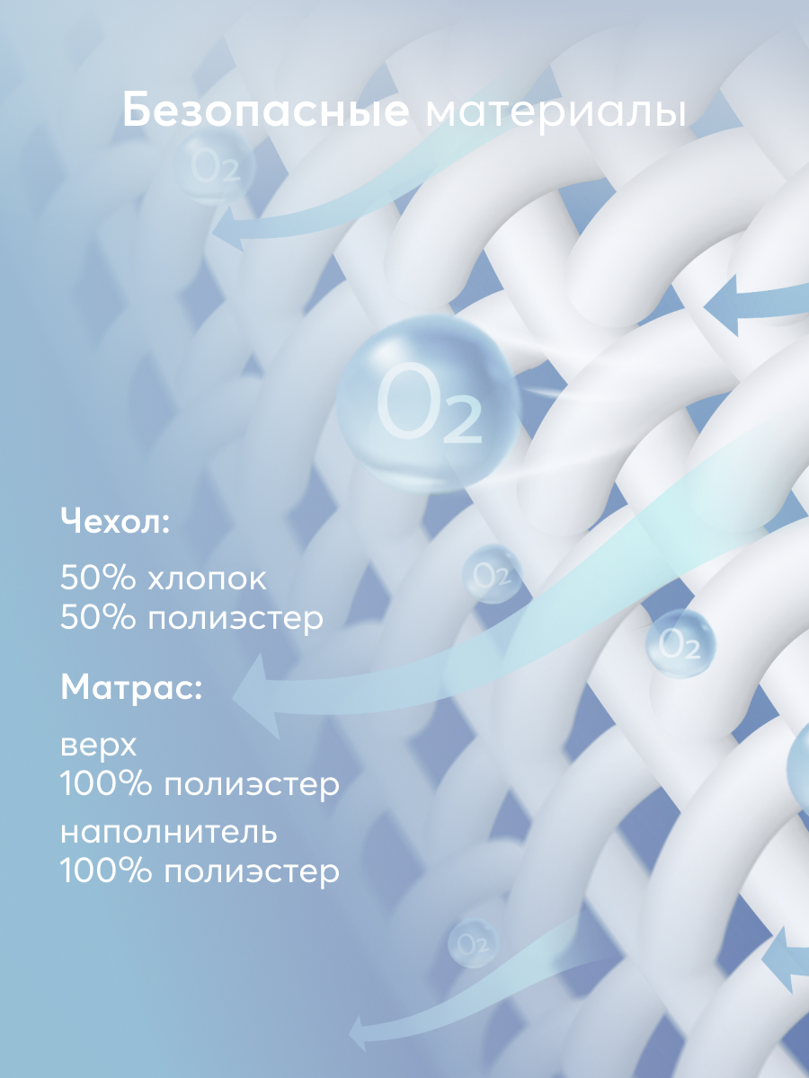 • Состав матрас: верх - 100% полиэстер, наполнитель - 100% полиэстер; чехол - 50% хлопок, 50% полиэстер.