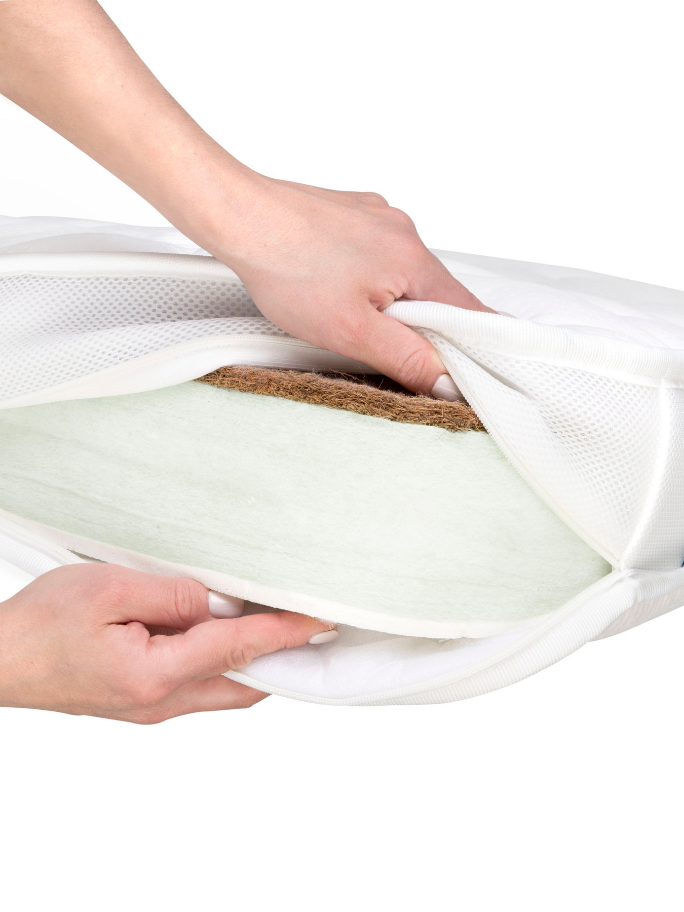 Модель предназначена для сна в разном возрасте. С одной стороны слой натуральной латексированной кокосовой койры 10мм, он обеспечивает максимальный ортопедический эффект, необходимый новорожденному (жесткость 5 из 5). С другой — латекс, природный эластичный материал, который подарит ребенку особый комфорт благодаря точечному распределению нагрузки. На этой стороне мы рекомендуем спать детям после года (слой 10 мм, жесткость 4 из 5).