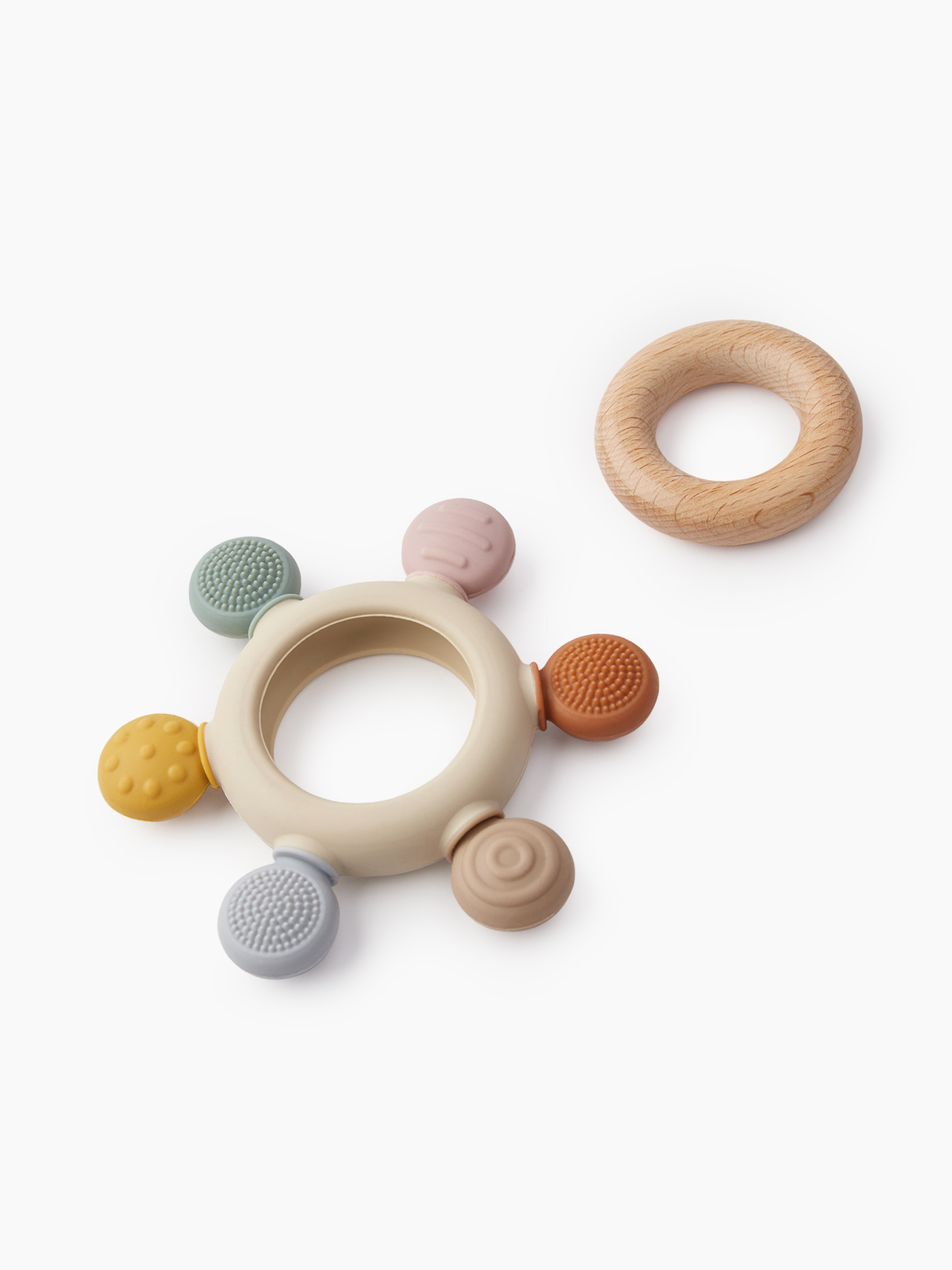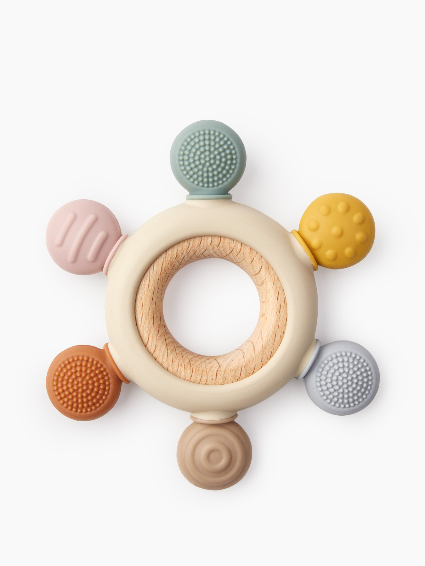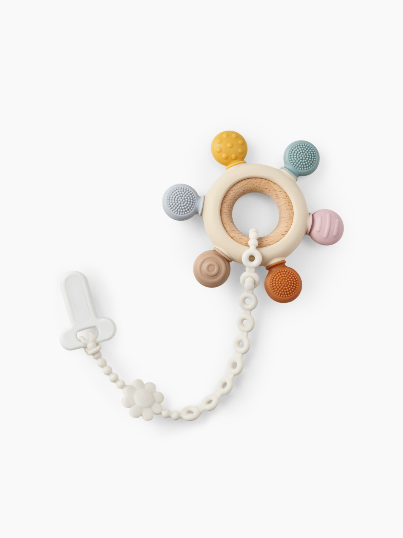 Прорезыватель необходим, чтобы облегчить малышу период появления первых зубов. Форму в виде кольца удобно держать в руках, а фактура натурального бука приятна на ощупь. Безопасную деревянную рукоятку тоже можно грызть, но силиконовые лепесточки понравятся малышу больше - они отличаются рельефом, чтобы ребёнок мог выбрать любимую поверхность, а также познавал тактильное разнообразие мира.