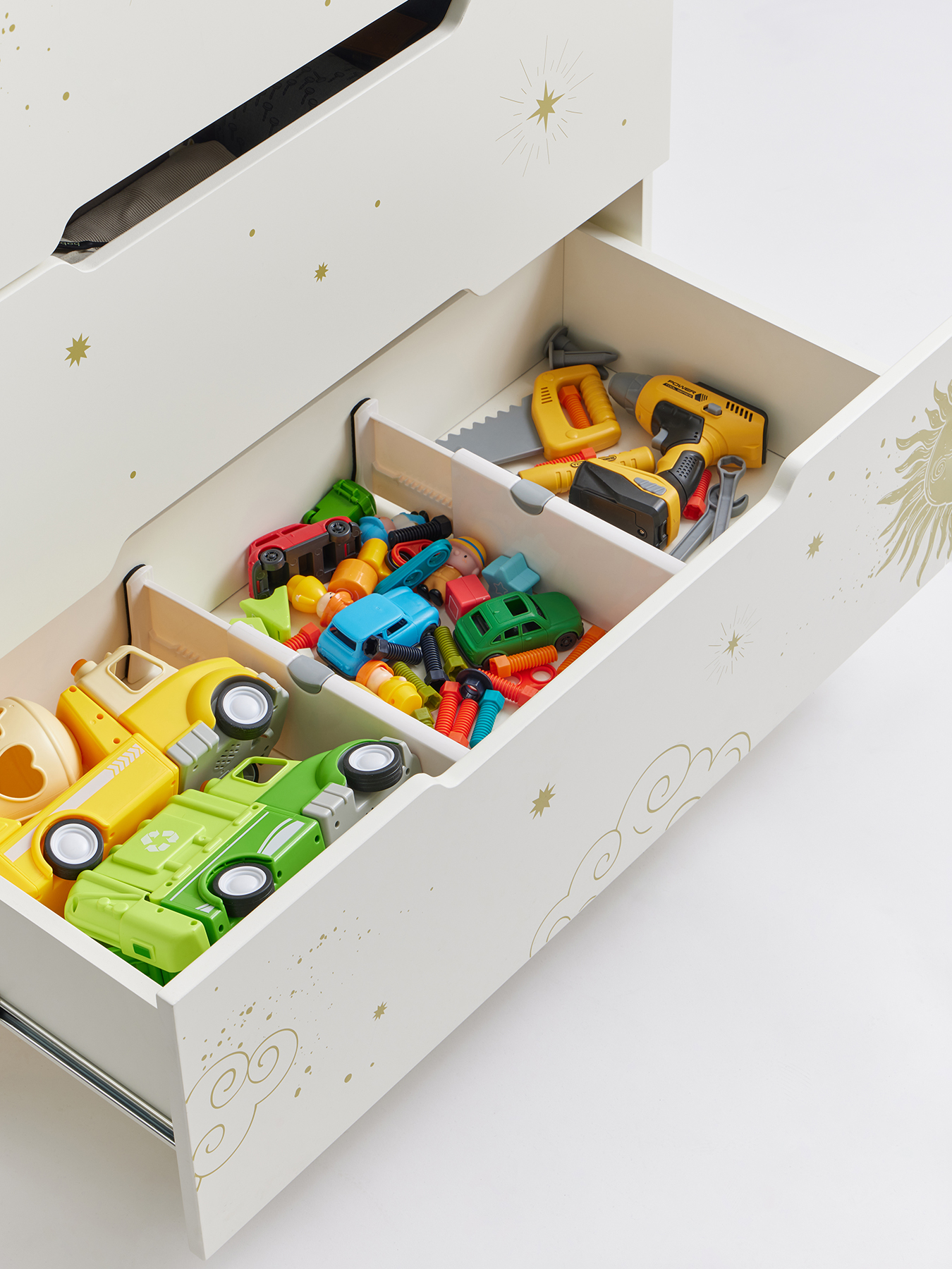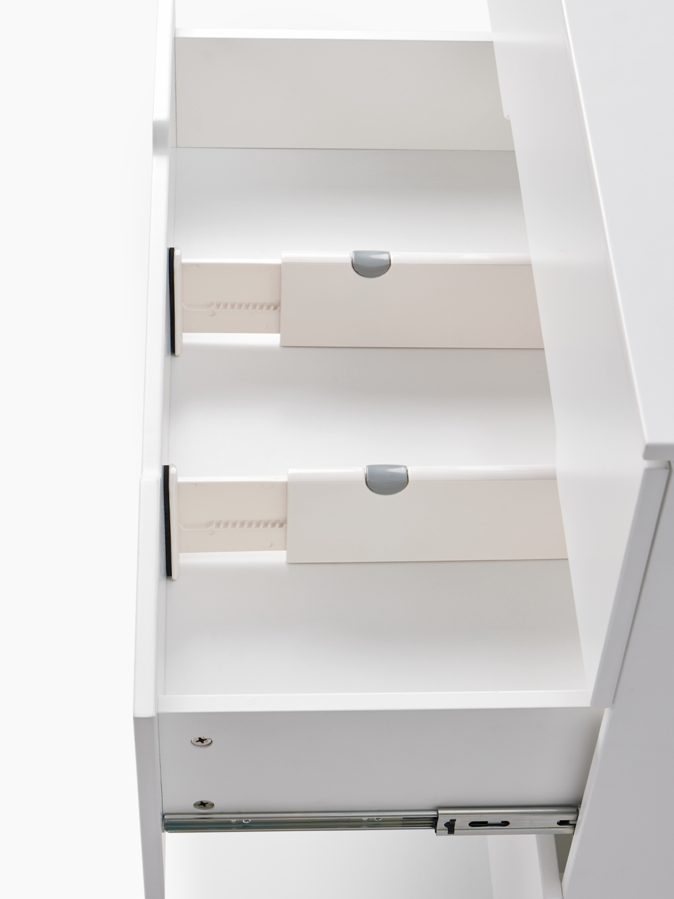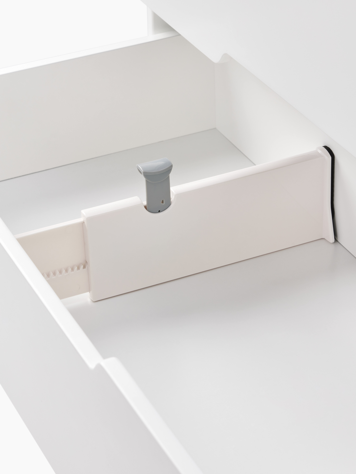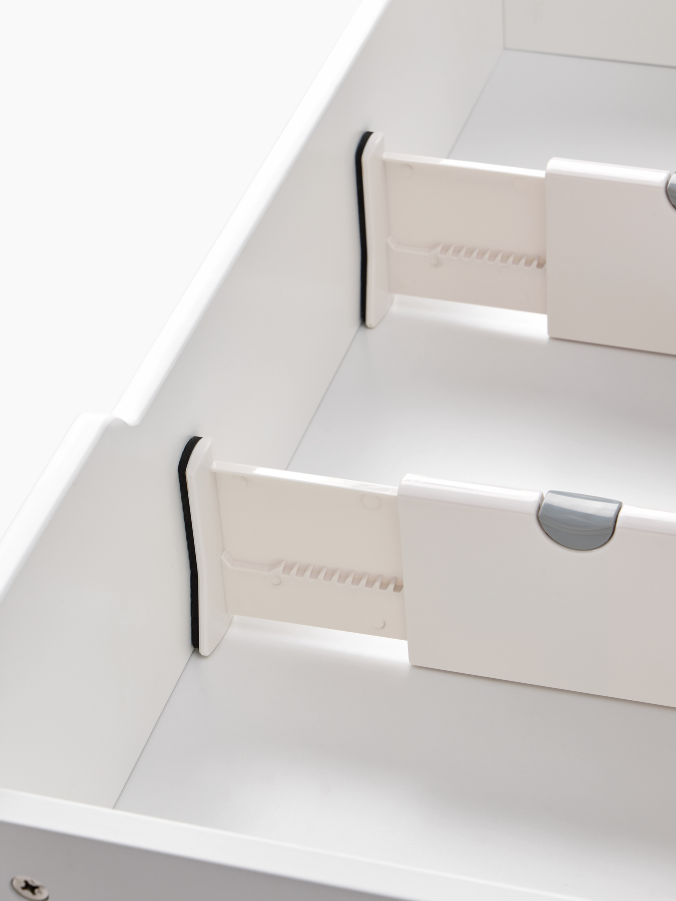 Комплект раздвижных разделителей для ящиков поможет организовать место для хранения как в детской, таки гардеробе. Для установки достаточно изменить длину по размеру ящика и зажать фиксатор. Боковые упоры с противоскользящей прокладкой прочно удержат разделители без повреждения мебели.