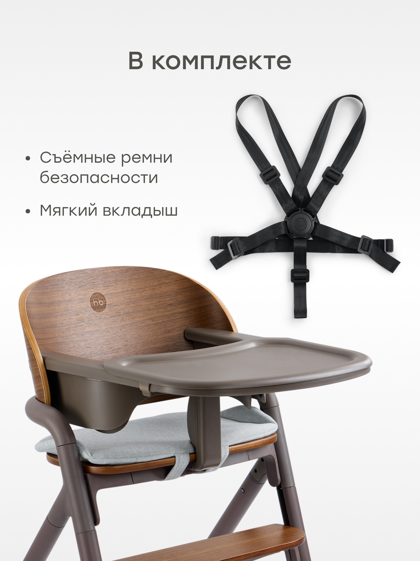 • Съемный разделитель для ног с 5-ти точечными ремнями – надежно фиксируют ребенка в стульчике, гарантируя безопасность