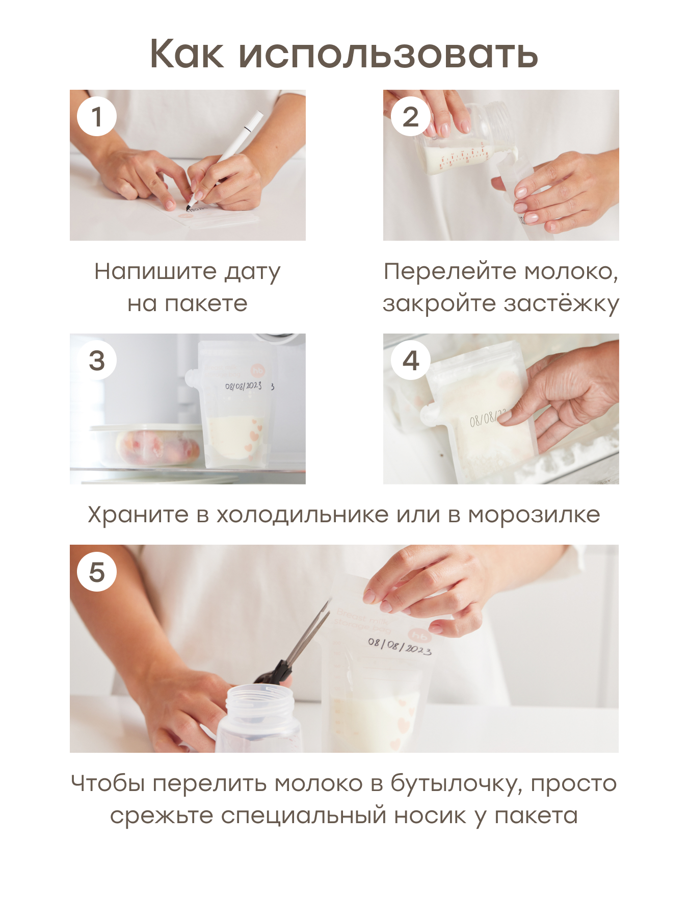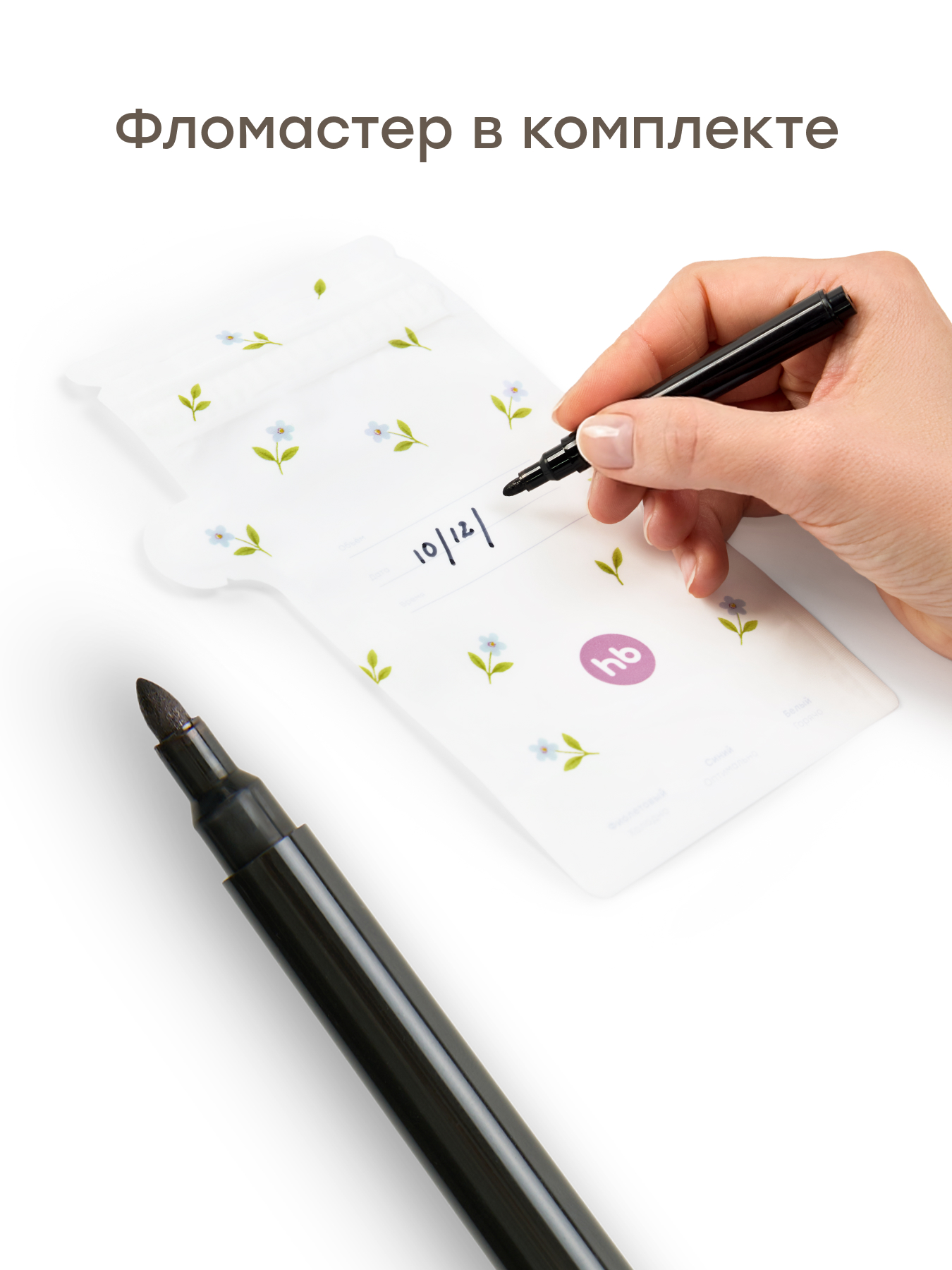• Поле для подписей + маркер в комплекте — для указания даты, времени сцеживания и других заметок