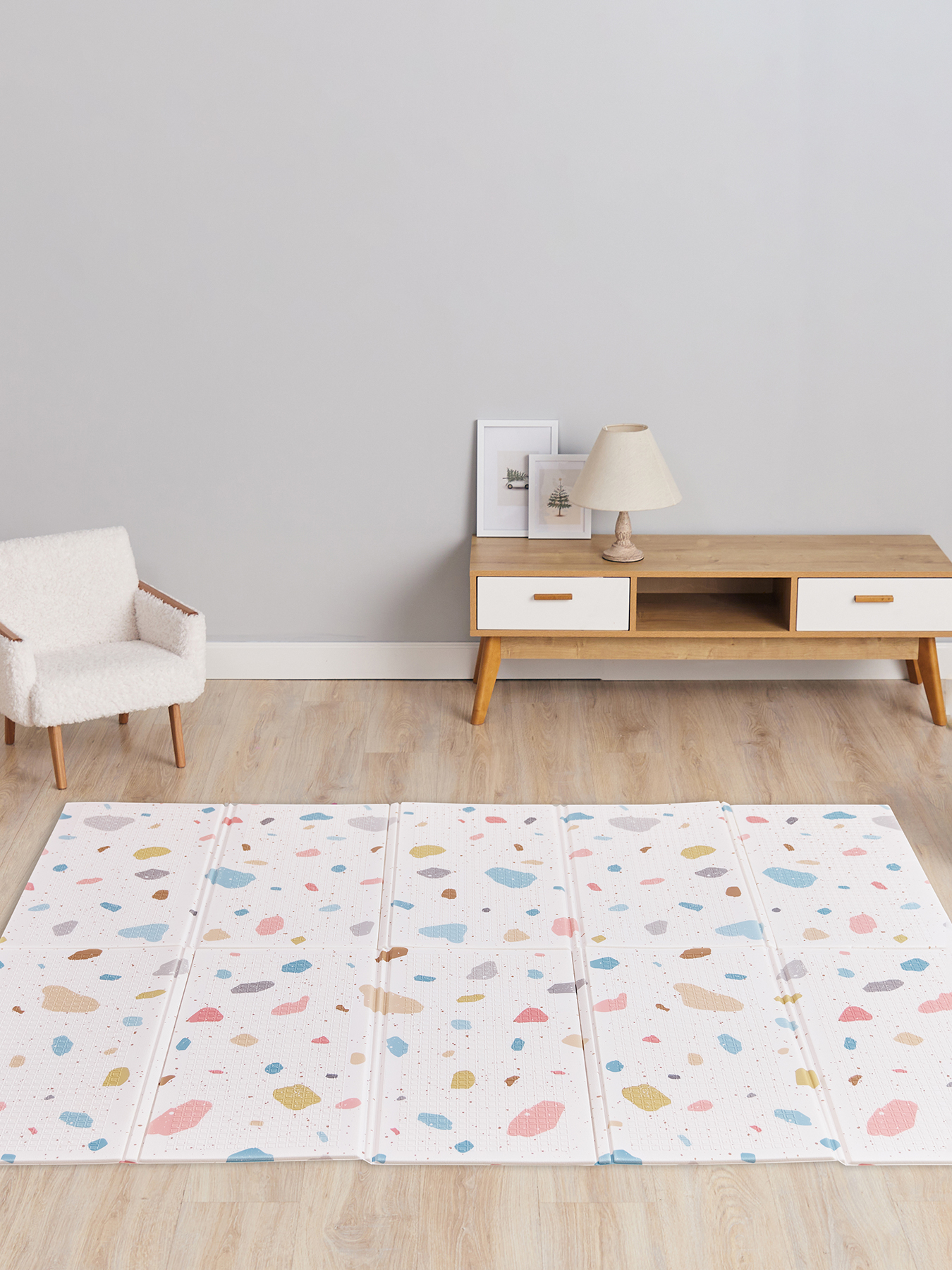 Складной коврик SOFT FLOOR подходит для малышей с первых месяцев жизни. Складывается гармошкой и экономит место в квартире. Коврик можно разложить не полностью – в зависимости от доступной вам площади. Сделан из плотного непромокаемого материала, который легко моется. Рельефная поверхность обладает массажным эффектом, развивает тактильное восприятие. Спокойные цвета не перегружают нервную систему малыша.