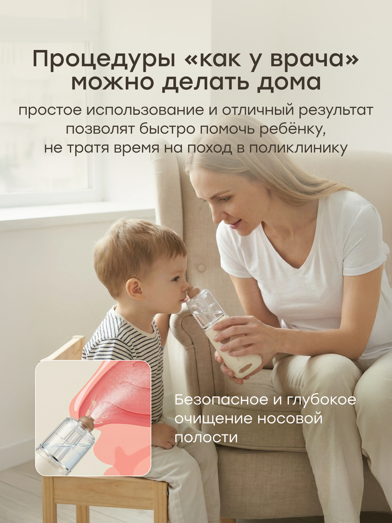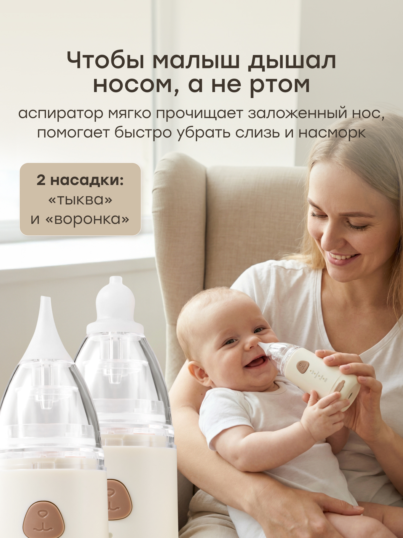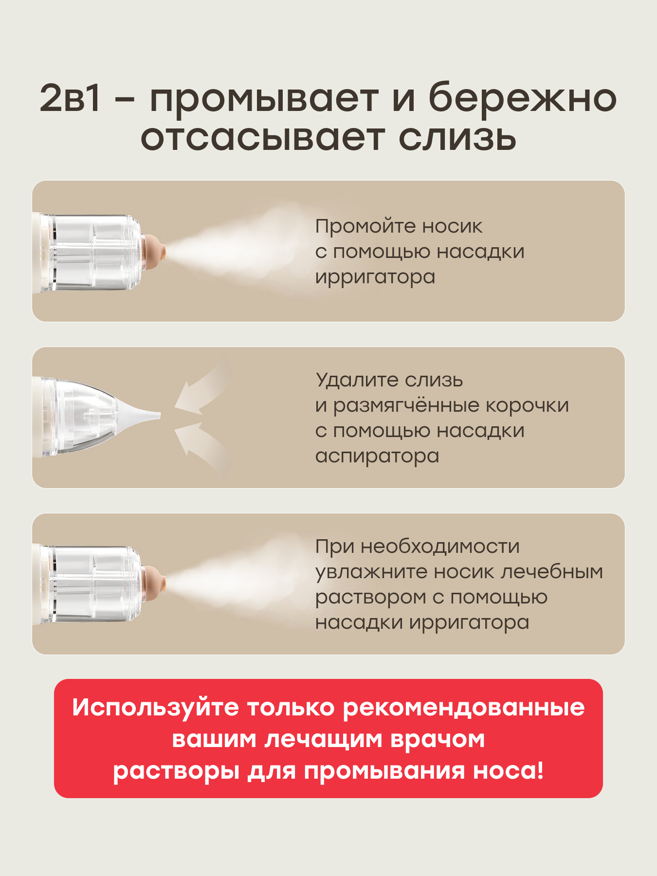 • 2 в 1 — электрический аспиратор удаляет слизь, а ирригатор промывает и увлажняет носовую полость.