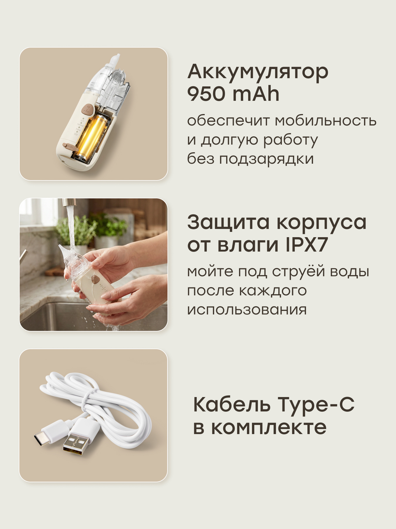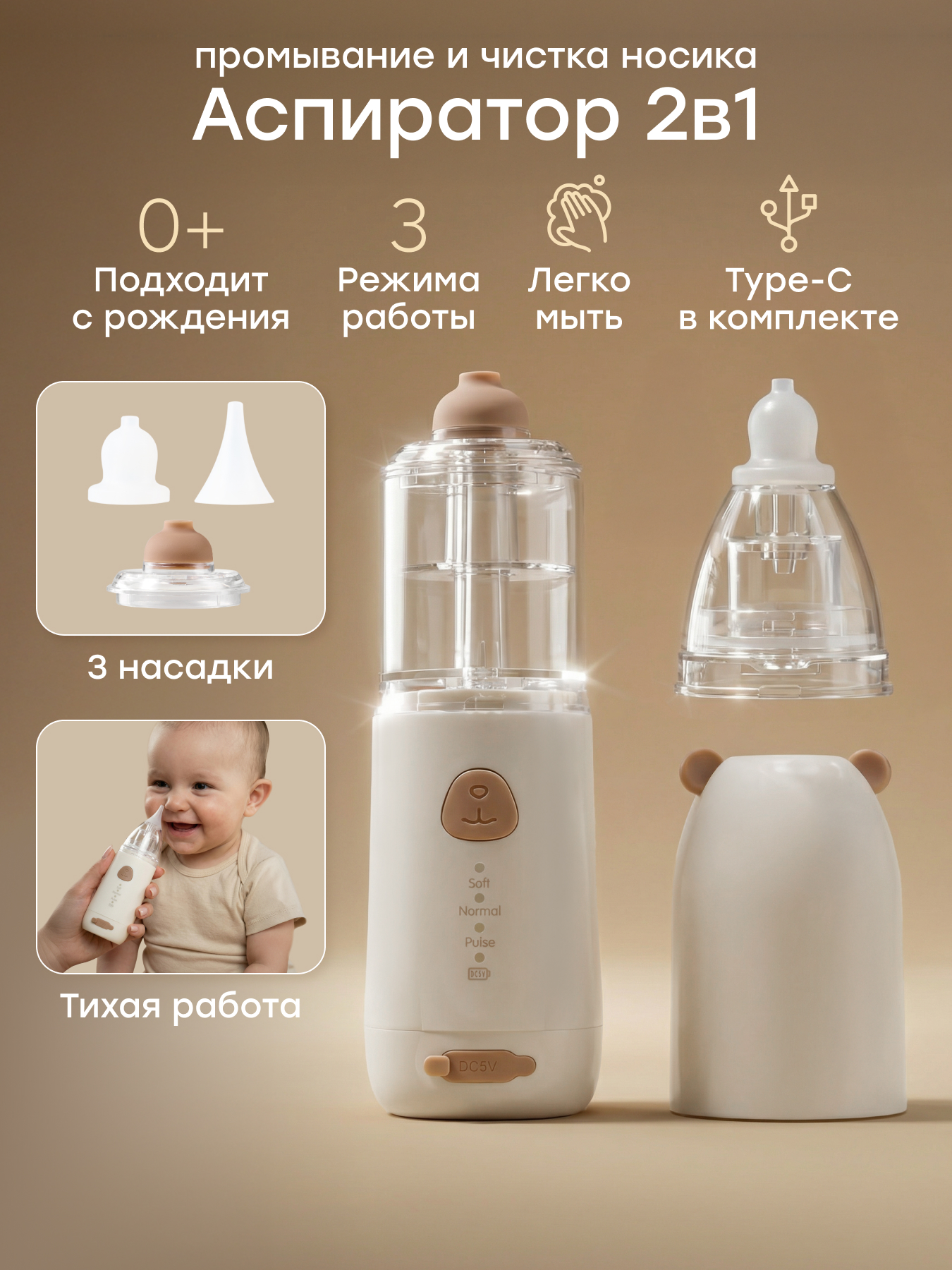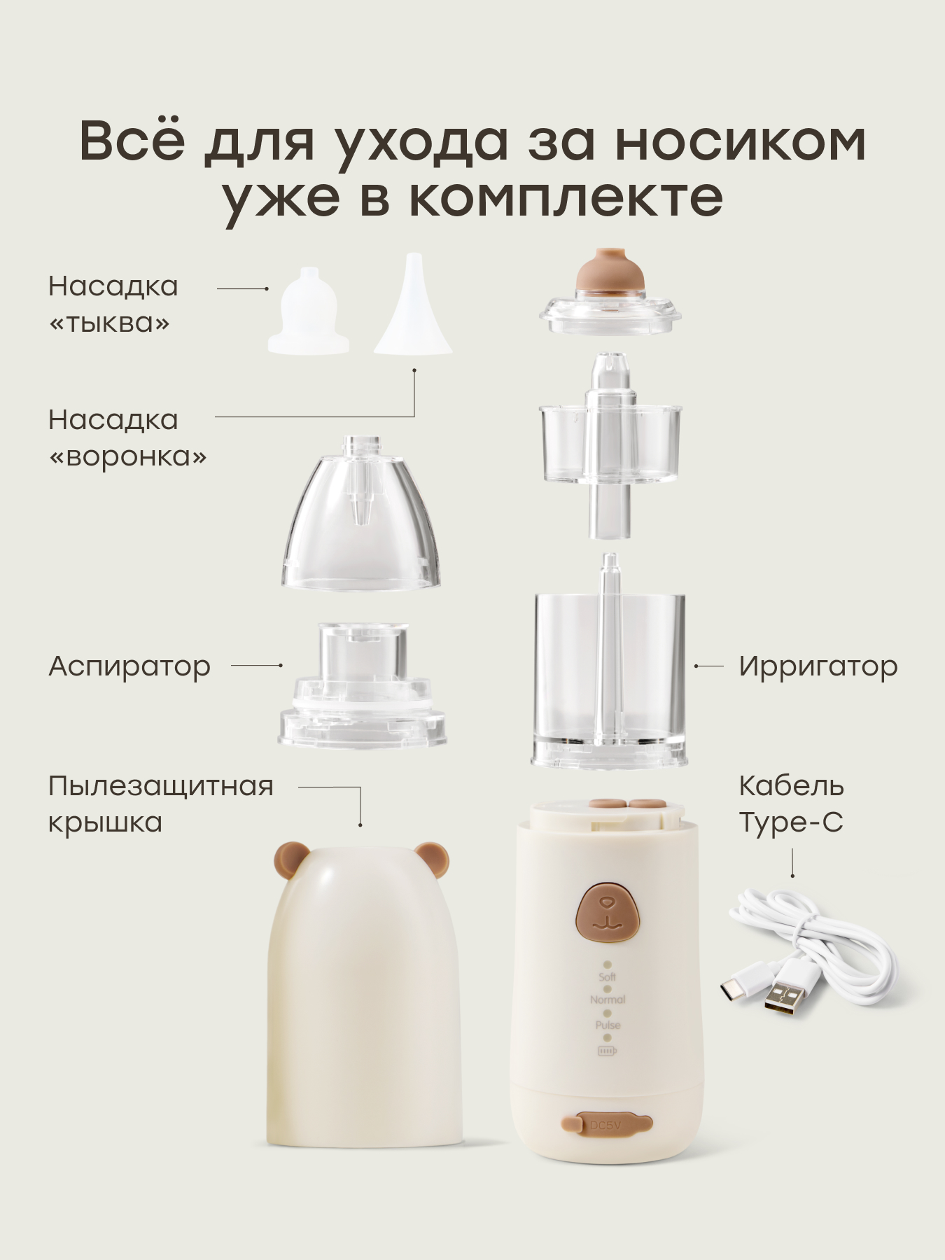 • Полная комплектация — 3 мягкие силиконовые насадки («тыква», «воронка» и аспиратор) и кабель зарядка Type-C кабель в комплекте.