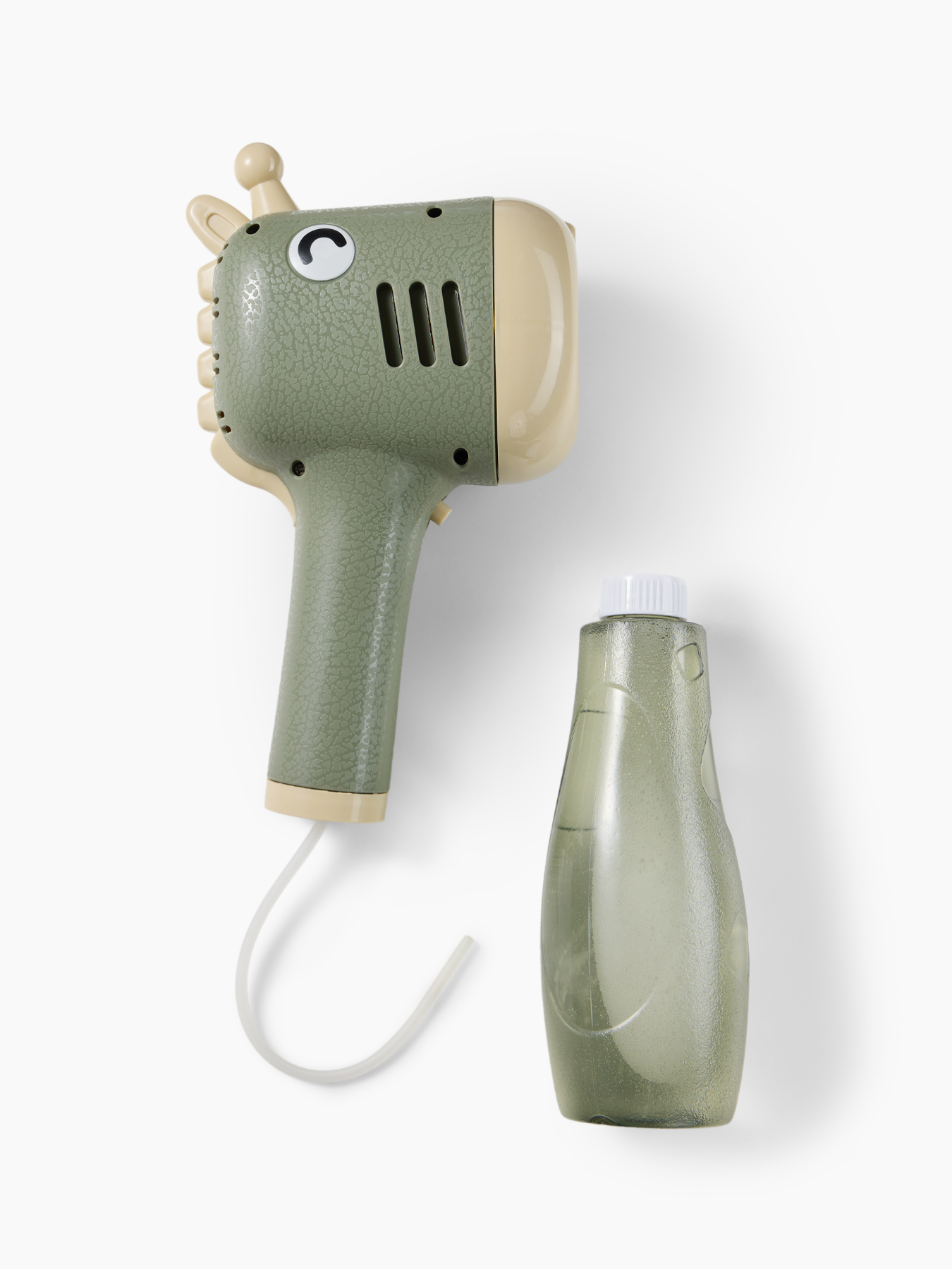 Бластер для мыльных пузырей прост в использовании: жидкость находится в герметичной баночке, поэтому раствор не проливается во время работы.