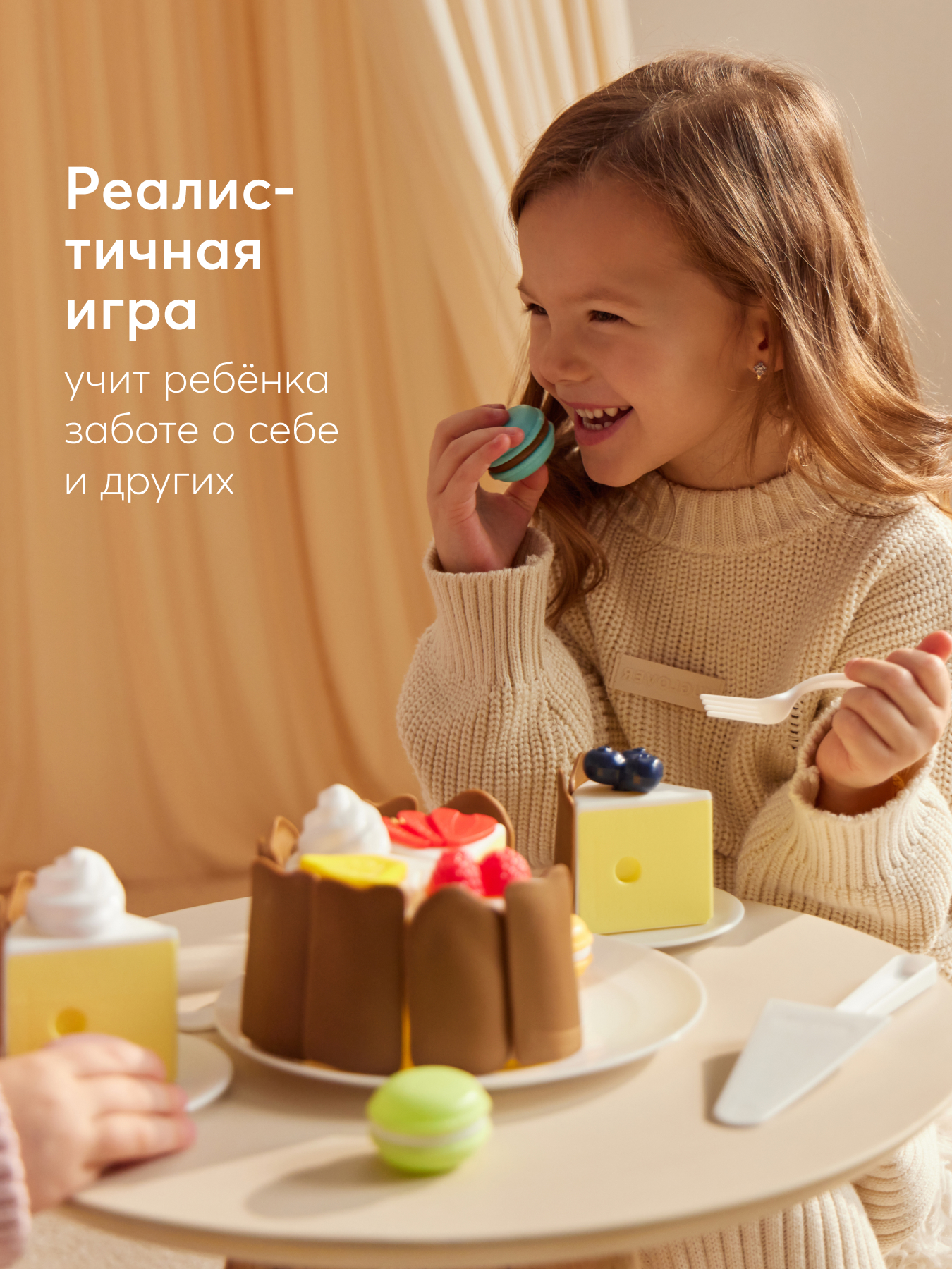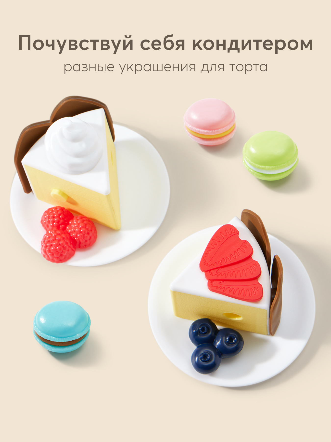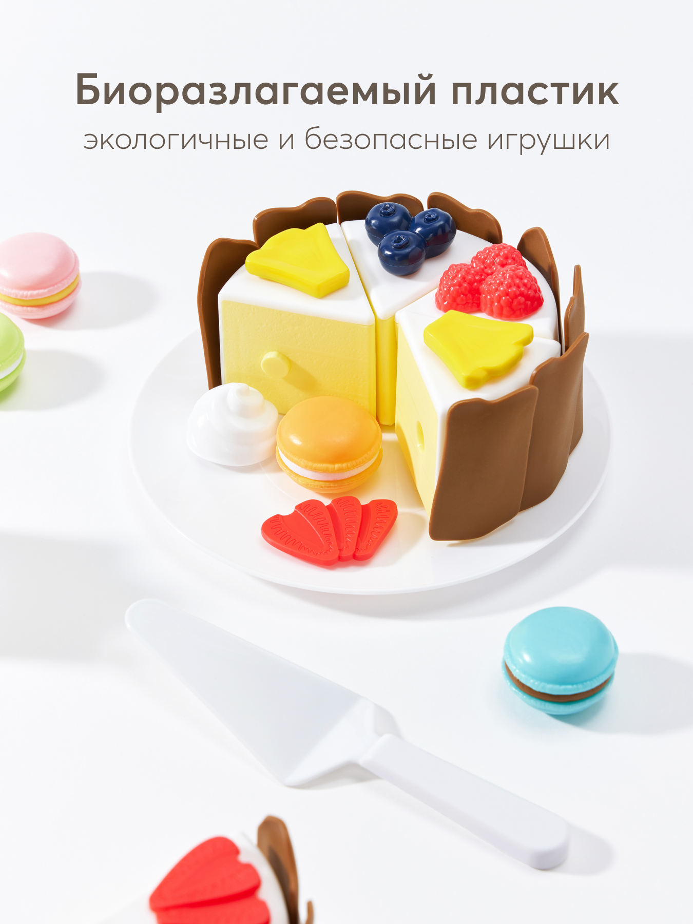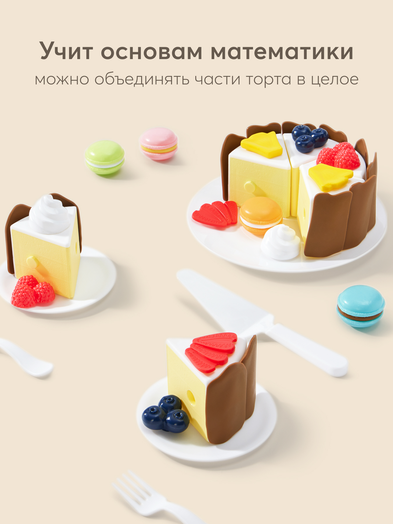 • Конструкция - каждый кусочек торта снабжен замочками для легкого объединения частей в единую композицию. Это не только удобно для игры, но и помогает развивать мелкую моторику рук