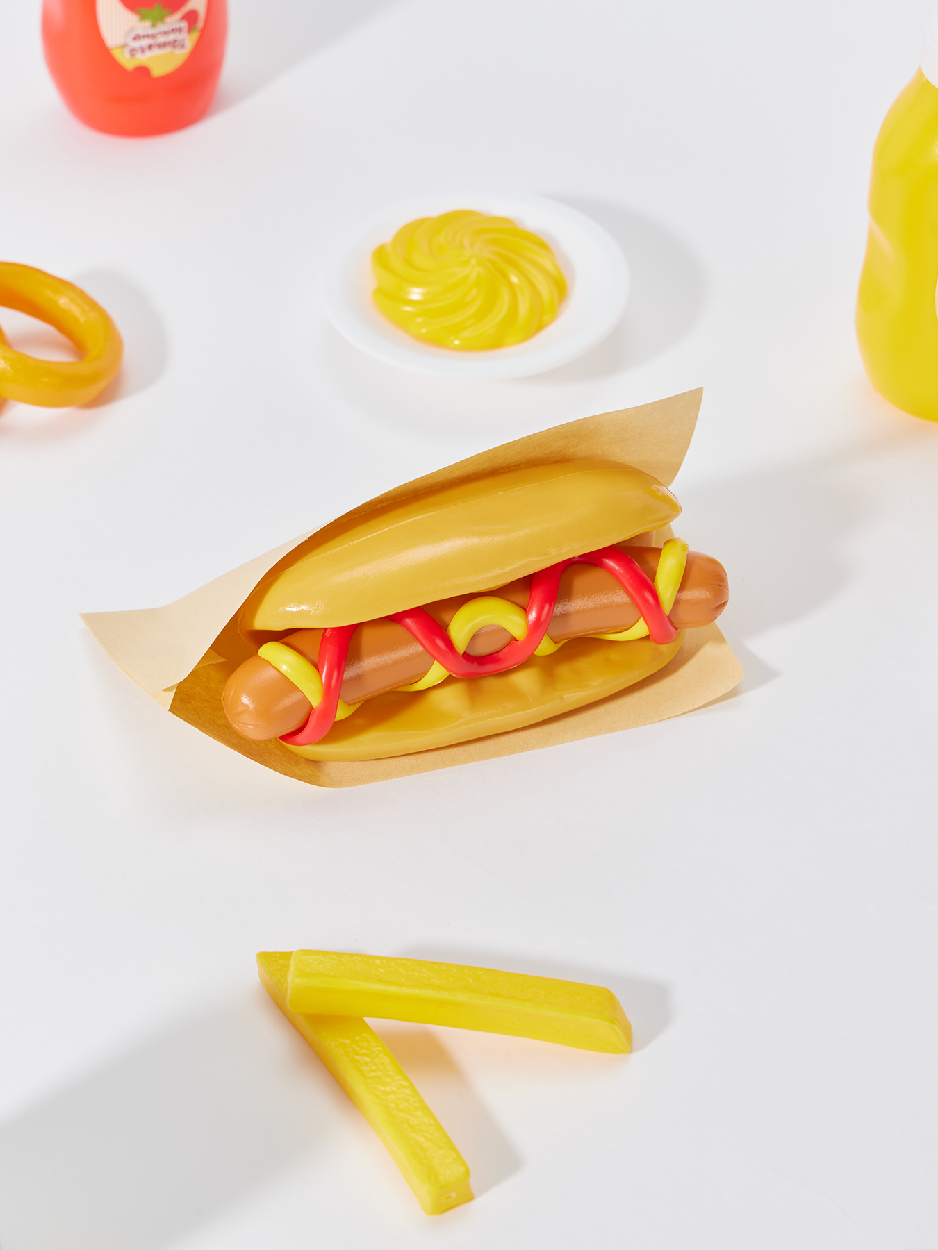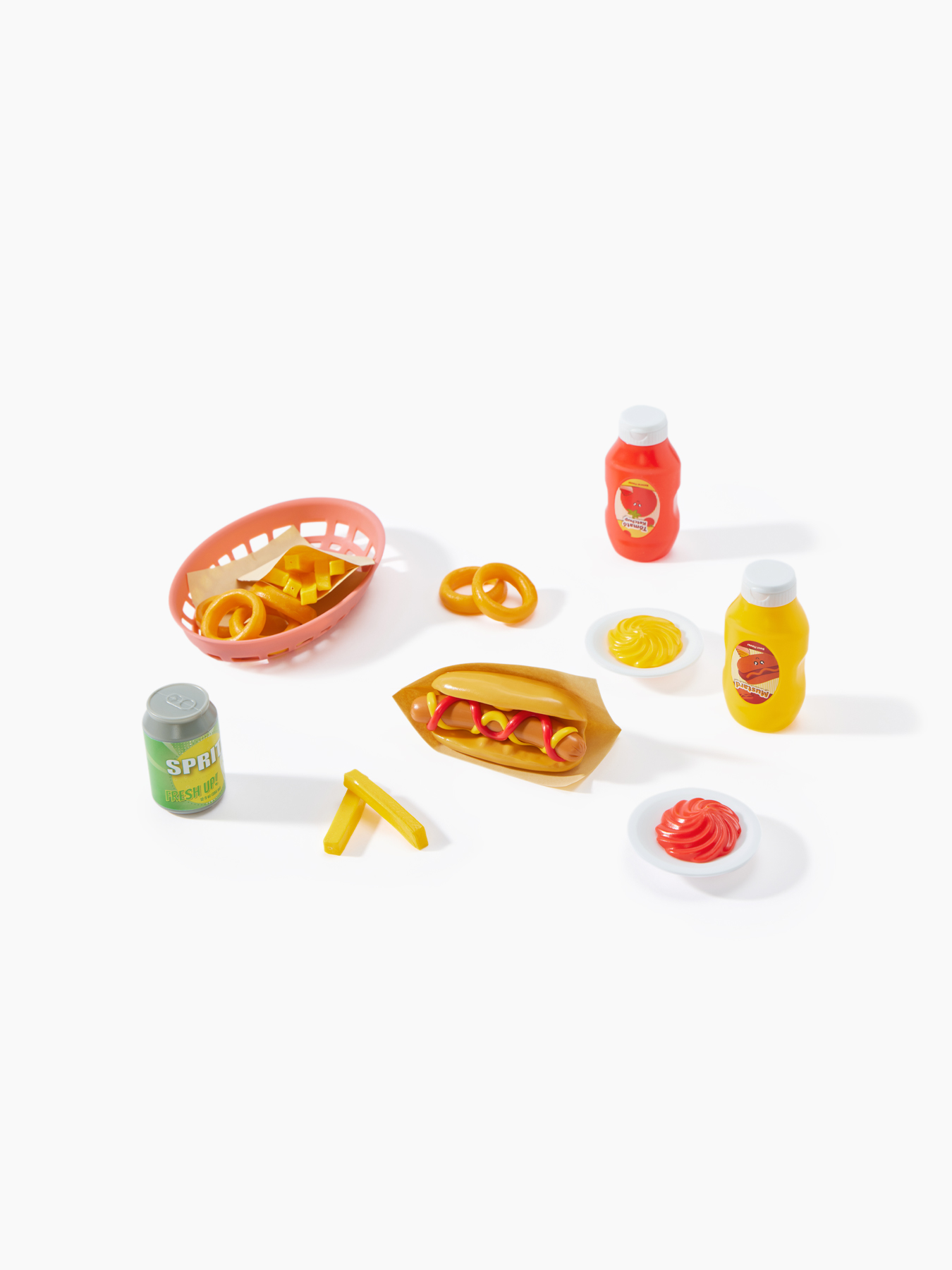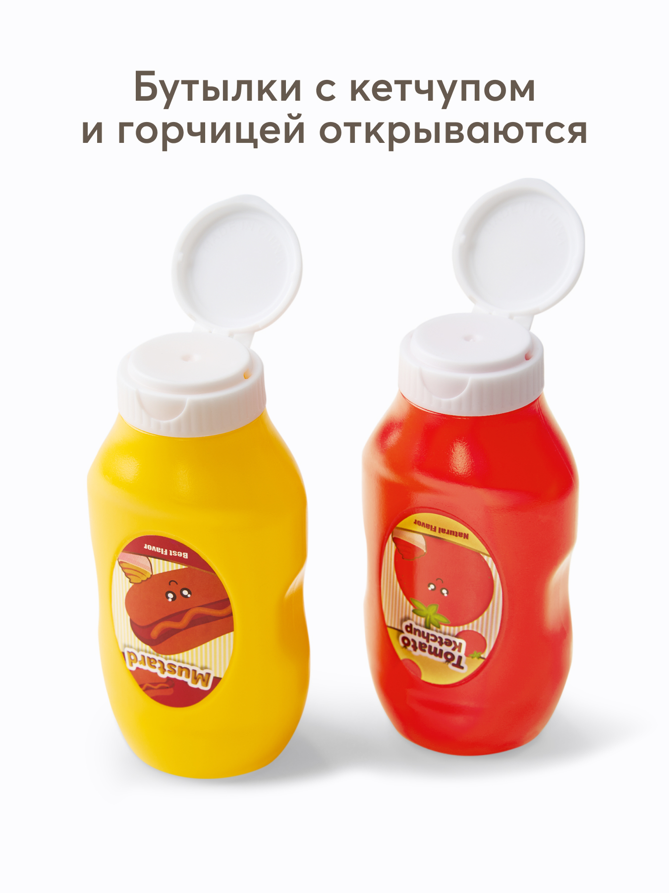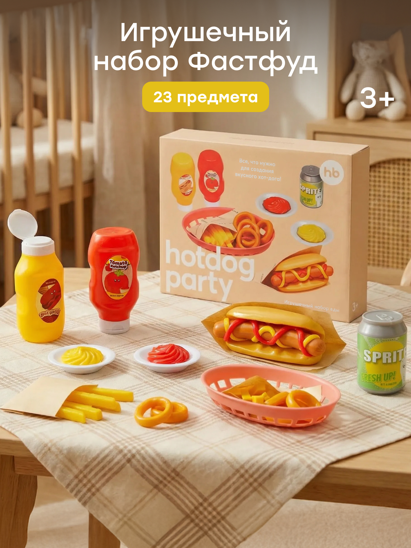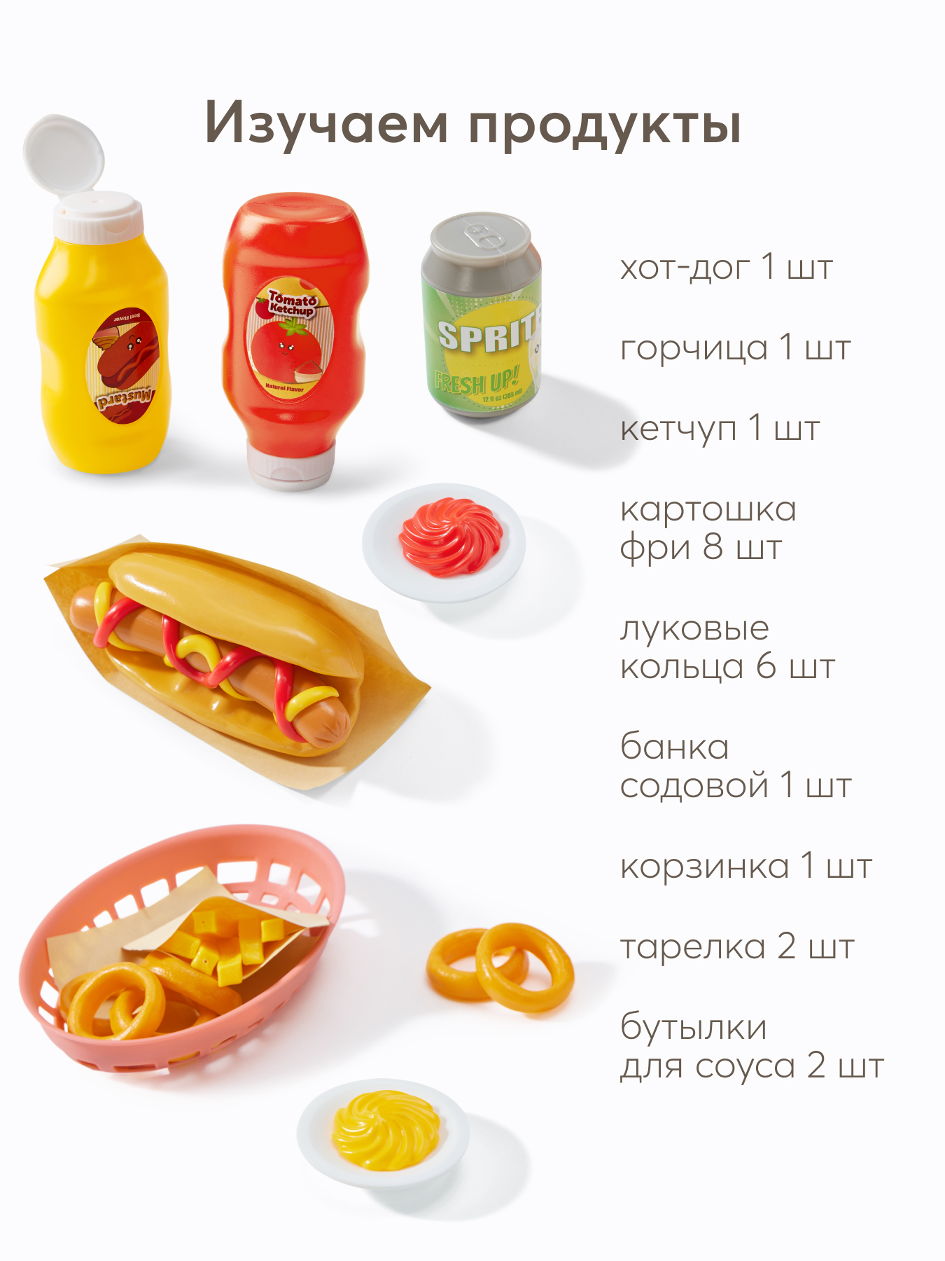 Игрушечный набор продуктов HOTDOG PARTY от Happy Baby— это идеальный способ подарить вашему ребенку незабываемые моменты увлекательной игры. Этот набор станет настоящим украшением детской кухни, открывая безграничные возможности для сюжетно-ролевых игр, которые способствуют развитию воображения и социальных навыков. Он прекрасно подойдет как для девочек, так и для мальчиков от 3 лет. Набор включает в себя мини-продукты и посуду, которые идеально имитируют настоящие: хот-дог, горчица, кетчуп, картошка фри, луковые кольца, банка содовой, корзинка, тарелки и бутылки для соуса. Ваша малышка сможет устроить настоящий фастфуд-бар для своих кукол, учась при этом готовить и сервировать стол. Игрушечные продукты позволяют не только разыгрывать сцены из жизни, но и вовлекают малыша в игру «дочки-матери», развивая навыки заботы и ответственности.