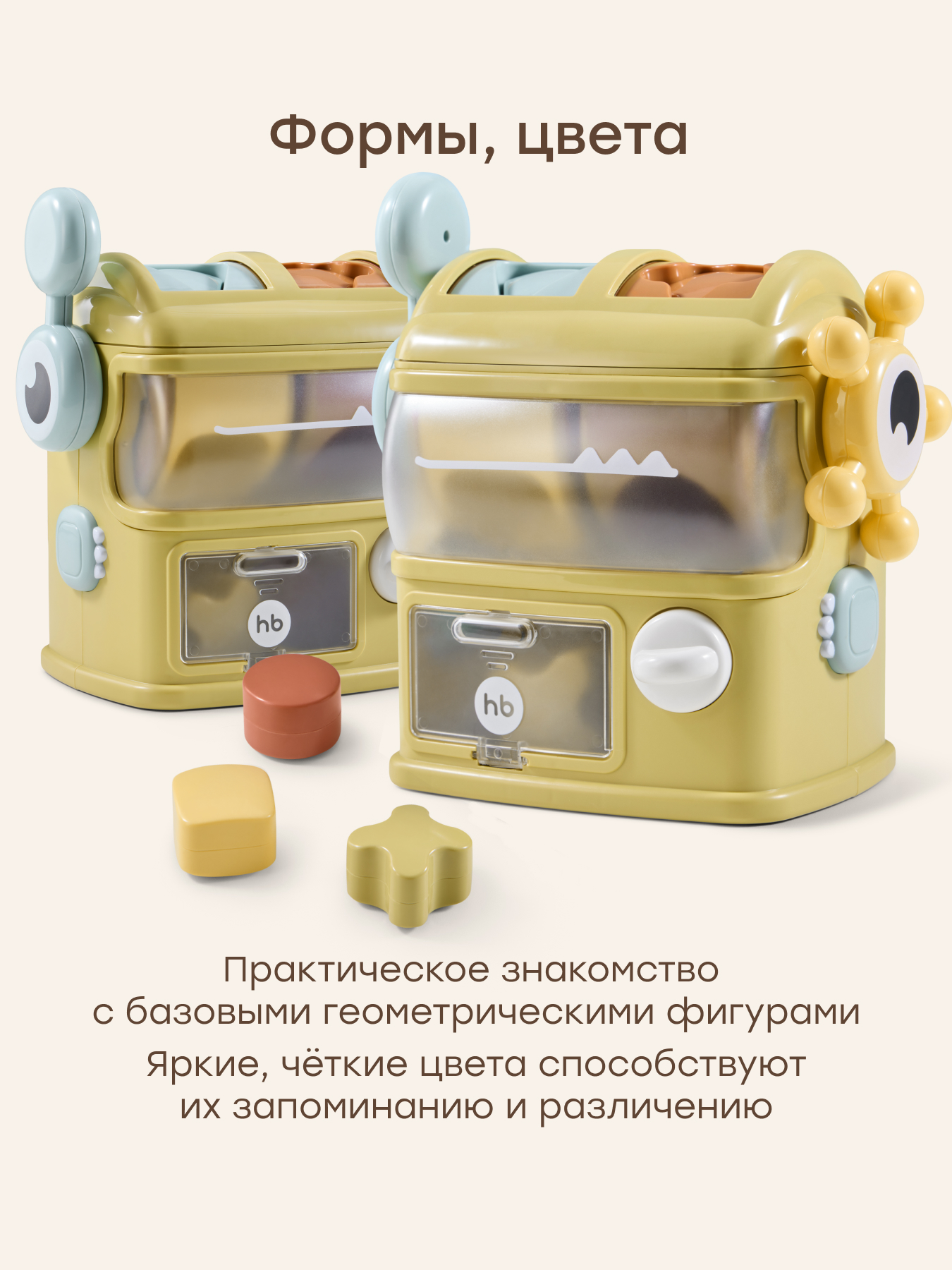 • Многофункциональность – ребенок учится распознавать геометрические формы и цвета, подбирая элементы к соответствующим отверстиям.