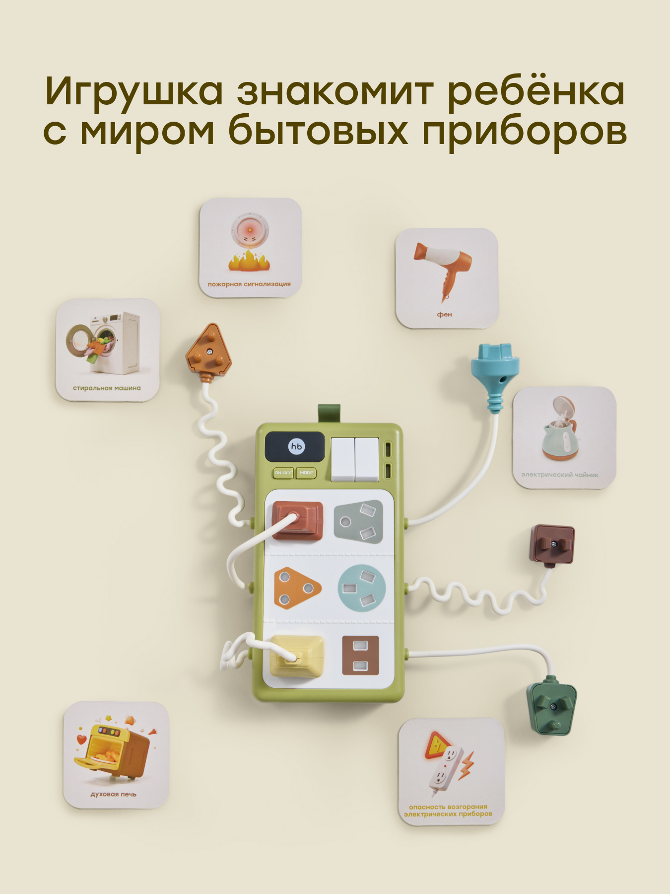 • Звуковые эффекты — каждая розетка издаёт звук и мелодии, помогая развивать ассоциативное мышление. В комплект игрового набора входит  6 тематических карточек с изображениями бытовых приборов и их названиями, что способствует развитию ассоциативного мышления и речевых навыков.