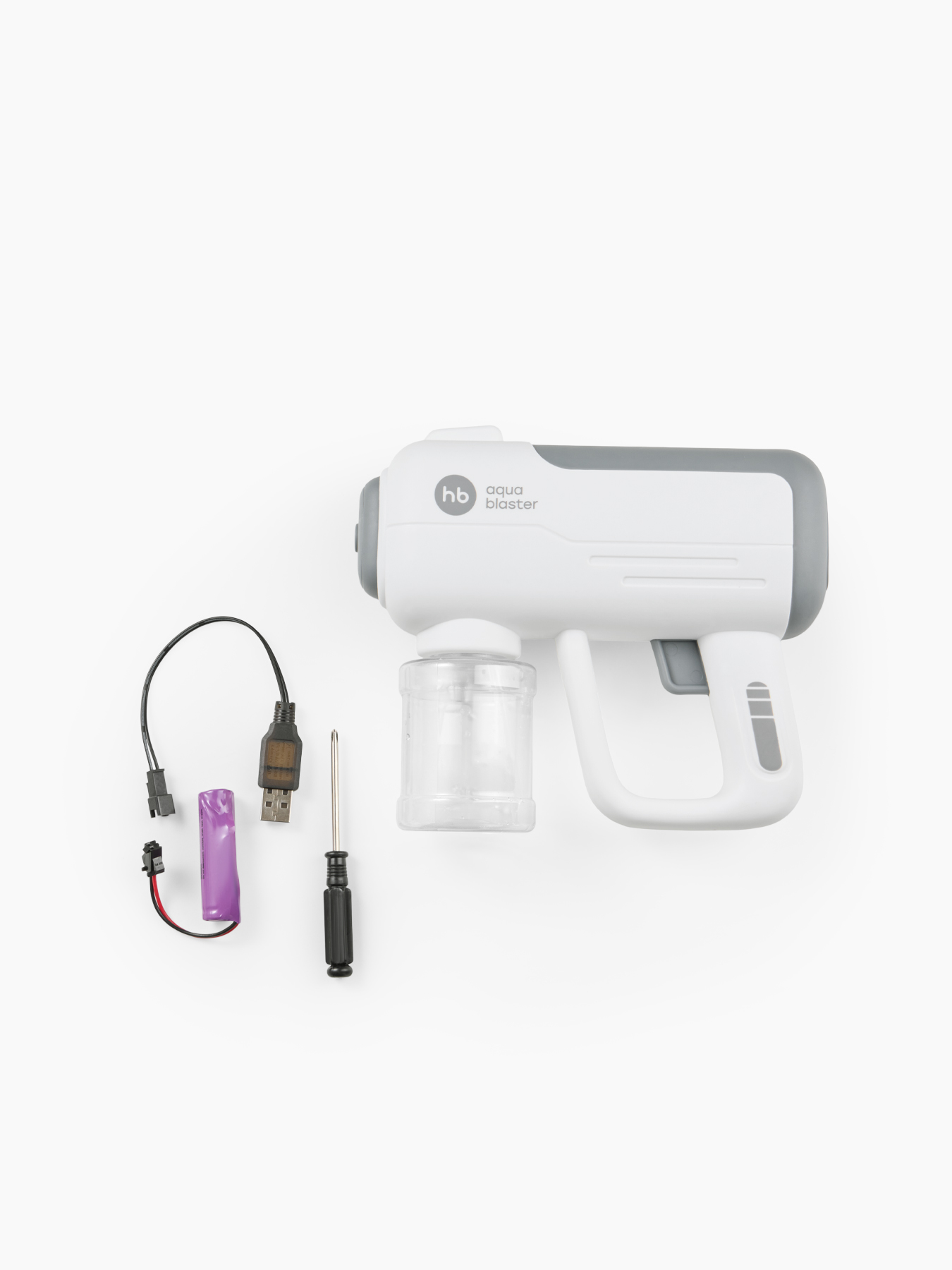 • Комплектация пистолет с емкостью для воды - 1 шт., аккумуляторная батарея - 1 шт., кабель для зарядки - 1 шт., отвёртка - 1 шт.