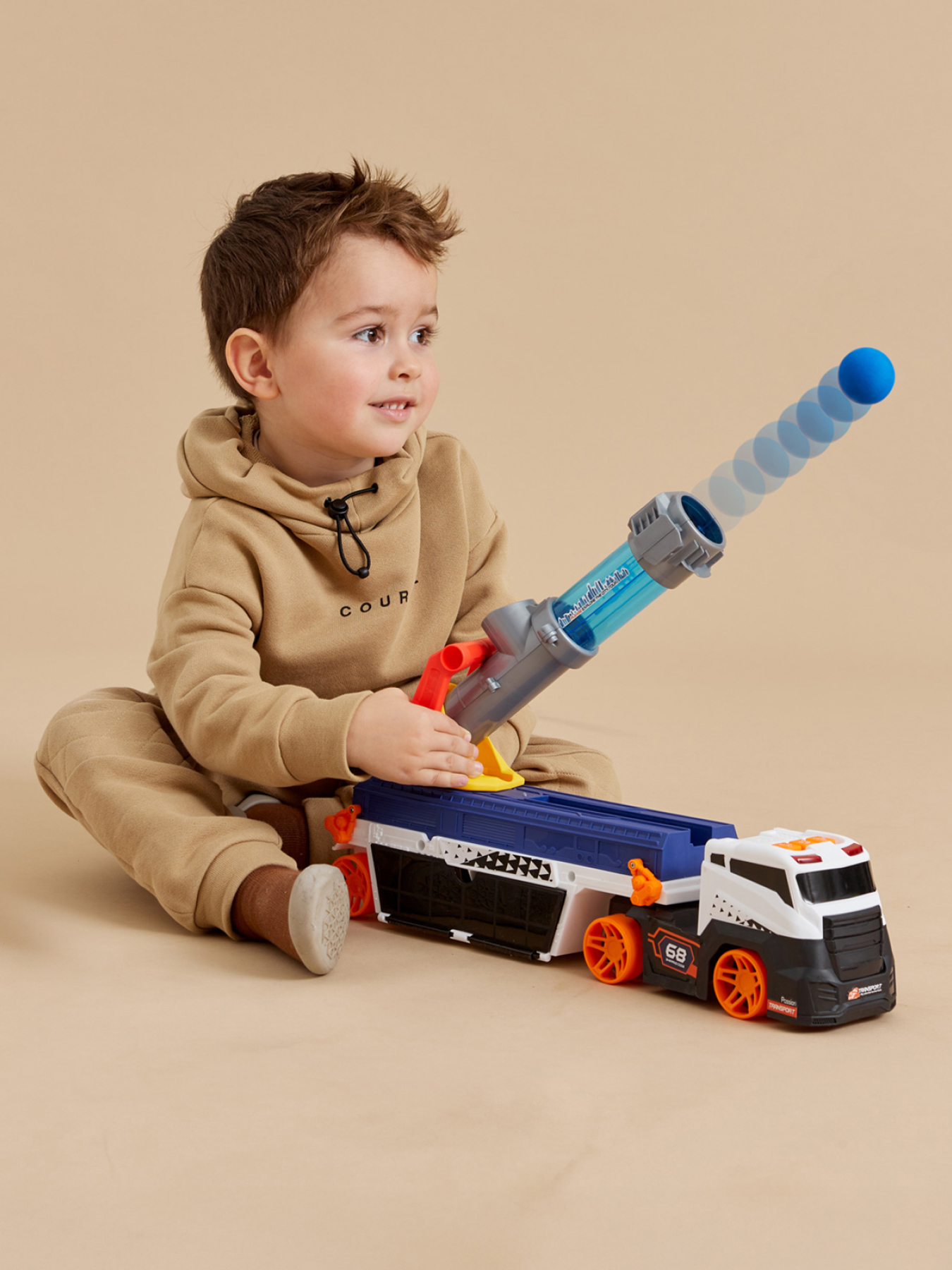 Лучше простой машинки может быть только автовоз. Игрушка с пушкой и машинкой CANNON TRUCK – мечта маленьких автолюбителей. У автовоза лёгкий ход, кабина поворачивается относительно кузова. Пушку, которая стреляет пластиковыми шариками, также можно повернуть. Игра с пушкой развивает мелкую моторику, ловкость и меткость. Кнопки на кабине включают звуковые и световые эффекты. Внутри спрятаны маленькая машинка.