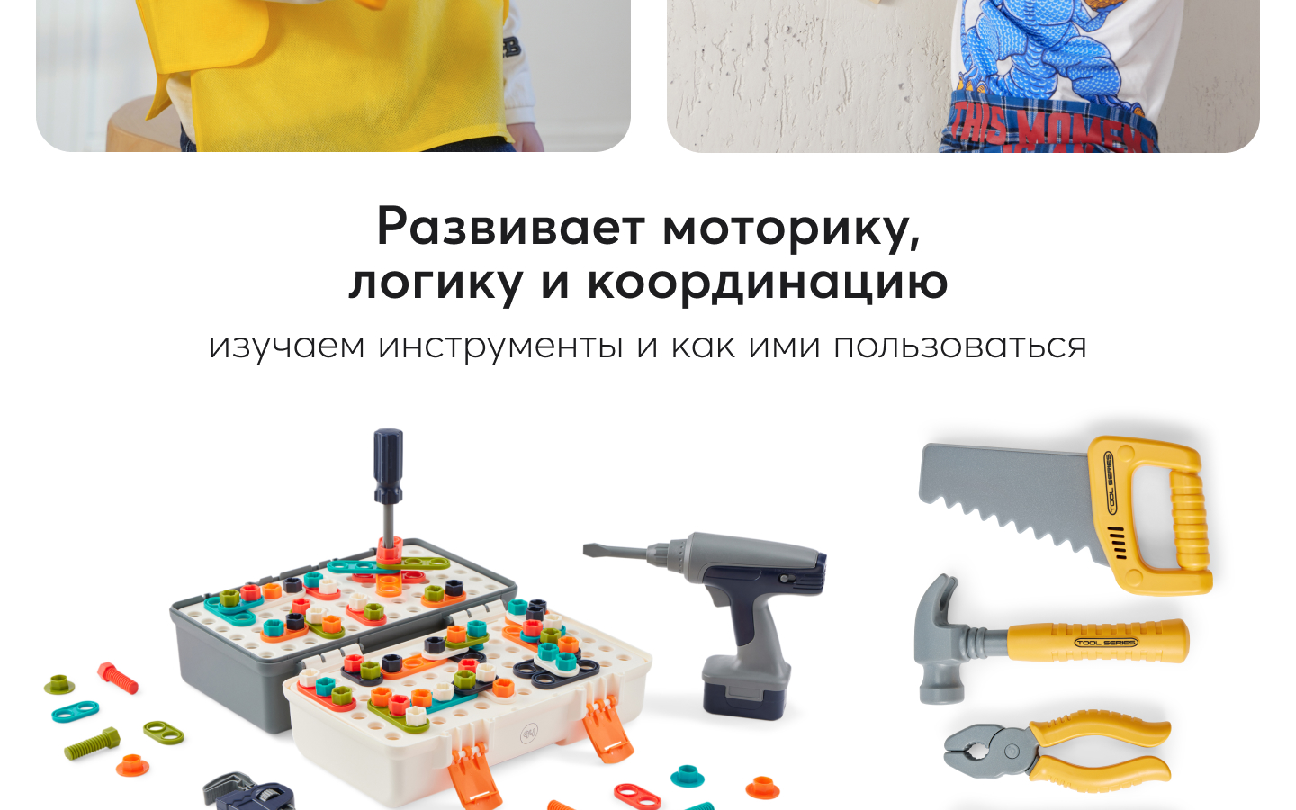 Каждый элемент набора создан с учетом безопасности. Играть можно долго, не беспокоясь о безопасности ребенка. Инструменты просты в использовании и подходят для маленьких ручек. Они могут стать основой для совместных семейный игр, где родители участвуют в процессе обучения.
