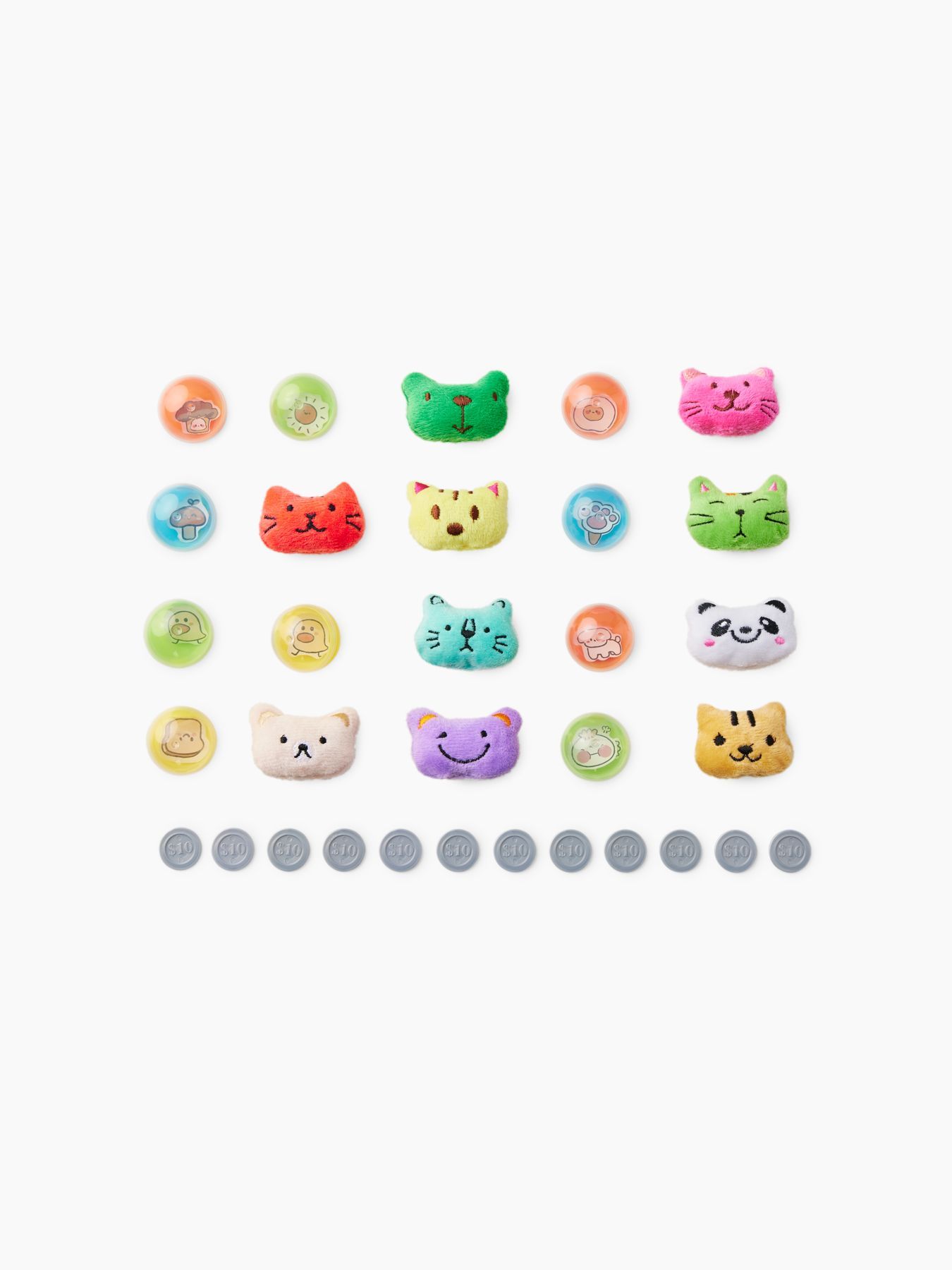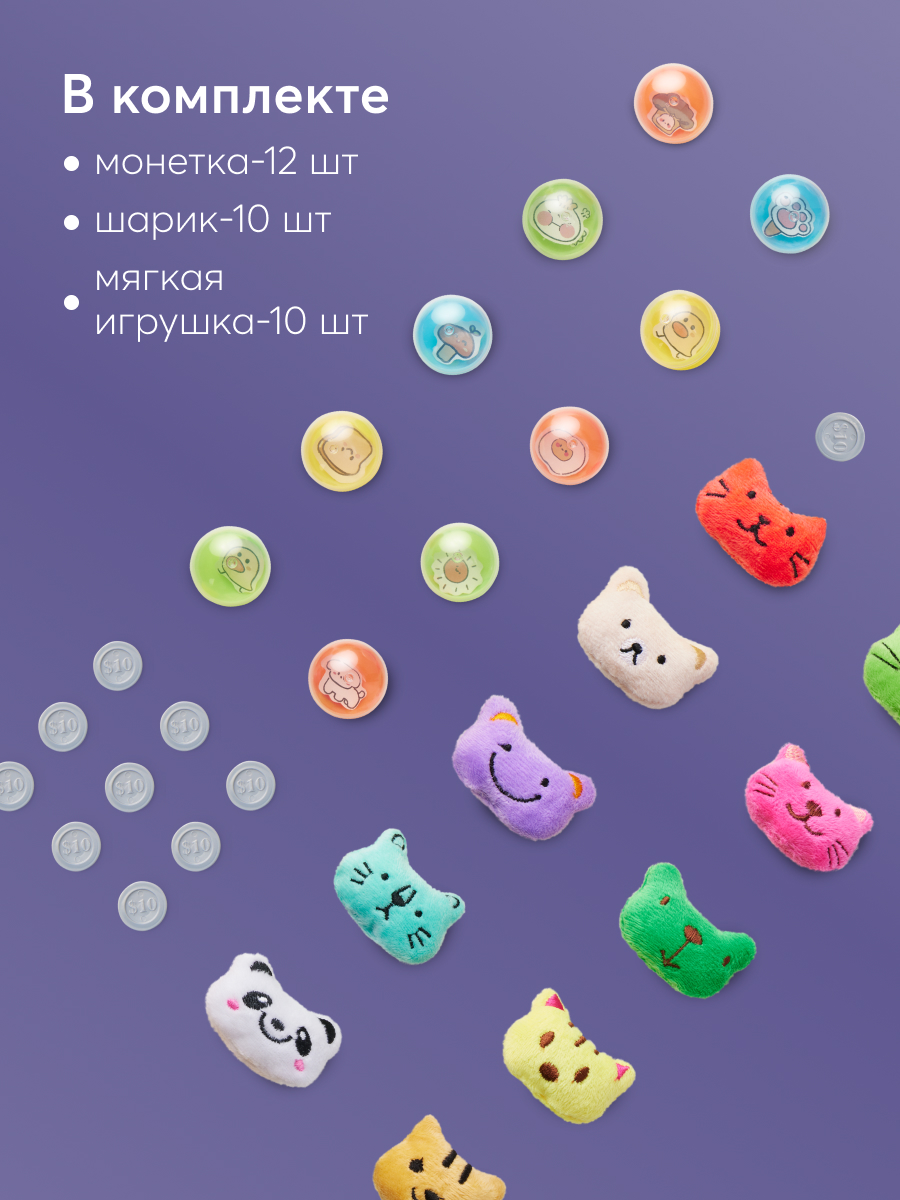 В комплекте грушка-хваталка 1 шт., шарик 10 шт., монетка 12 шт., мягкая игрушка 10 шт., кольцо 1 шт. Наклейки входят в комплект.