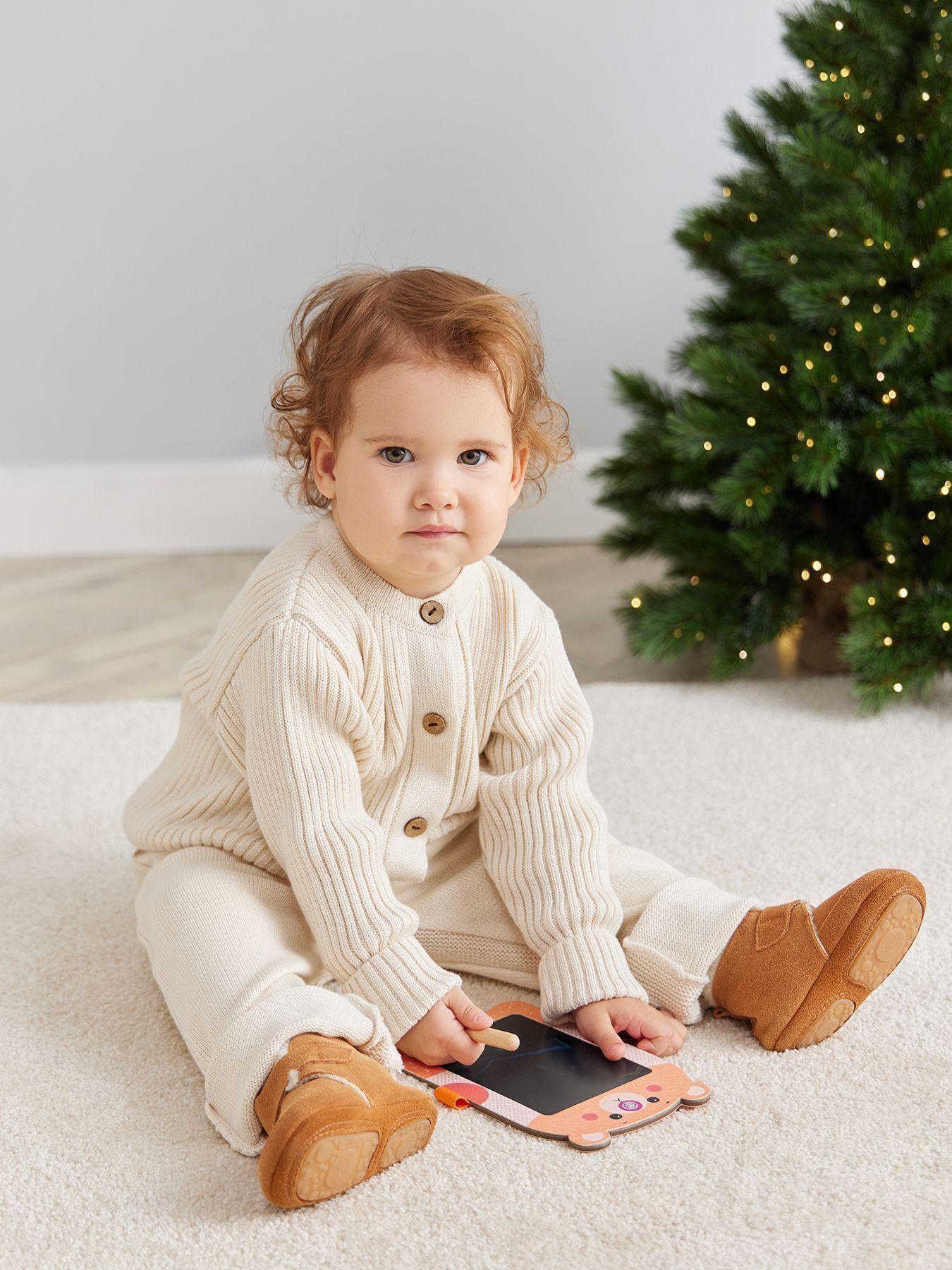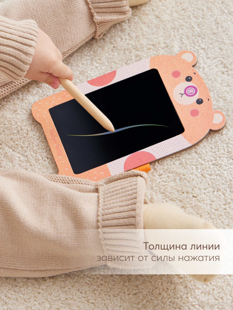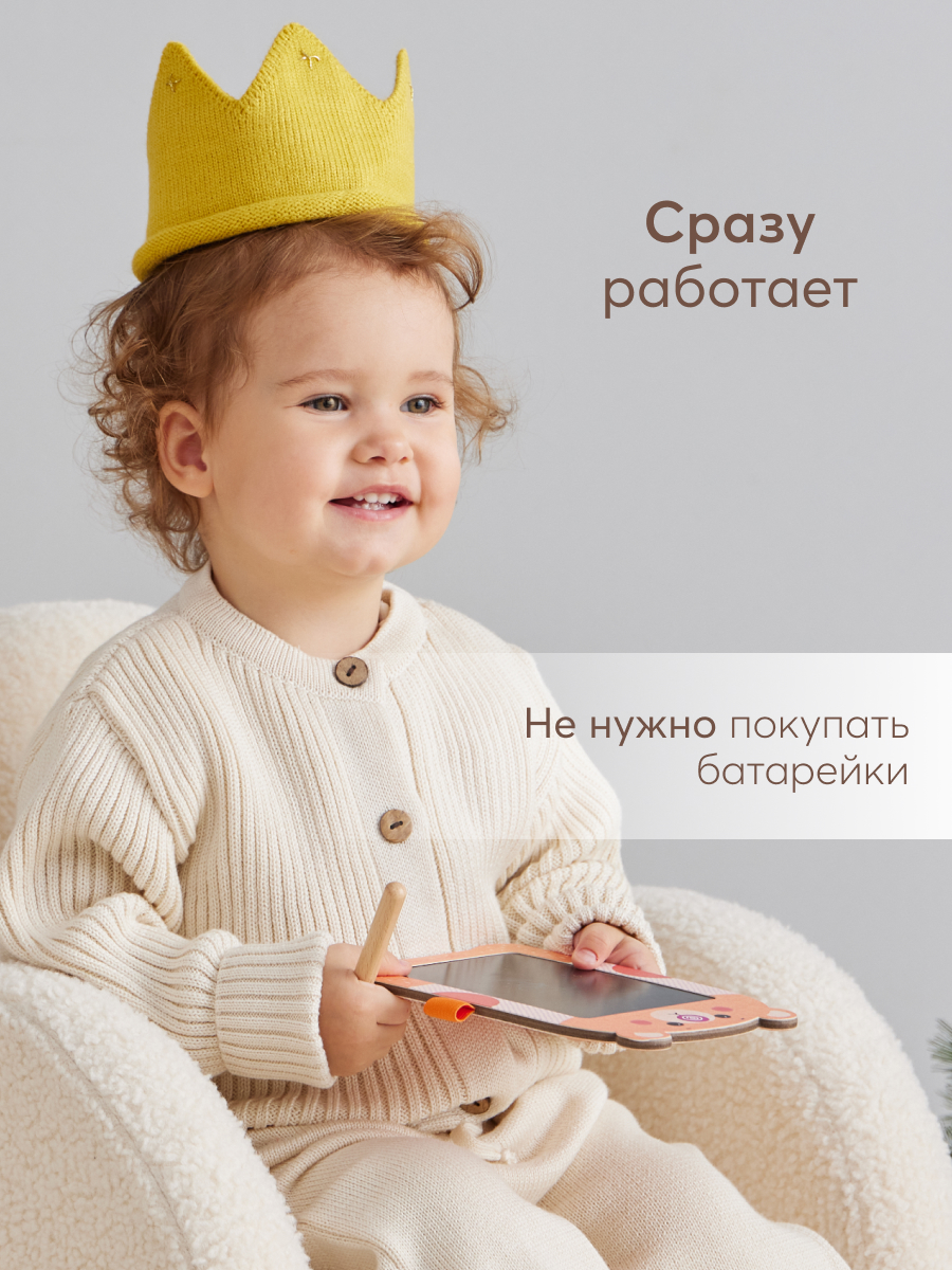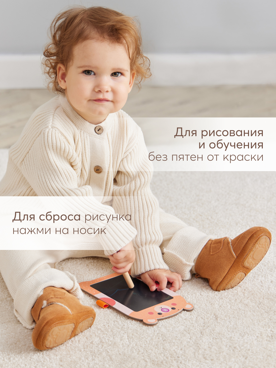 Планшет позволит рисовать без карандашей и бумаги. Его удобно брать с собой в дорогу, чтобы завлечь ребенка и сохранить чистым все вокруг. LCD-экран помещен в приятный на ощупь и легкий корпус из дерева. Рисование производится стилусом, для хранения которого предусмотрено гнездо сбоку, благодаря чему ручка не потеряется. Игрушка имеет компактный размер, удобный для детей. Такой аксессуар можно положить в сумку, чтобы увлечь малыша изучением букв или цифр в очереди к врачу или во время поездок в транспорте. Милый дизайн понравится и мальчикам, и девочкам.