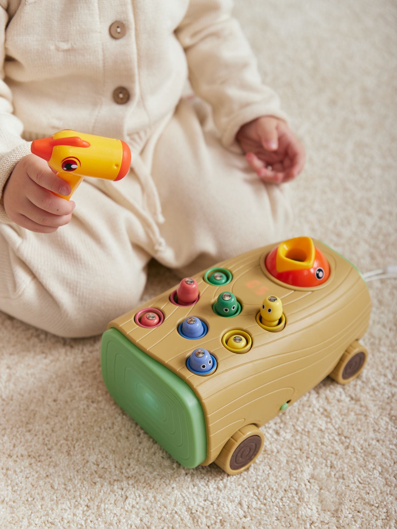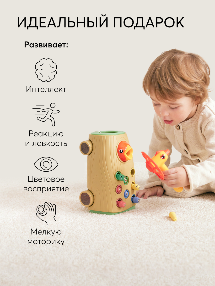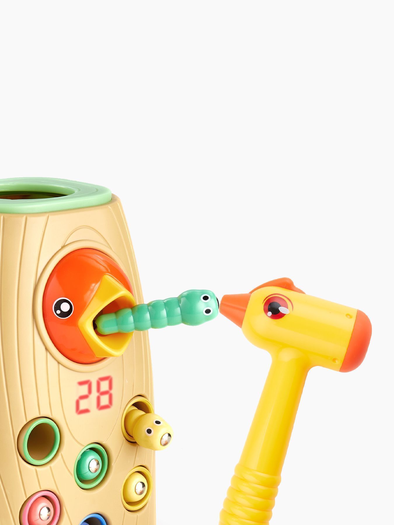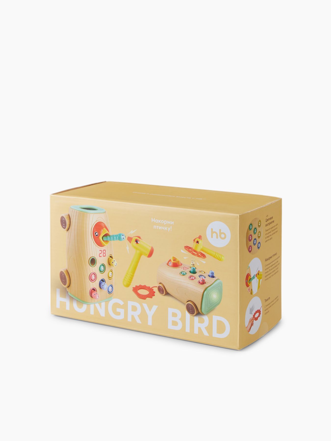 Игрушка-стучалка HUNGRY BIRD объединяет три игры в одной. 1 – нужно успеть стукнуть молоточком по всем червякам за определённое время, преодолев три уровня сложности: 30/60/99. 2 – нужно покормить птенца червячками, используя магнитный молоточек, 3 – игрушку можно использовать как каталку. HUNGRY BIRD сделан из приятного на ощупь материала, снабжён звуковыми и световыми эффектами, LED-дисплеем. Игра развивает координацию и реакцию, мелкую моторику, логику, учит определять цвета, считать, помогает выучить цифры, пробуждает познавательный интерес.