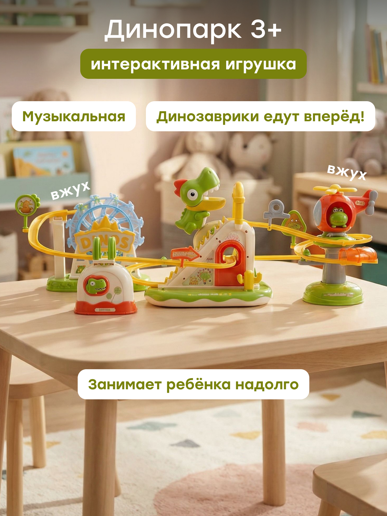 Интерактивный DINOPARK от Happy Baby – это развивающий трек-конструктор с динозаврами для мальчиков и девочек от 3 лет. Динопарк сочетает в себе элементы конструктора и динамической игры, которые способствуют всестороннему развитию ребенка.