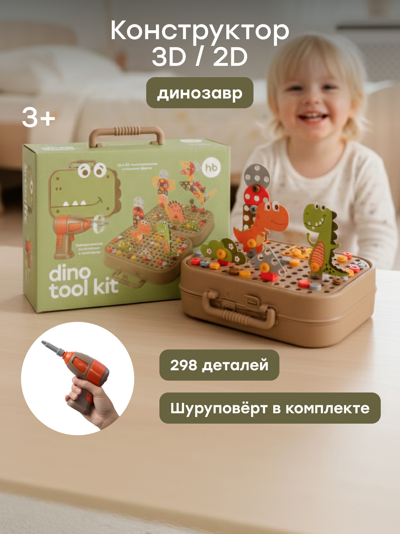 Детский конструктор с шуруповёртом — набор для сборки разнообразных конструкций в виде динозавров, объединяющий игру и обучение. В комплекте 298 деталей, аккуратно уложенных в кейс, который превращается в площадку для сборки. Яркие карточки в виде динозавров встраиваются в модели и придают им завершённый вид.