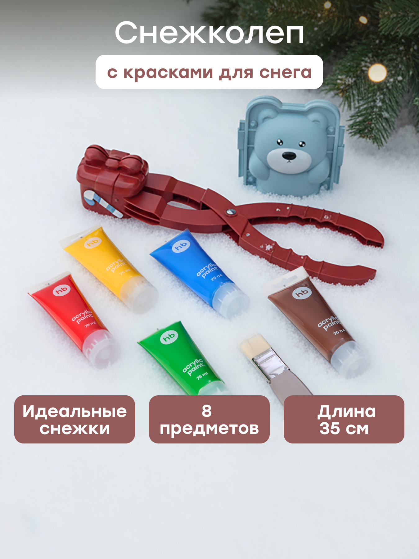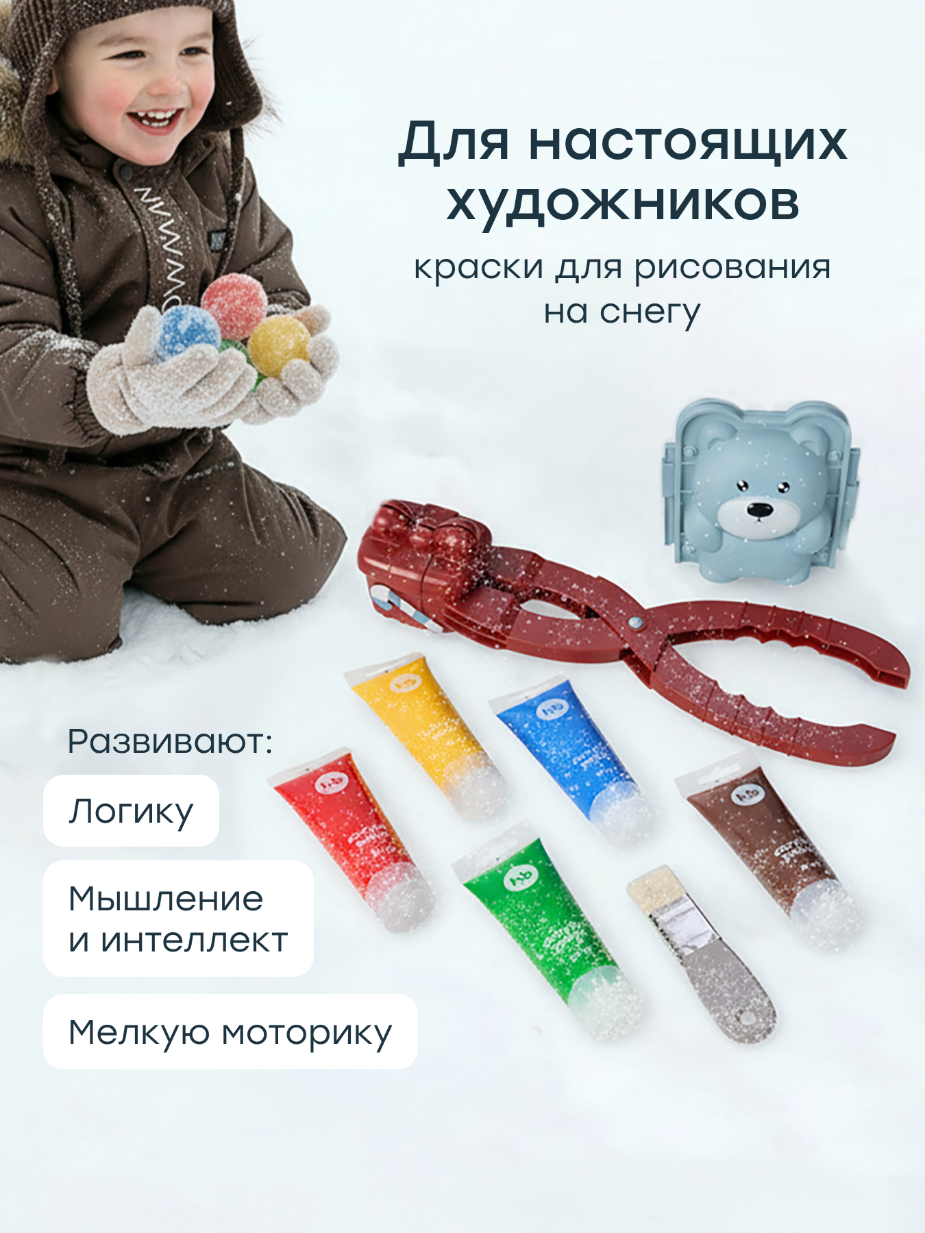 • Универсальный набор для зимнего досуга — сочетает в себе игру и творчество: можно лепить снежки и сразу раскрашивать их красками
