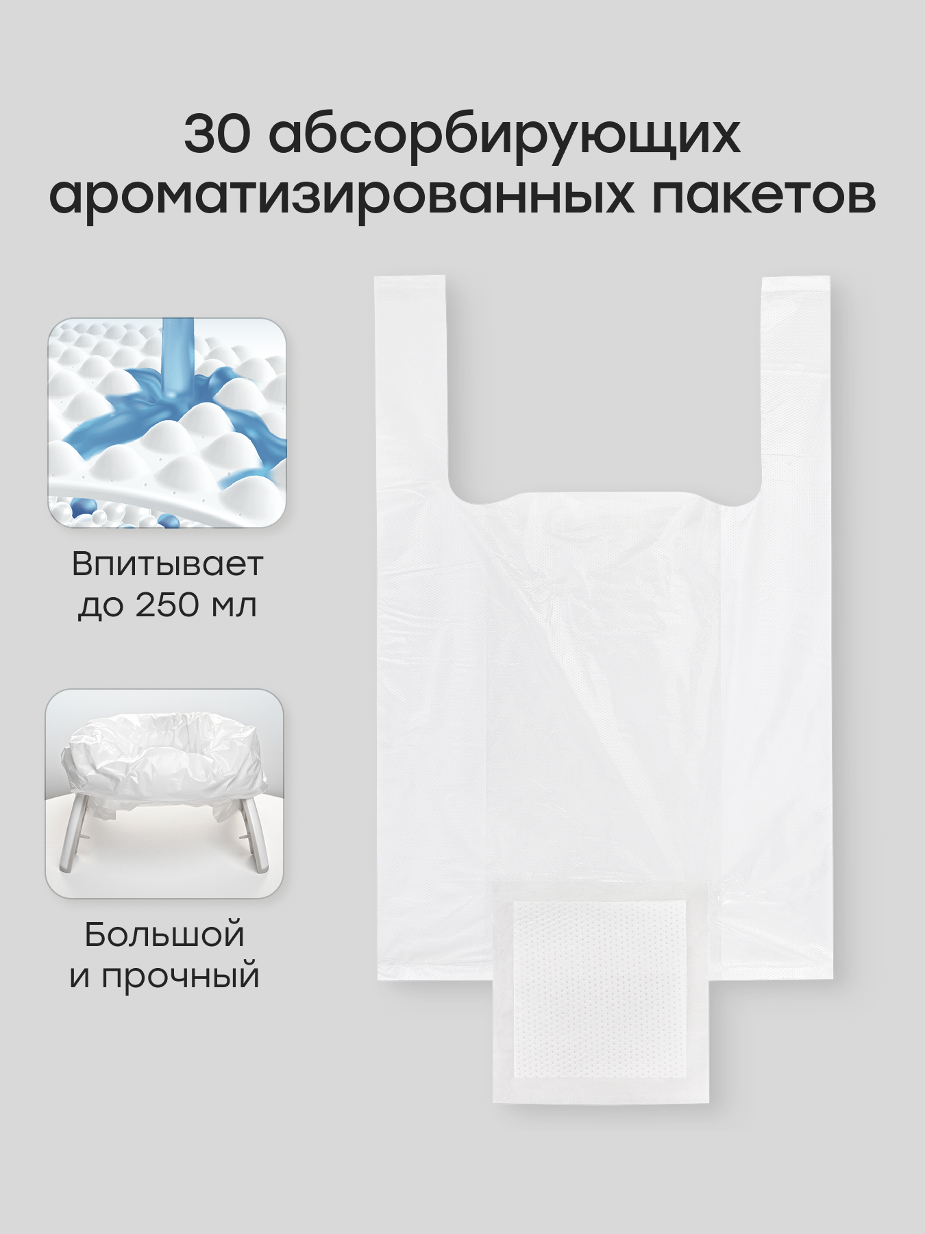 - Гигиеничность и удобство - в комплекте 30 сменных пакетов с впитывающим слоем — просто замените мешок после использования, не нужно мыть. Пакеты легко фиксируются в резиновые прорези, обеспечивая надежное крепление