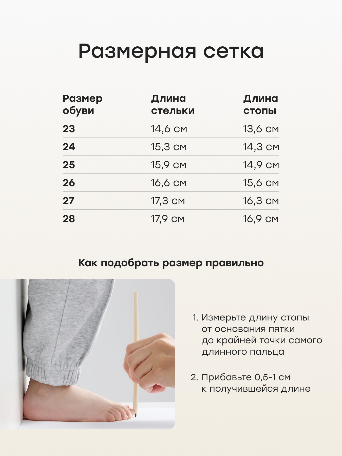 | Длина стопы, см | 13.6 | 14.3 | 14.9 | 15.6 | 16,3 | 16.9 |