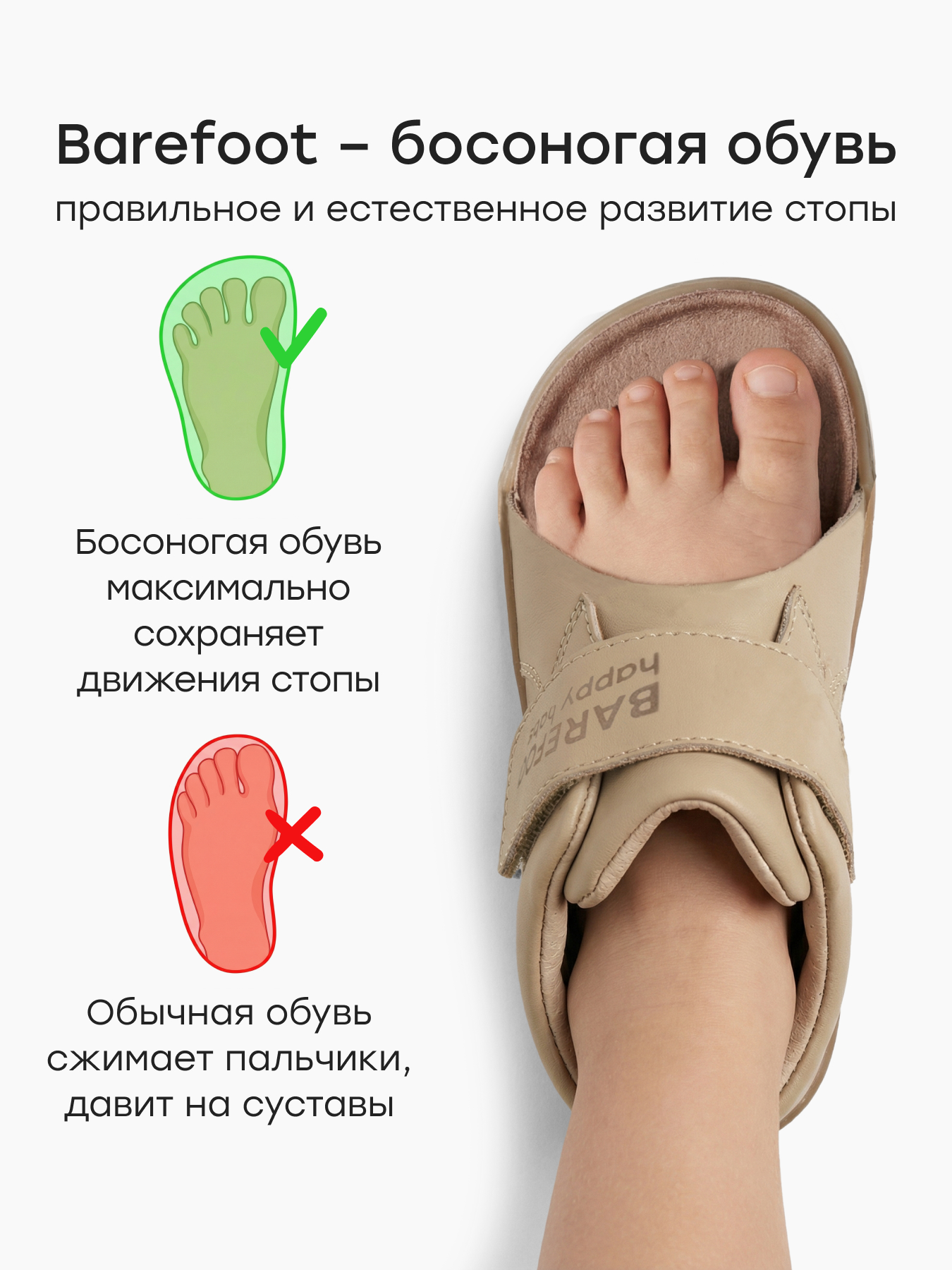 • Удобная липучка — надежно фиксирует стопу и помогает ребёнку обуваться самостоятельно