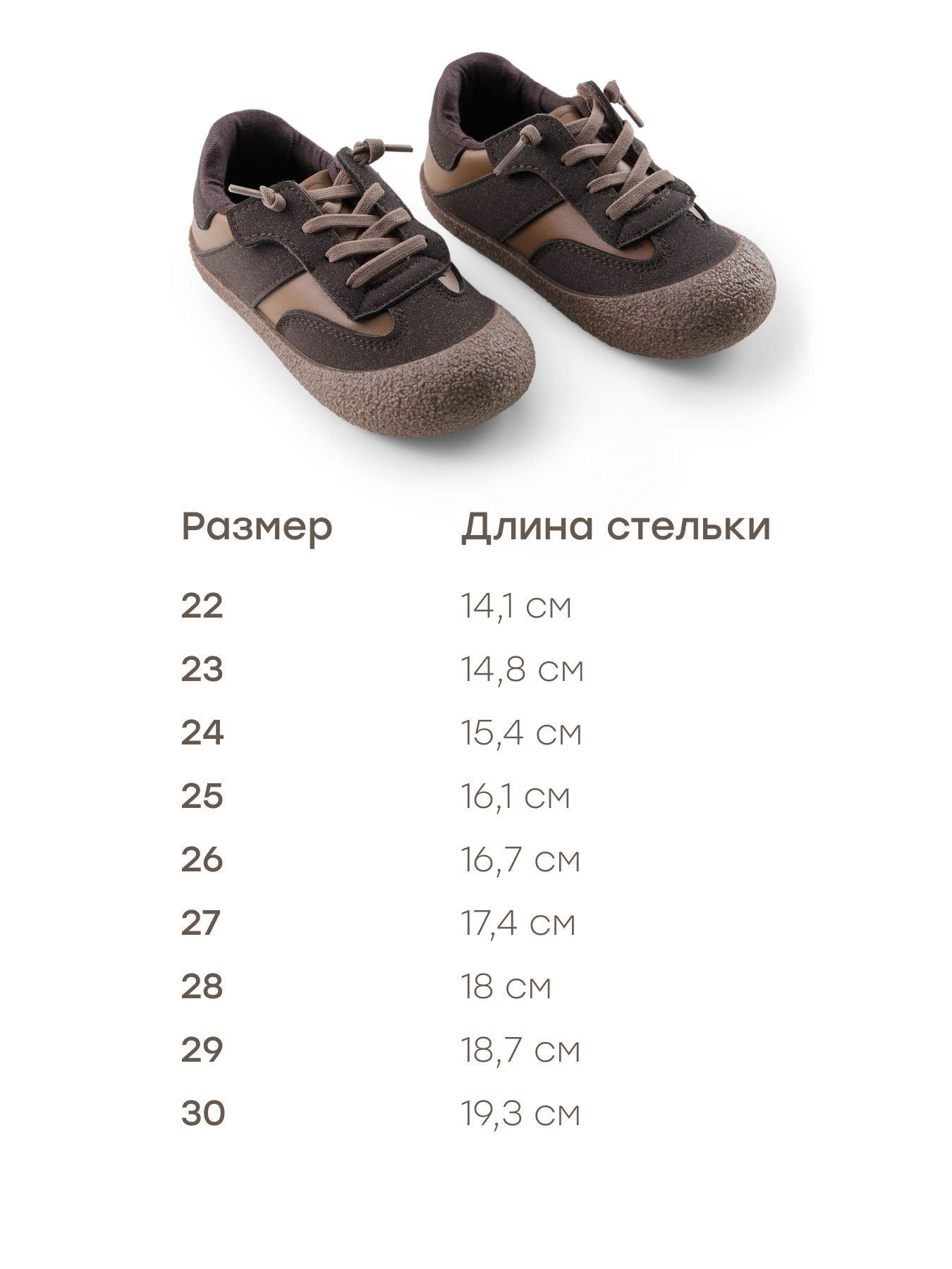 | Длина стельки, см | 14.1 | 14.8 | 15.4 | 16.1 | 16.7 | 17.4 | 18 | 18.7 | 19.3 |