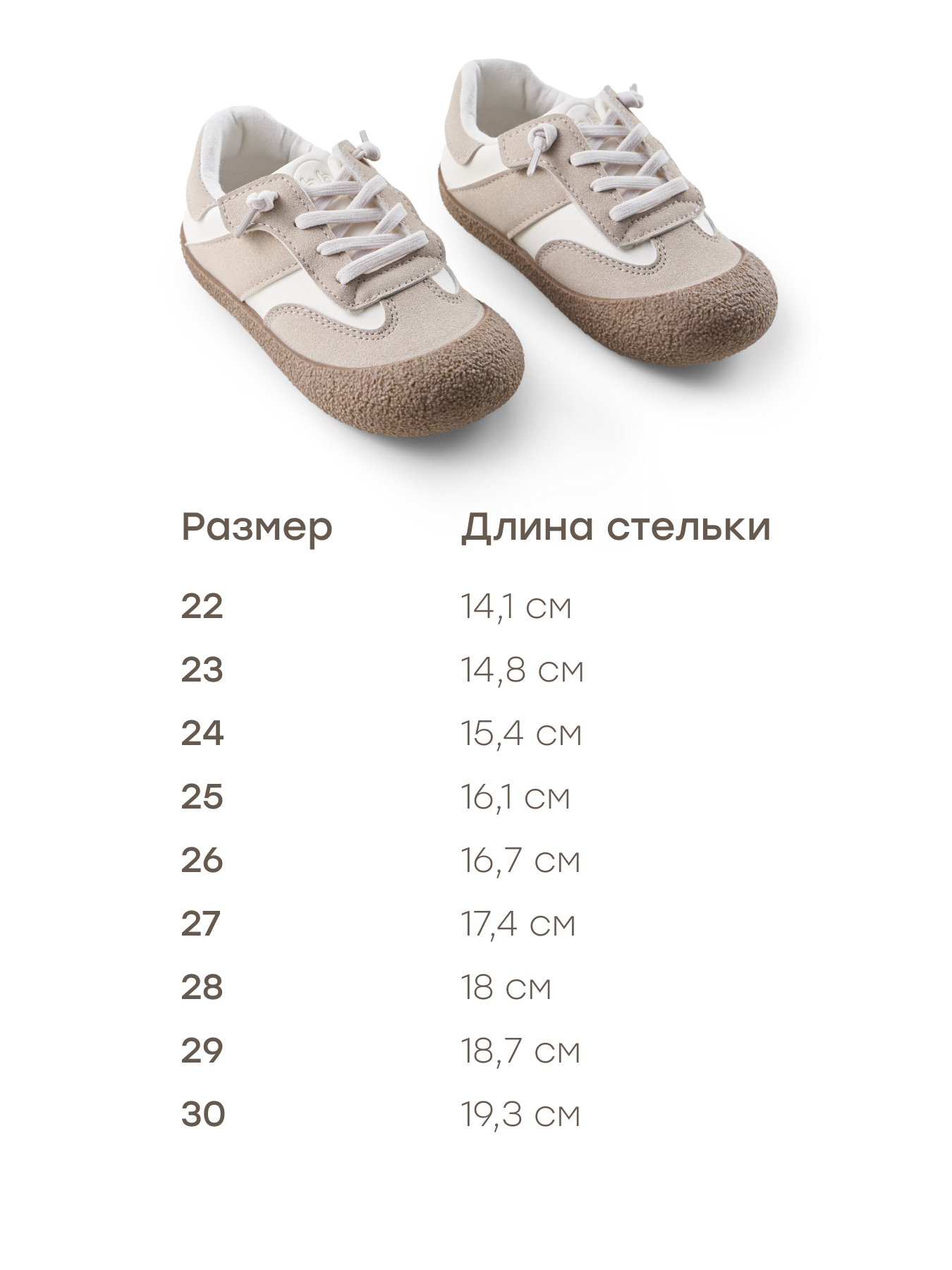 | Длина стельки, см | 14.1 | 14.8 | 15.4 | 16.1 | 16.7 | 17.4 | 18 | 18.7 | 19.3 |