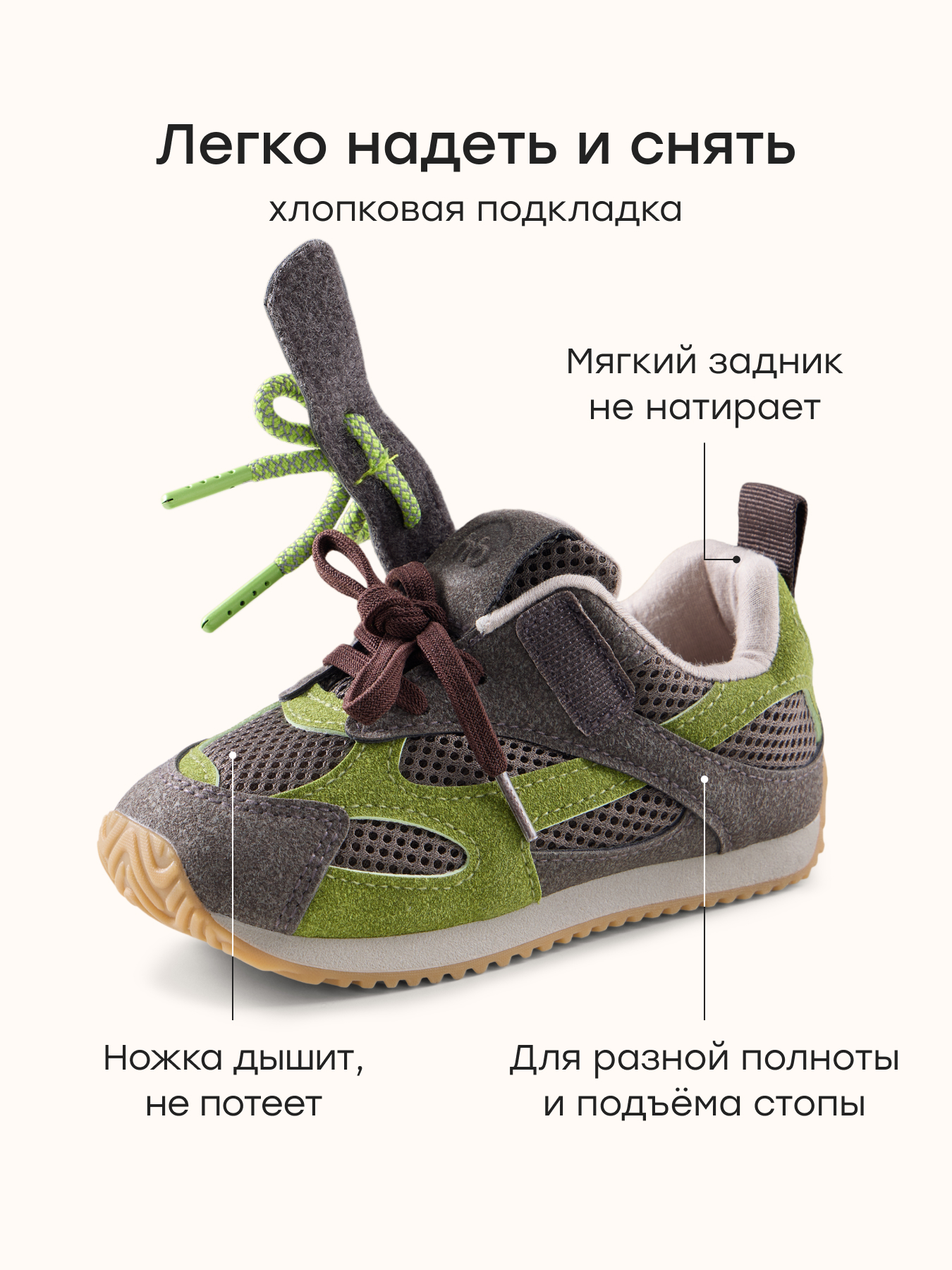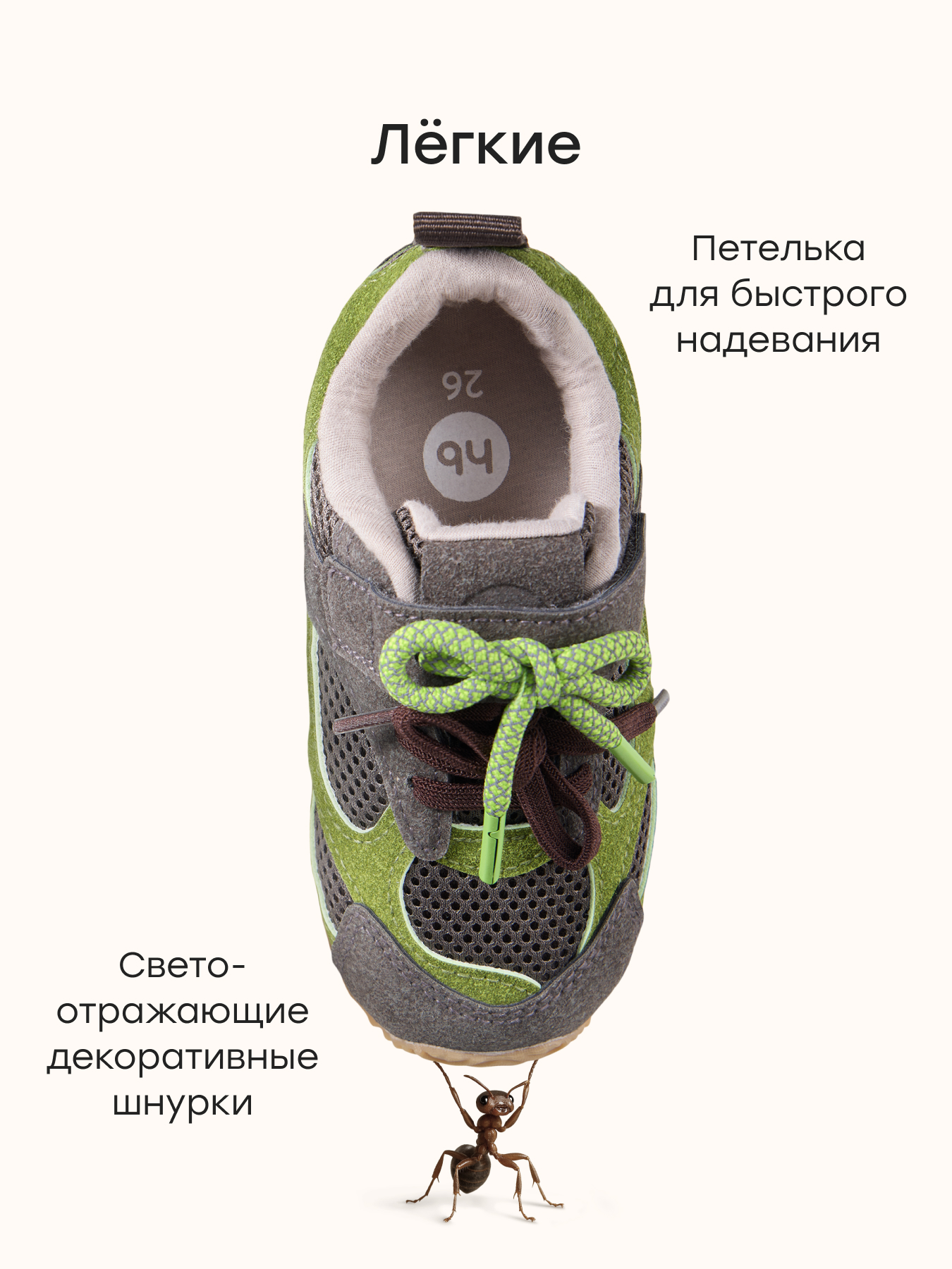 • Петелька на заднике — упрощает надевание и снятие обуви без помощи взрослых