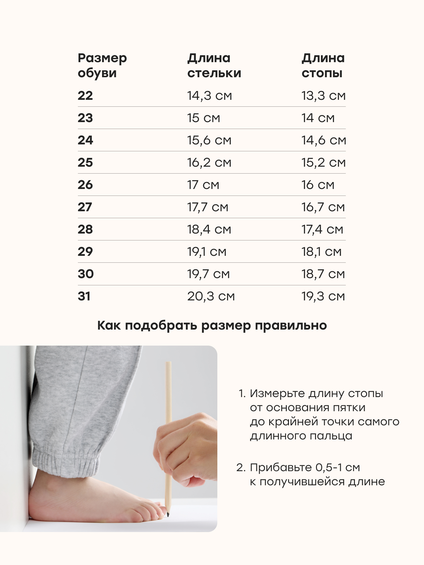 Длина стельки, см 14.3 15 15.6 16.2 17 17.7 18.4 19.1 19.7 20.3