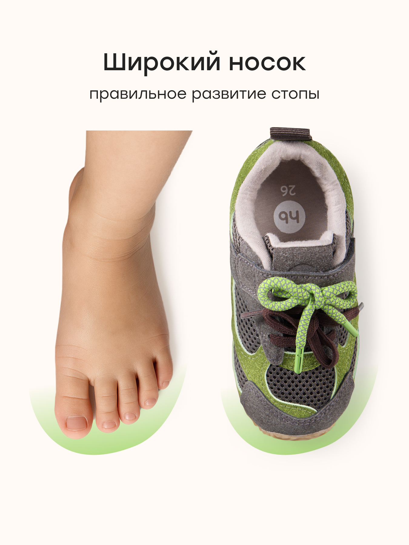 • Широкий носок — не сдавливает пальцы и обеспечивает естественное положение стопы
