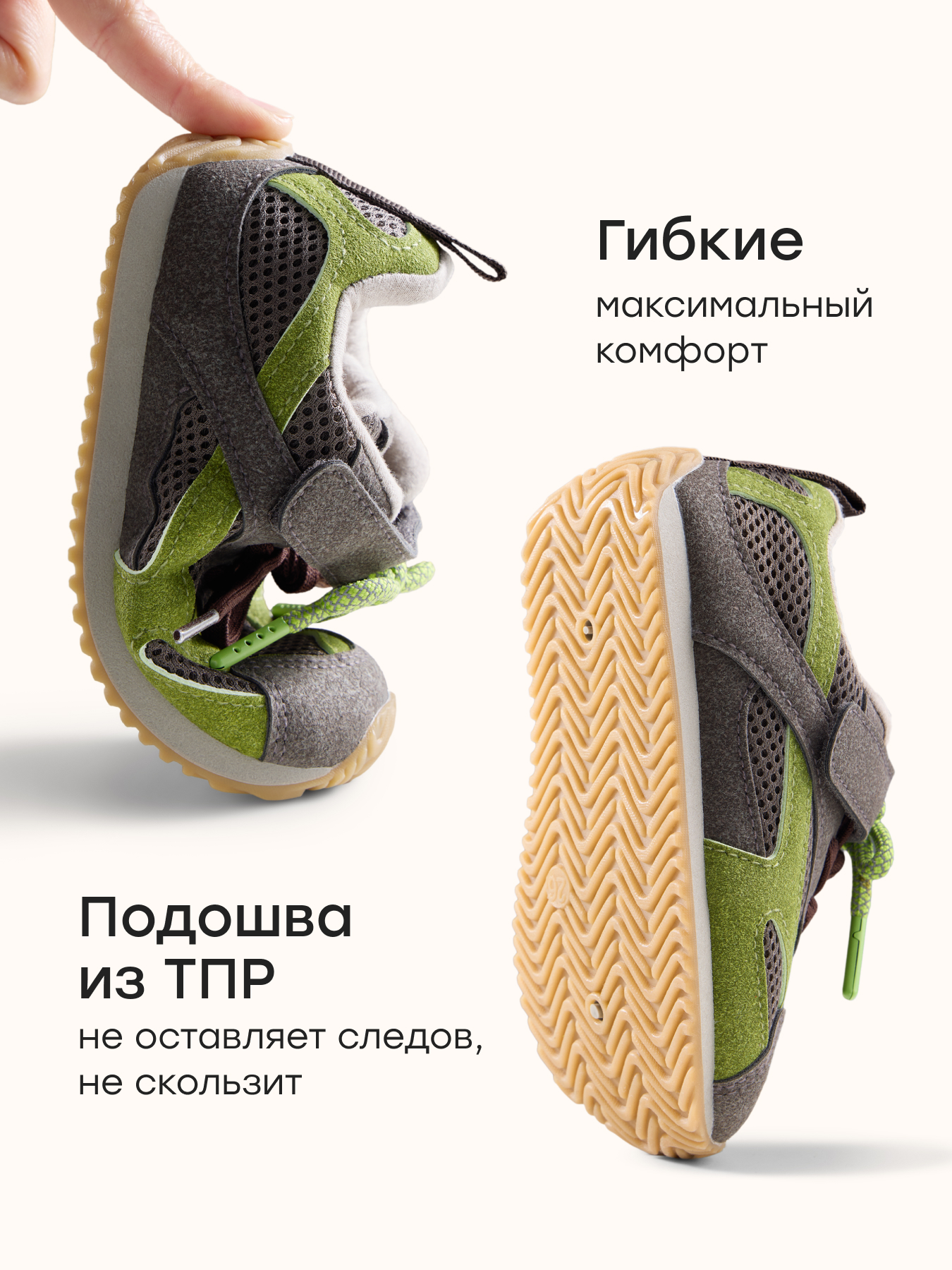 • Гибкая подошва из ТПР — обеспечивает хорошее сцепление с поверхностью и мягкую амортизацию при ходьбе