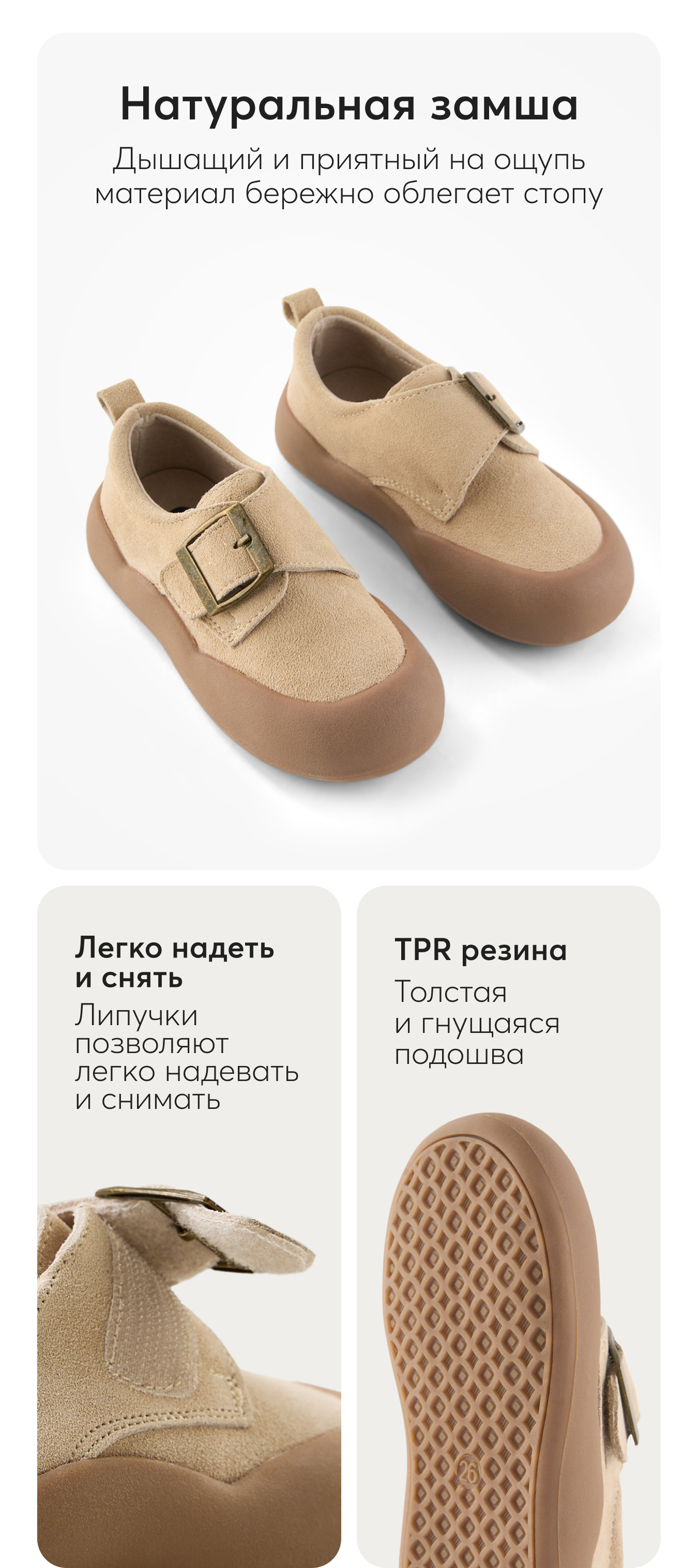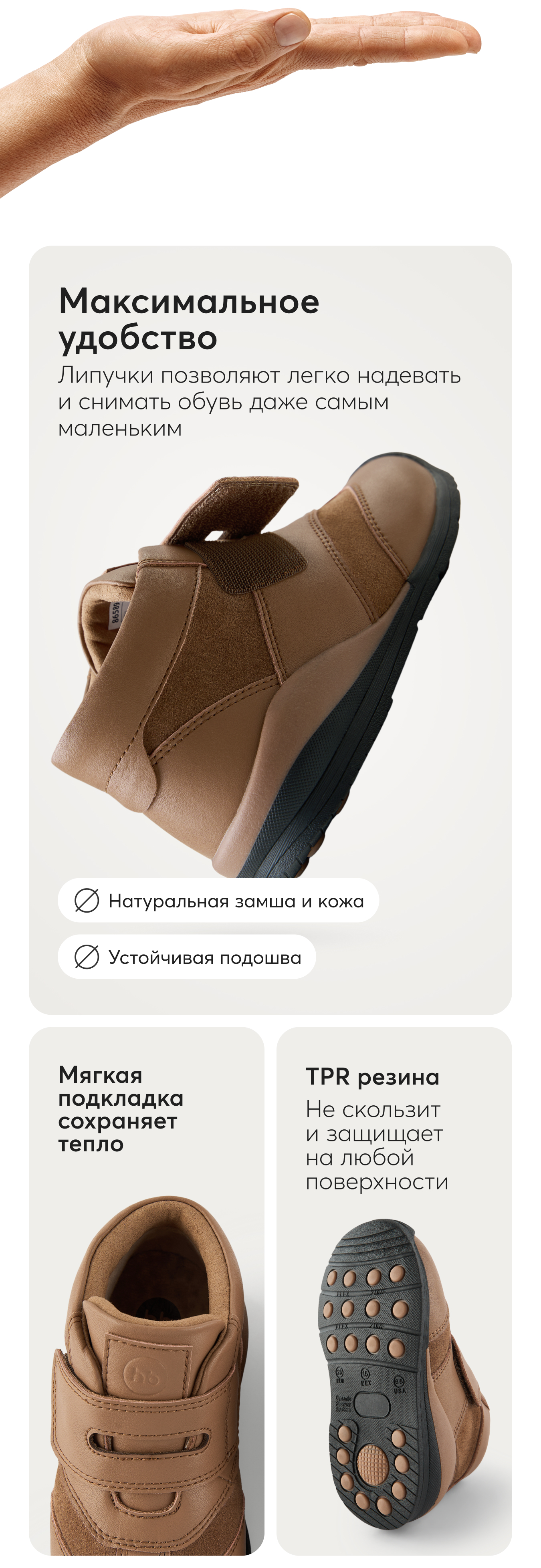 Замшевые детские угги от Happy Baby представляют собой идеальное сочетание комфорта и стиля для маленьких детей с их самых первых шагов. Мягкая и теплая меховая подкладка внутри обеспечивает максимальный комфорт и защиту от холода для ножек малыша в холодное время года. Универсальный дизайн позволяет носить их, и как ботинки для девочки демисезонные, и как ботинки для мальчика демисезонные. Специально разработанная легкая резиновая подошва обеспечивает устойчивость к морозам и предотвращает скольжение, что делает эти ботинки детские идеальными для прогулок. Замша - это легкий материал, который не создает дополнительного давления на ноги малыша. Благодаря удобной застежке на липучке, утепленные полуботинки очень легко и быстро надеваются и снимаются, что облегчает процесс одевания и для мальчика и для девочки и для мамы. Детская обувь для малышей имеет внутренний мех, который обеспечивает дополнительный уровень комфорта и сохранение тепла в прохладный демисезон, осень и весну. Модные однотонные ботинки для девочки коричневого цвета подойдут под одежду любого стиля и станут стильным дополнением к гардеробу. Позвольте вашему малышу наслаждаться каждым шагом с этой прекрасной и удобной демисезонной обувью для осенних и весенних прогулок. В магазине нашего бренда Хеппи Беби Вы сможете найти широкий ассортимент товаров для детей, а также другие вещи и предметы одежды, выполненные в едином стиле, и собрать ребенку полноценный комплект, купив их отдельно.