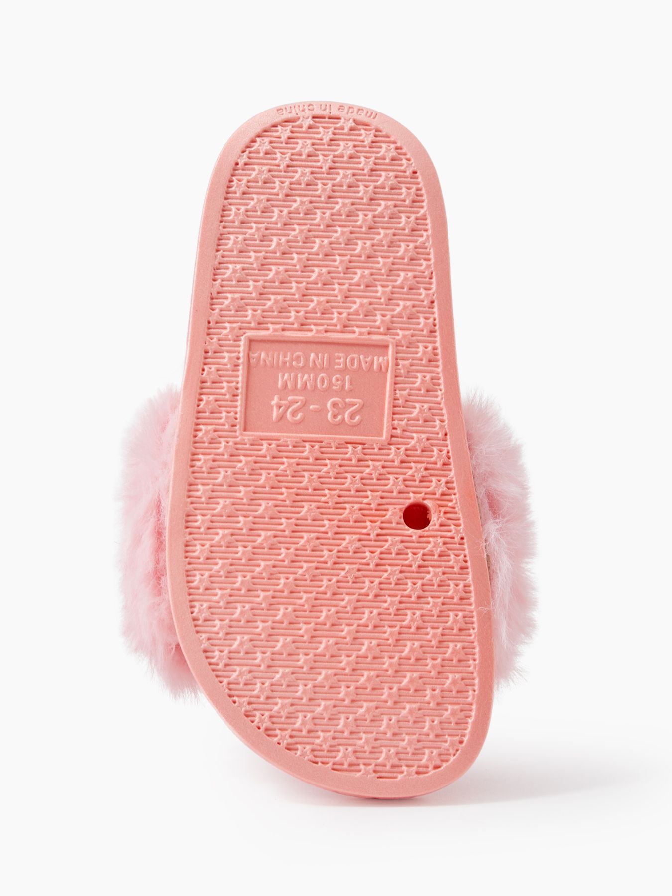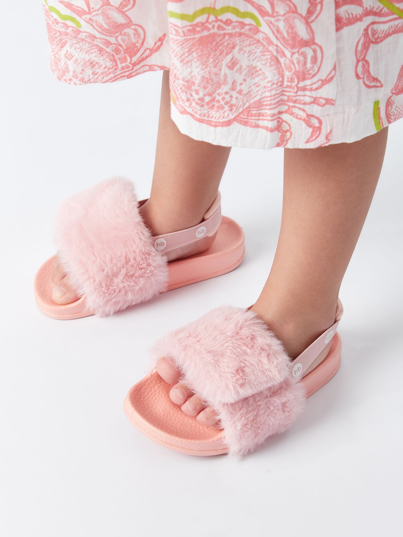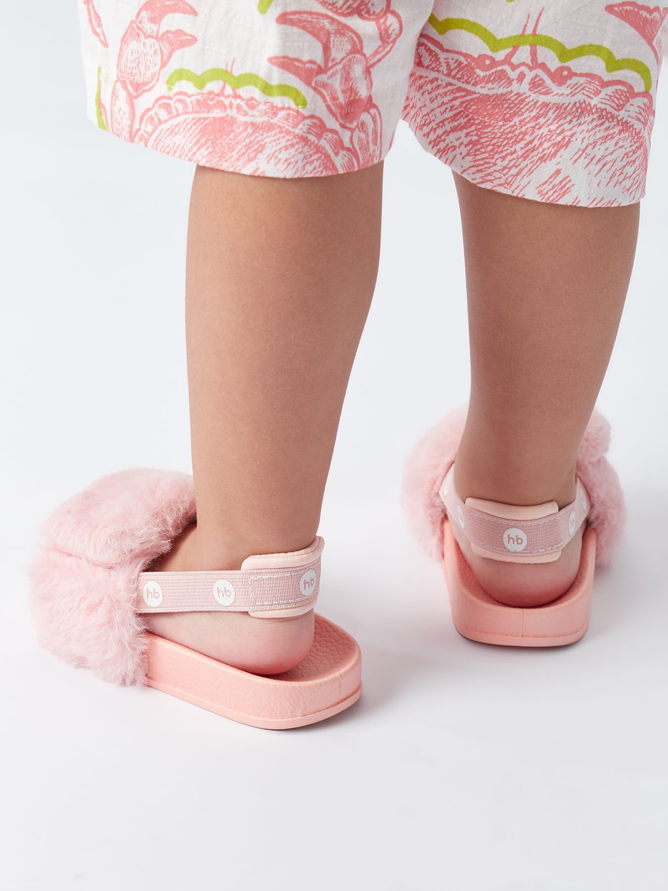 Сандалии – идеальная обувь для лета и удобная сменка круглый год. Стильные розовые сандалии с мехом станут ярким акцентом любого образа. Перемычка на резинке позволит крепко зафиксировать сандалии на ноге, а мягкая тканевая вставка над пяткой исключит натирание. Прочная подошва защитит стопу от травм. Низкий вес сандалий позволит долго гулять и не уставать.