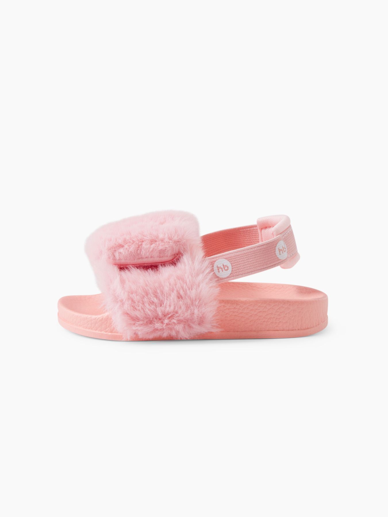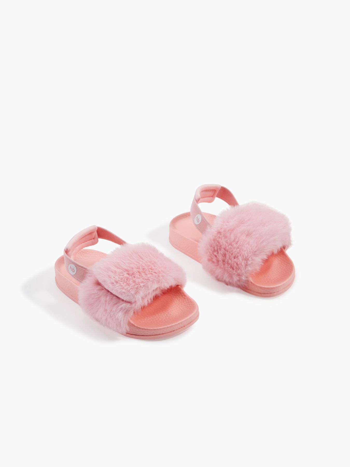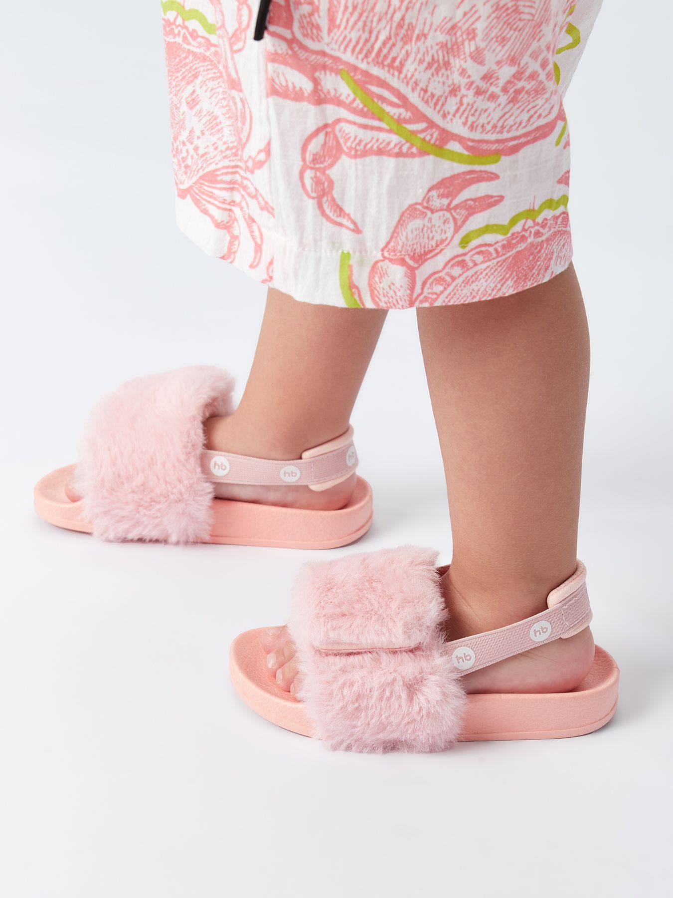 Сандалии – идеальная обувь для лета и удобная сменка круглый год. Стильные розовые сандалии с мехом станут ярким акцентом любого образа. Перемычка на резинке позволит крепко зафиксировать сандалии на ноге, а мягкая тканевая вставка над пяткой исключит натирание. Прочная подошва защитит стопу от травм. Низкий вес сандалий позволит долго гулять и не уставать.