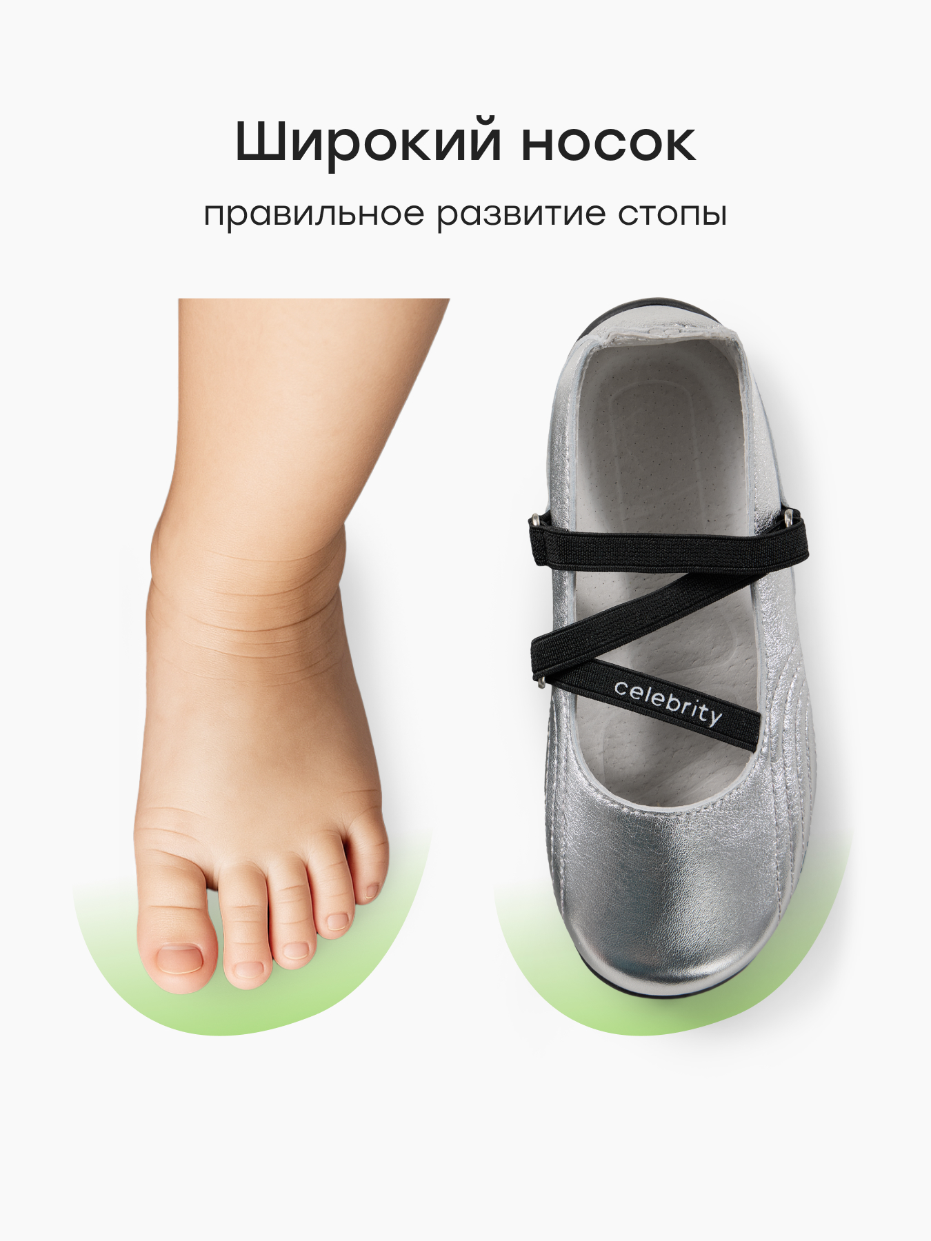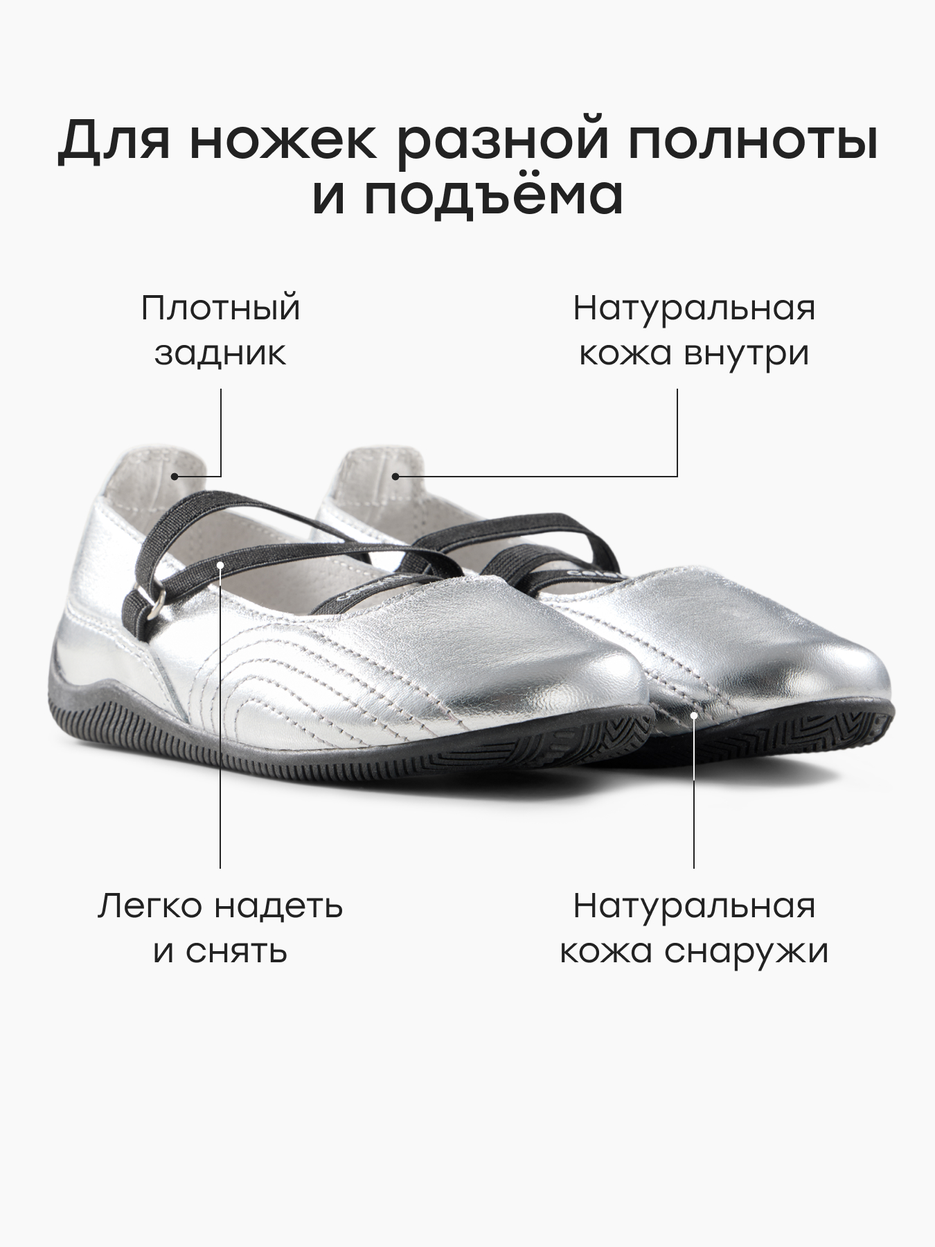 • Продуманная конструкция - широкий носок обеспечивает правильное положение пальцев малыша, не препятствуя правильному развитию стопы, сама модель подходит на любой подъем, а плотный задник фиксирует пятку