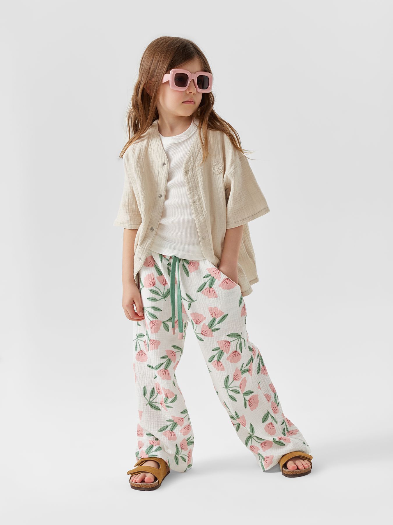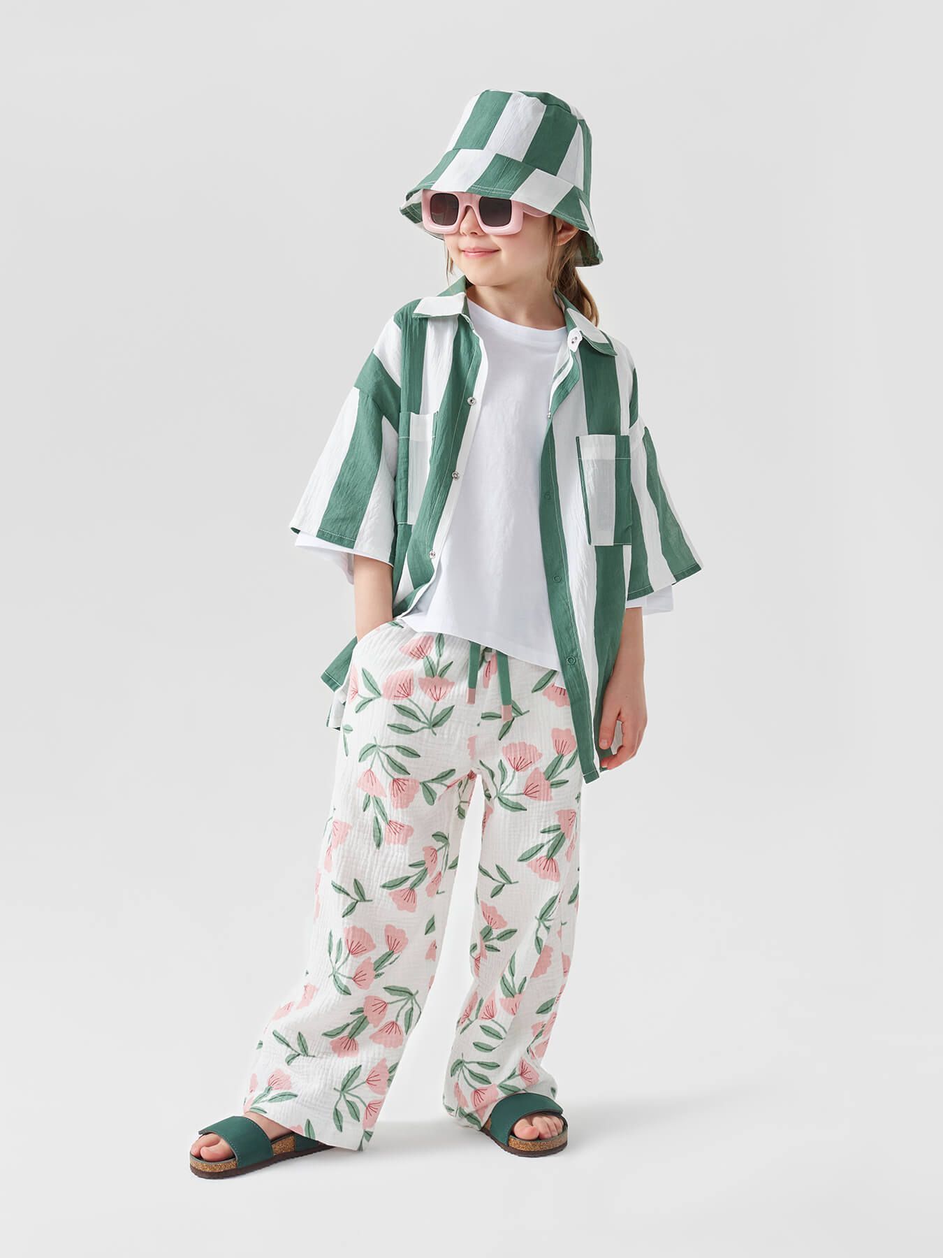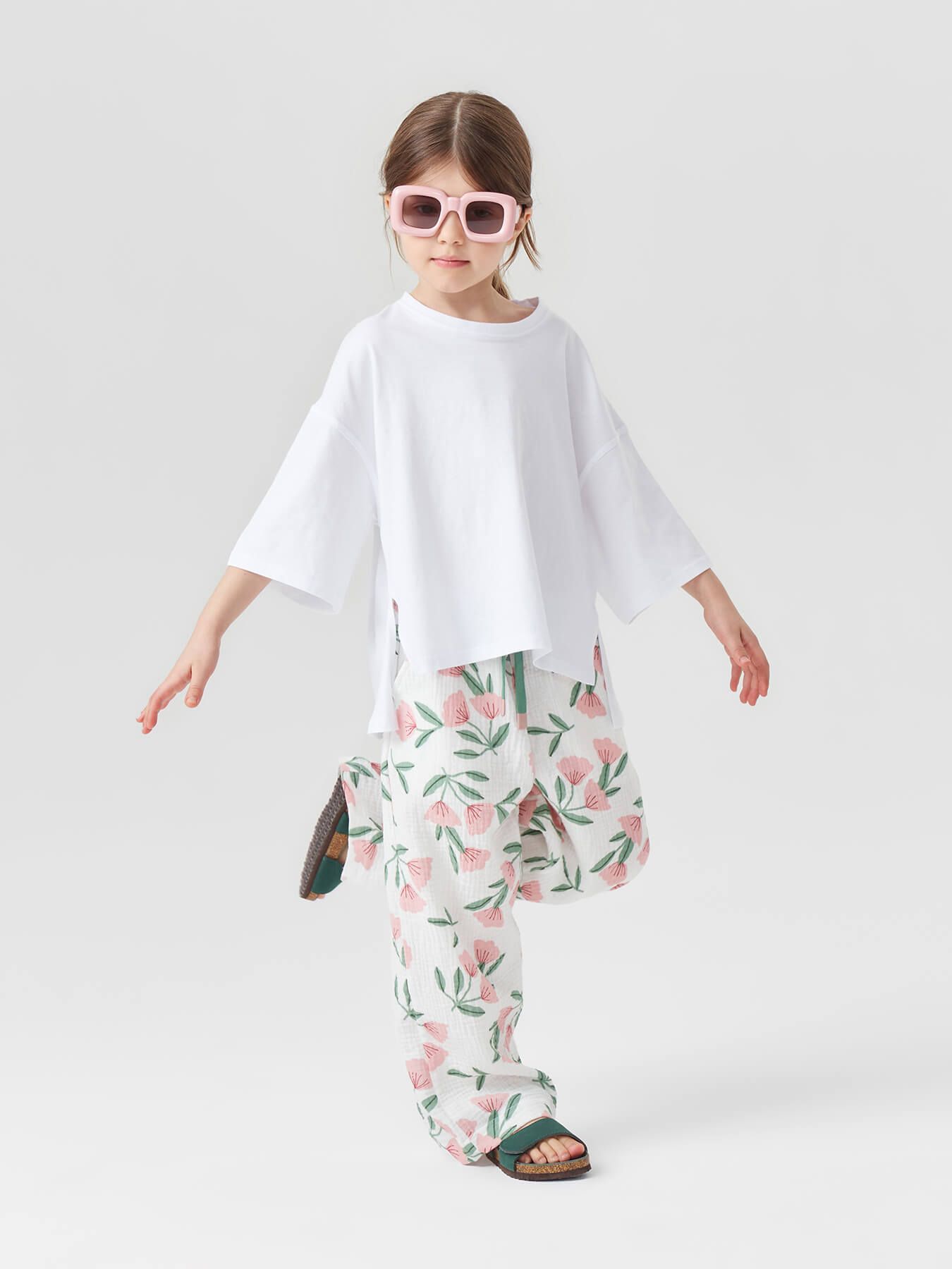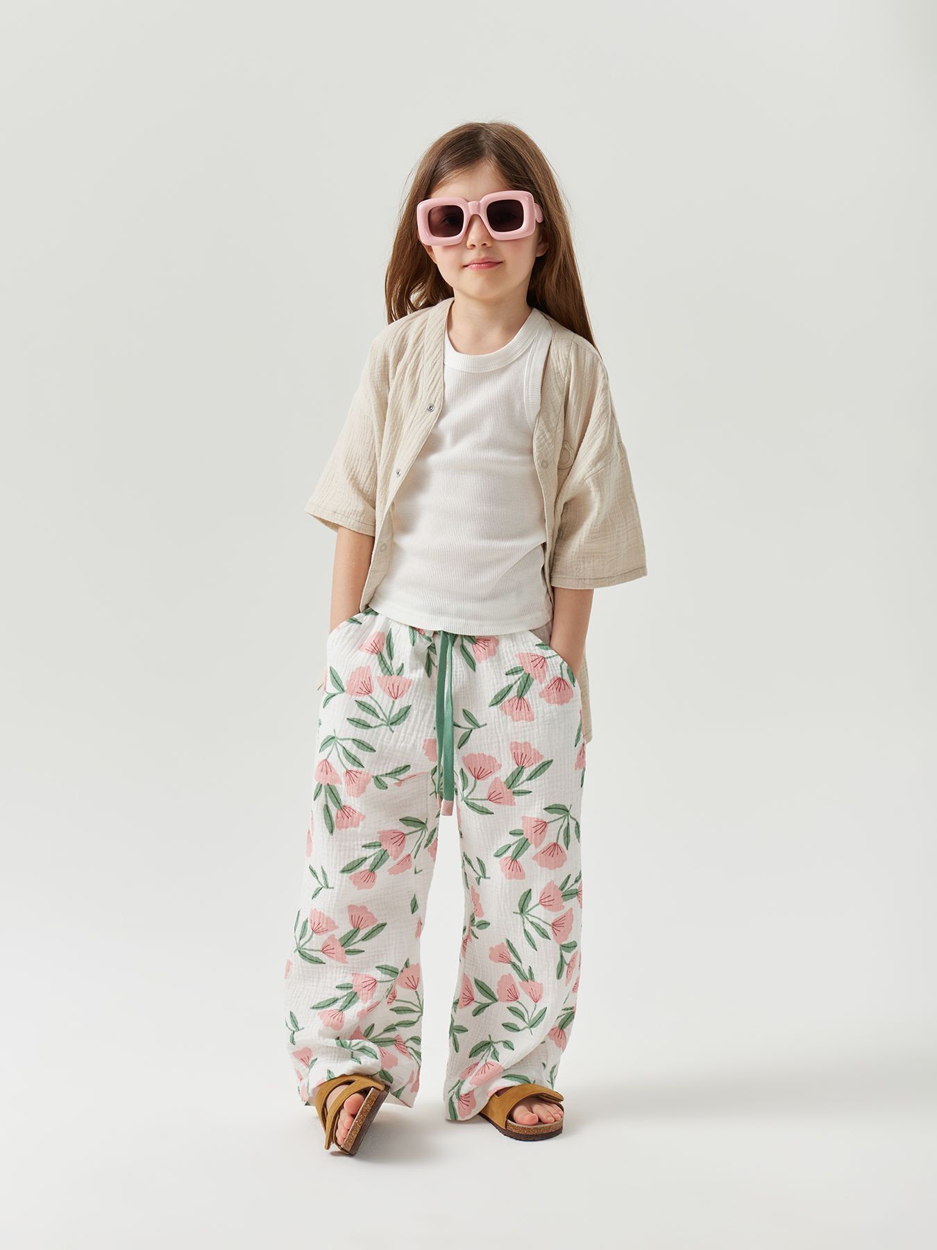Широкие хлопковые брюки незаменимы на прогулках и в поездках. Согреют вечером и защитят от солнца днем. Благодаря резинке и шнурку штанишки садятся на детей с разным объемом талии. Прямой крой хорошо выглядит и для удлиненных, и для укороченных моделей, потому брюки одного размера можно носить несколько сезонов. Сшиты из материала, в составе которого 100% хлопка. Ткань дышит, хорошо отводит влагу, не липнет к телу. Модель брюк подходит мальчикам и девочкам, и отлично сочетается в повседневных, пляжных и праздничных комплектах.
