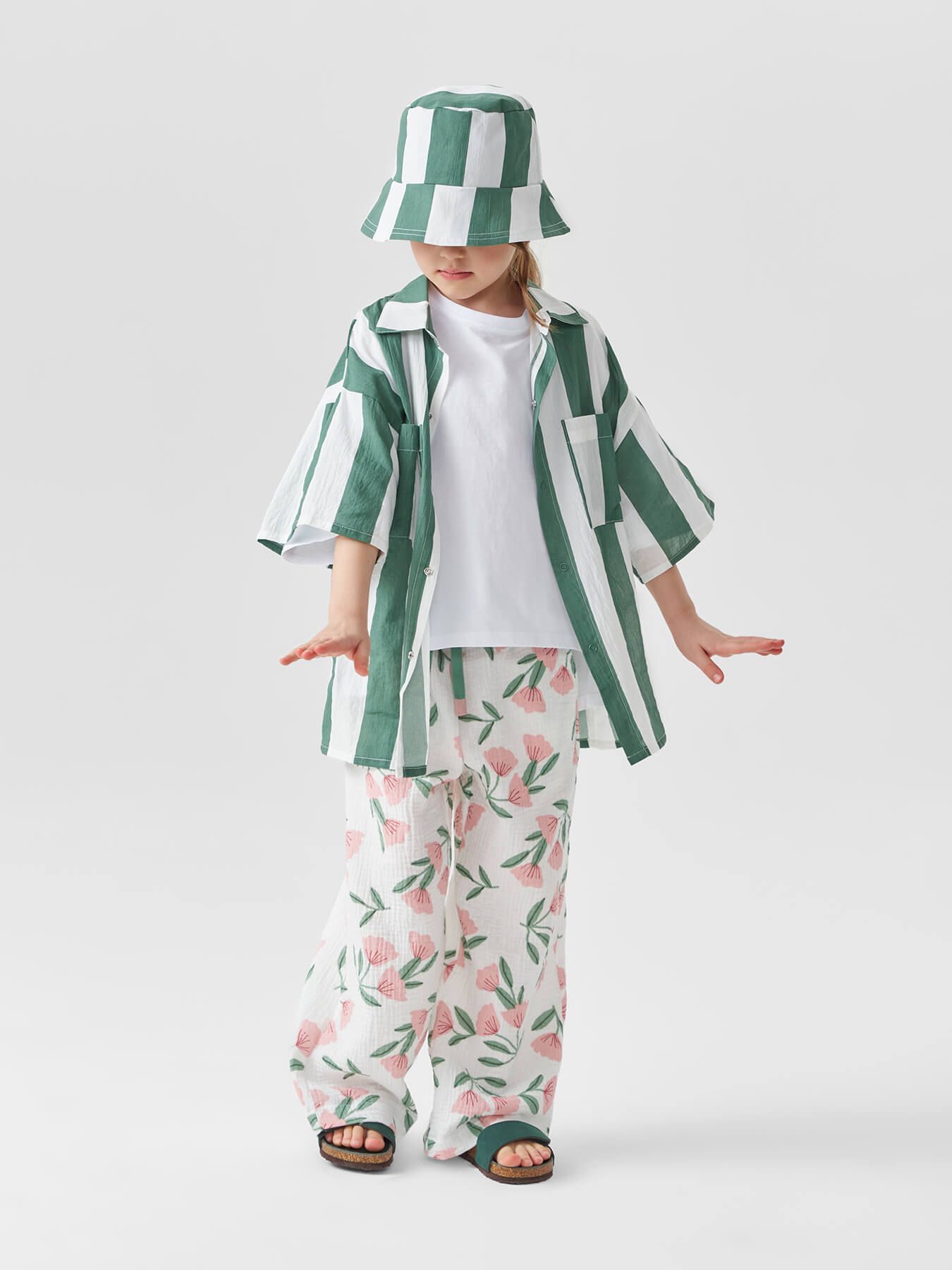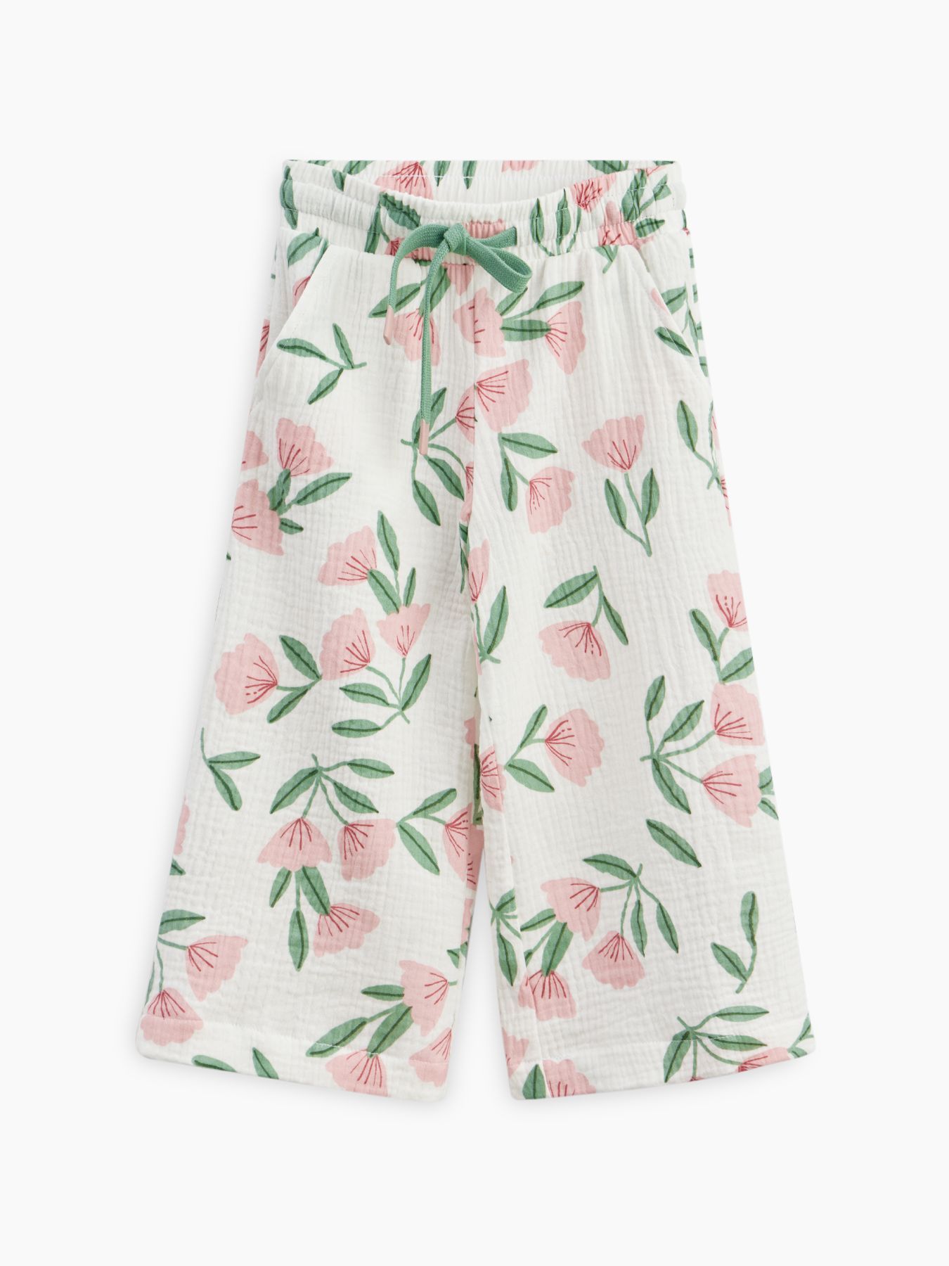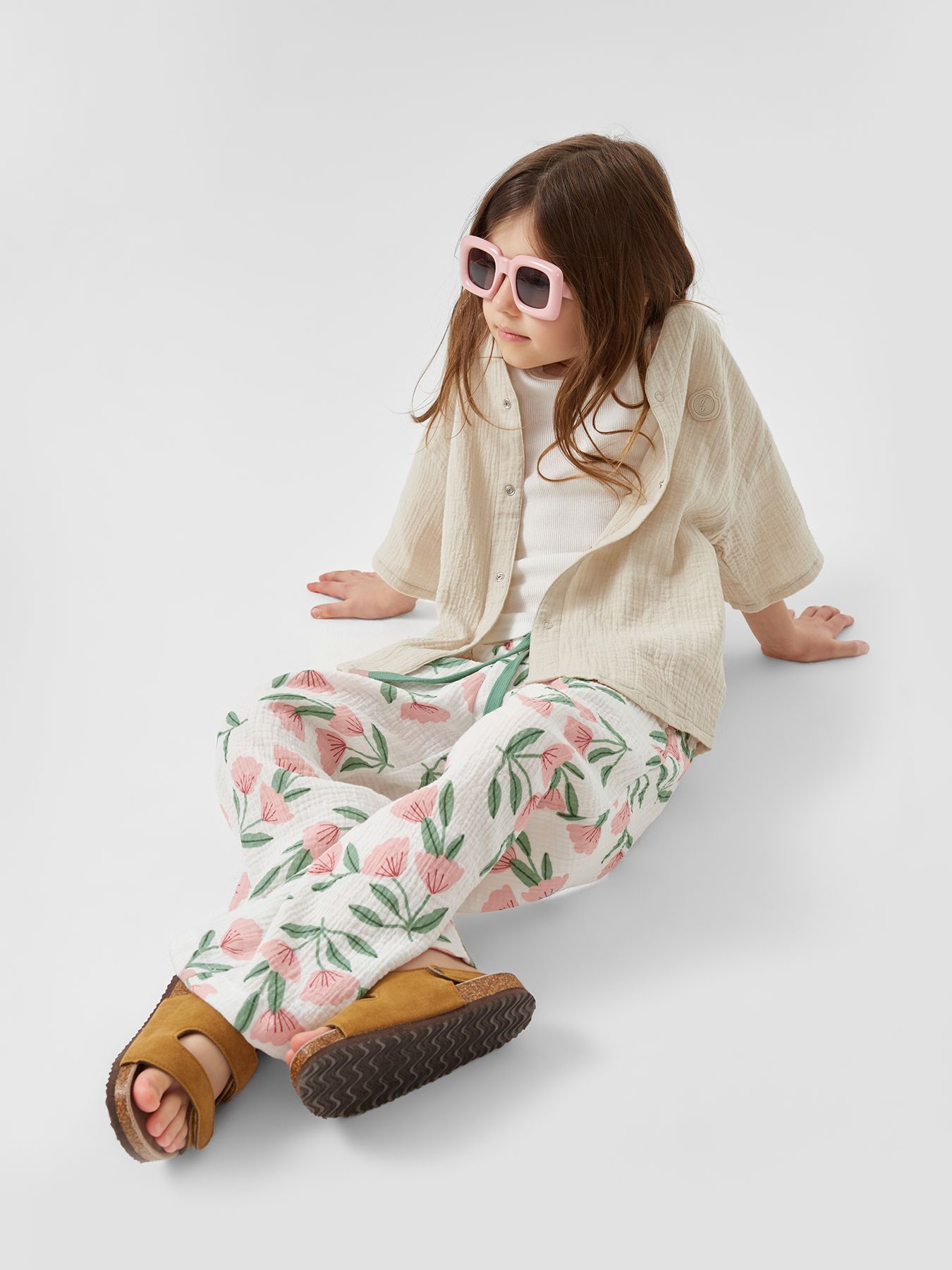 Широкие хлопковые брюки незаменимы на прогулках и в поездках. Согреют вечером и защитят от солнца днем. Благодаря резинке и шнурку штанишки садятся на детей с разным объемом талии. Прямой крой хорошо выглядит и для удлиненных, и для укороченных моделей, потому брюки одного размера можно носить несколько сезонов. Сшиты из материала, в составе которого 100% хлопка. Ткань дышит, хорошо отводит влагу, не липнет к телу. Модель брюк подходит мальчикам и девочкам, и отлично сочетается в повседневных, пляжных и праздничных комплектах.
