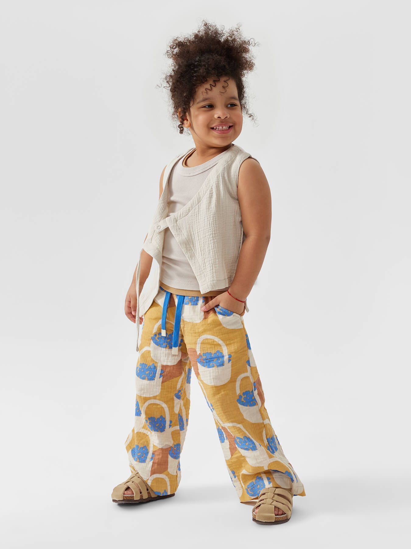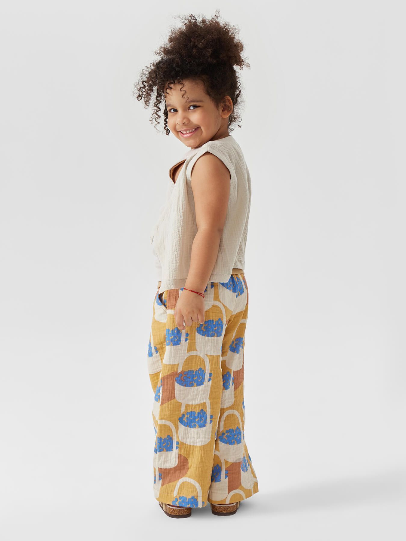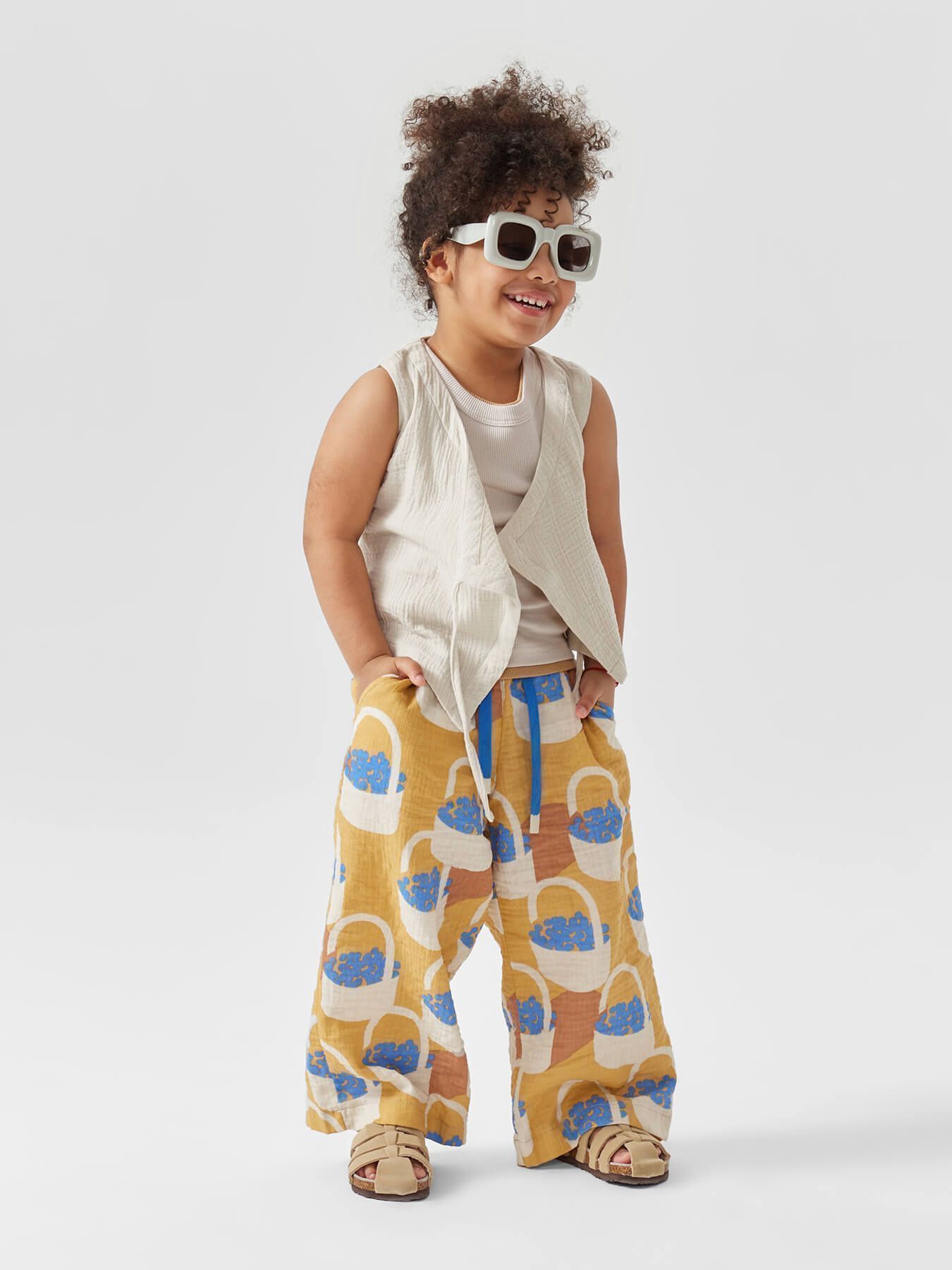 Широкие хлопковые брюки незаменимы на прогулках и в поездках. Согреют вечером и защитят от солнца днем. Благодаря резинке и шнурку штанишки садятся на детей с разным объемом талии. Прямой крой хорошо выглядит и для удлиненных, и для укороченных моделей, потому брюки одного размера можно носить несколько сезонов. Сшиты из материала, в составе которого 100% хлопка. Ткань дышит, хорошо отводит влагу, не липнет к телу. Модель брюк подходит мальчикам и девочкам, и отлично сочетается в повседневных, пляжных и праздничных комплектах.
