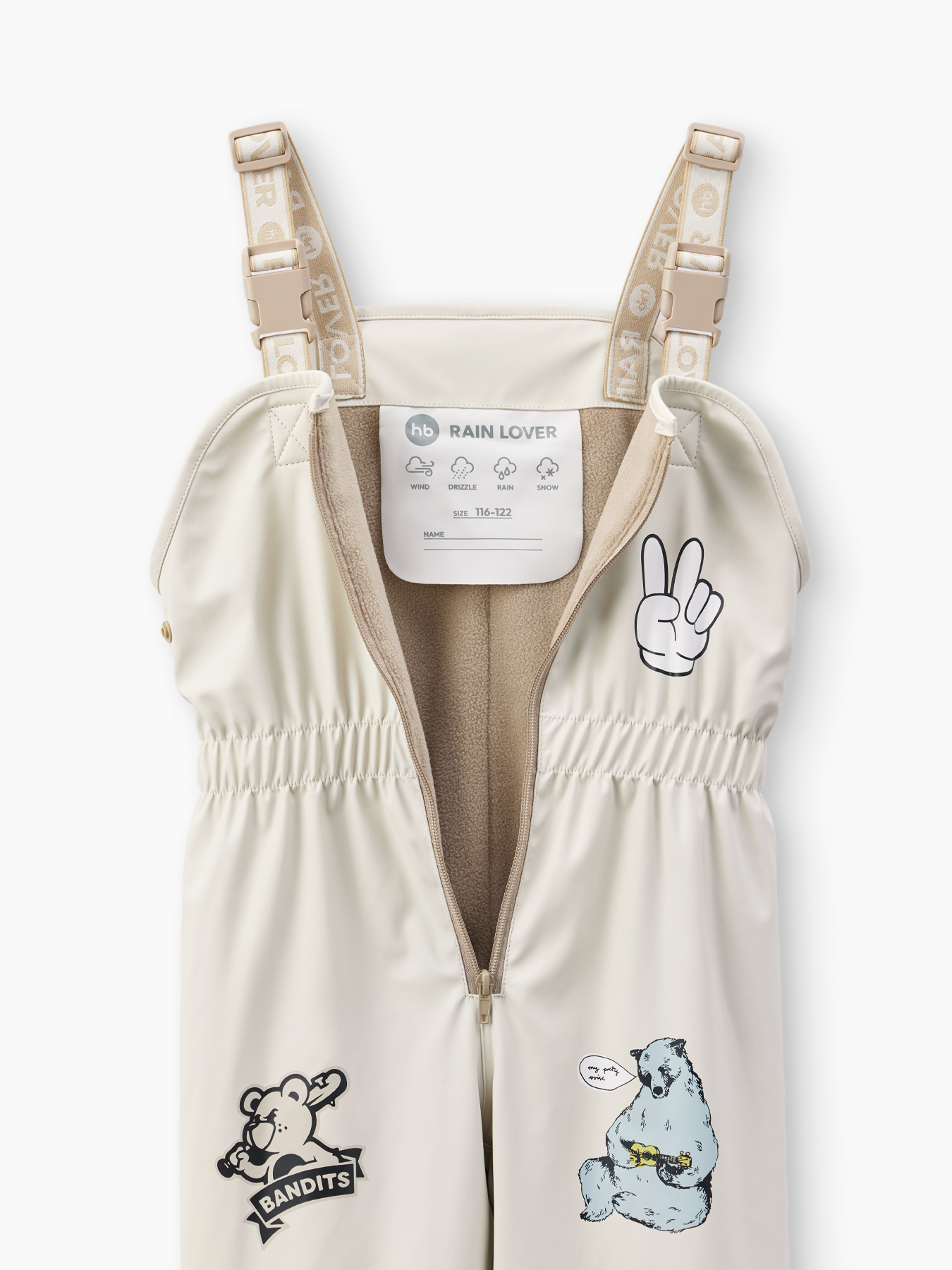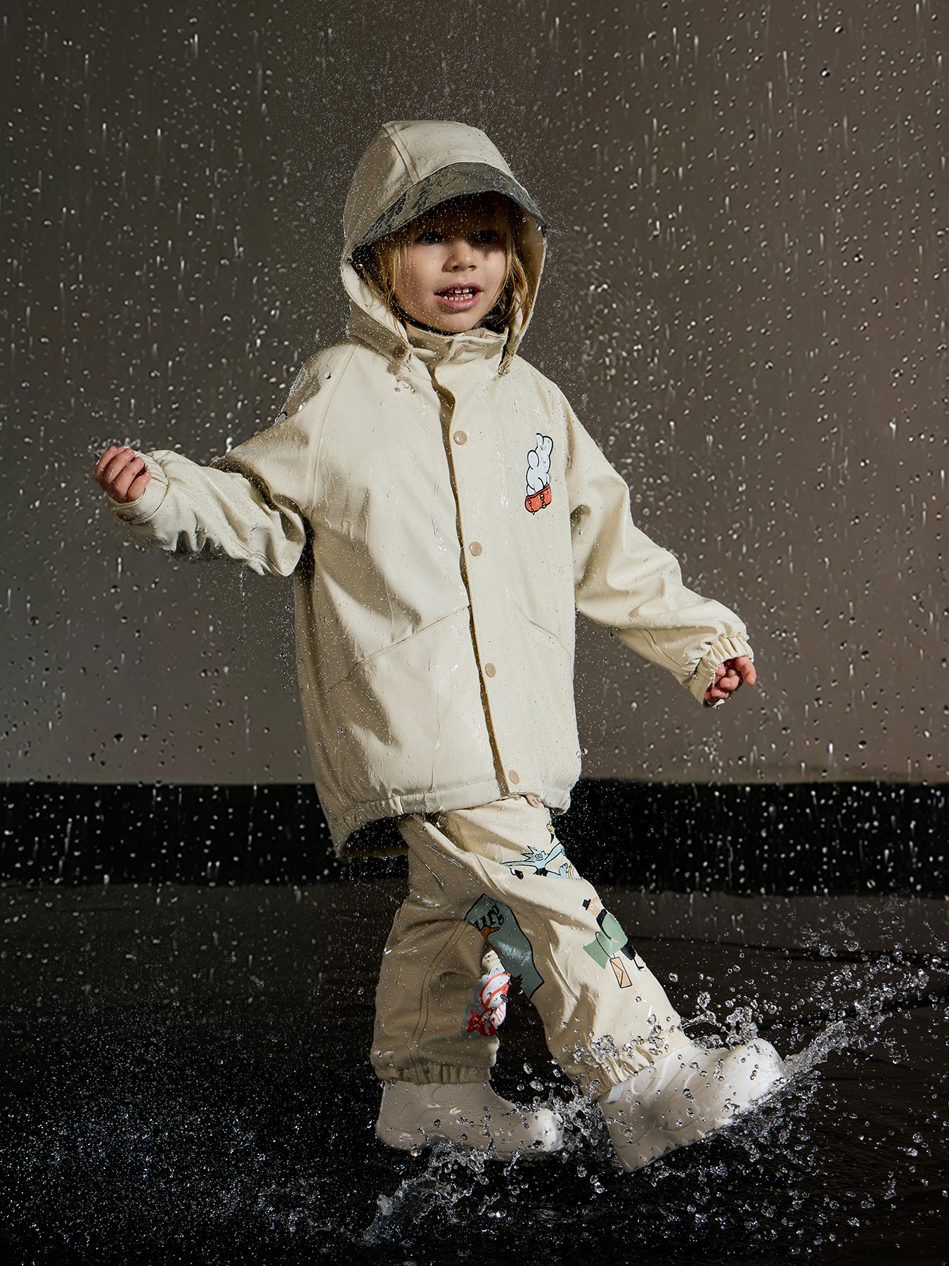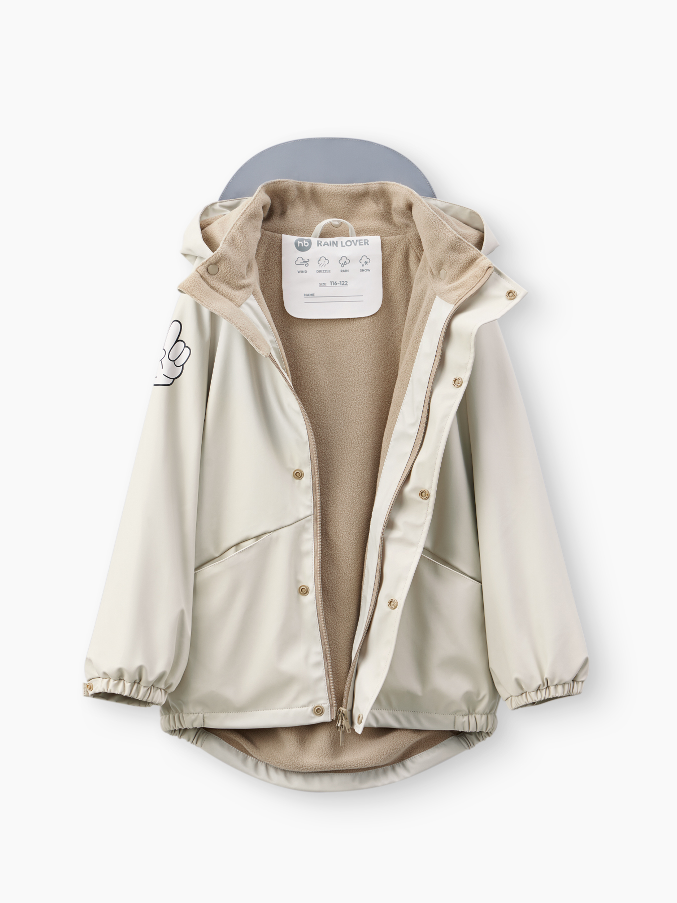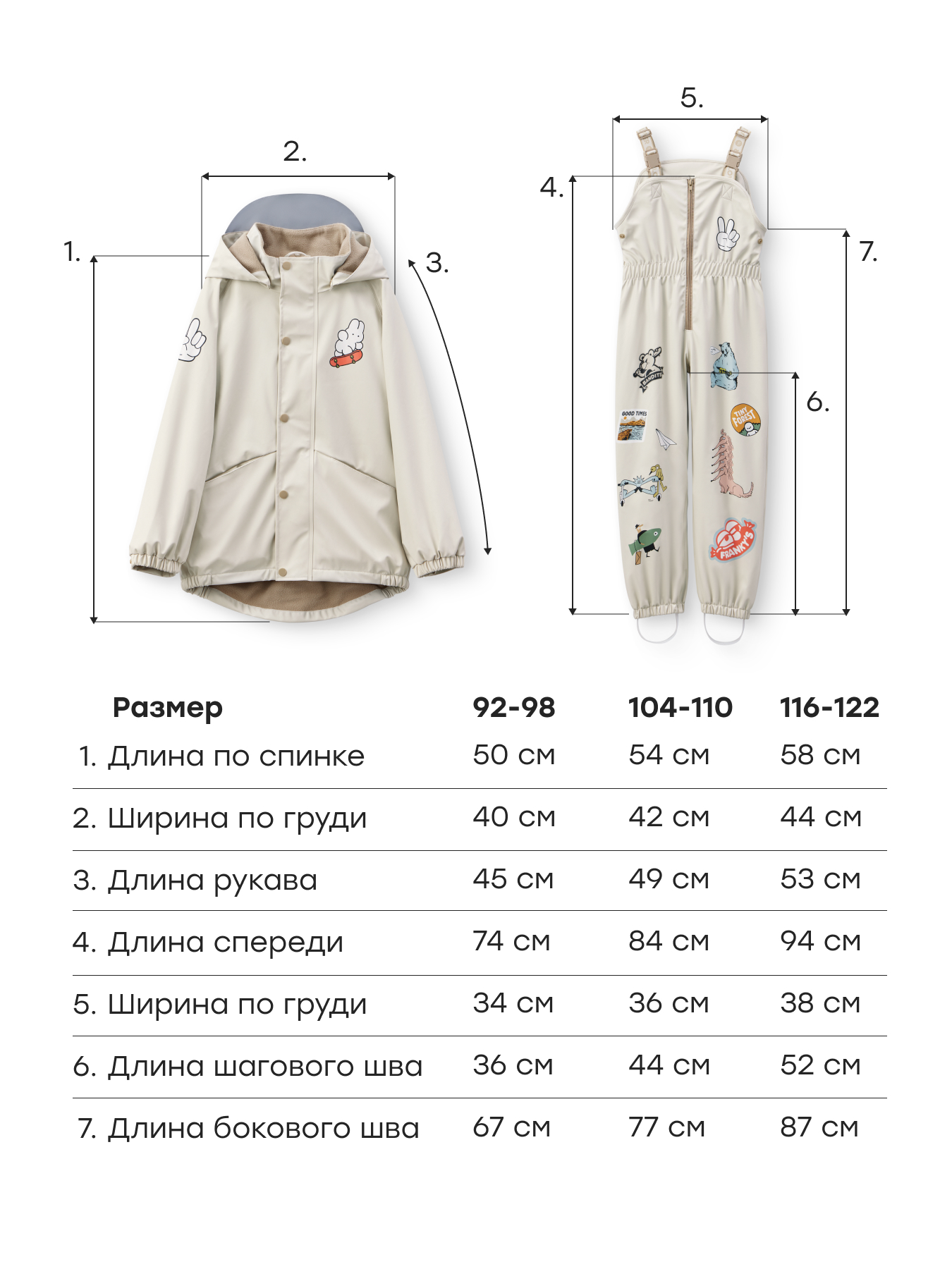 Непромокаемый комплект позволит весело гулять в любую погоду. Сверху – водонепроницаемая ткань с показателем 5000 мм, внутри – мягкий флис, который приятен коже и не даёт малышу вспотеть. На брюках и куртке есть светоотражатели для безопасности прогулок в вечернее время. У полукомбинезона регулируемые лямки. Удобная застёжка – молния спереди – позволяет быстро надевать и снимать брюки. Эластичная резинка на талии обеспечивает правильную посадку и дополнительную защиту от ветра. Куртка свободного кроя с капюшоном снабжена планкой, закрывающей молнию, и манжетами на резинке – чтобы гулять было тепло и комфортно. Материал, из которого изготовлен комплект, прост в уходе и быстро сохнет.