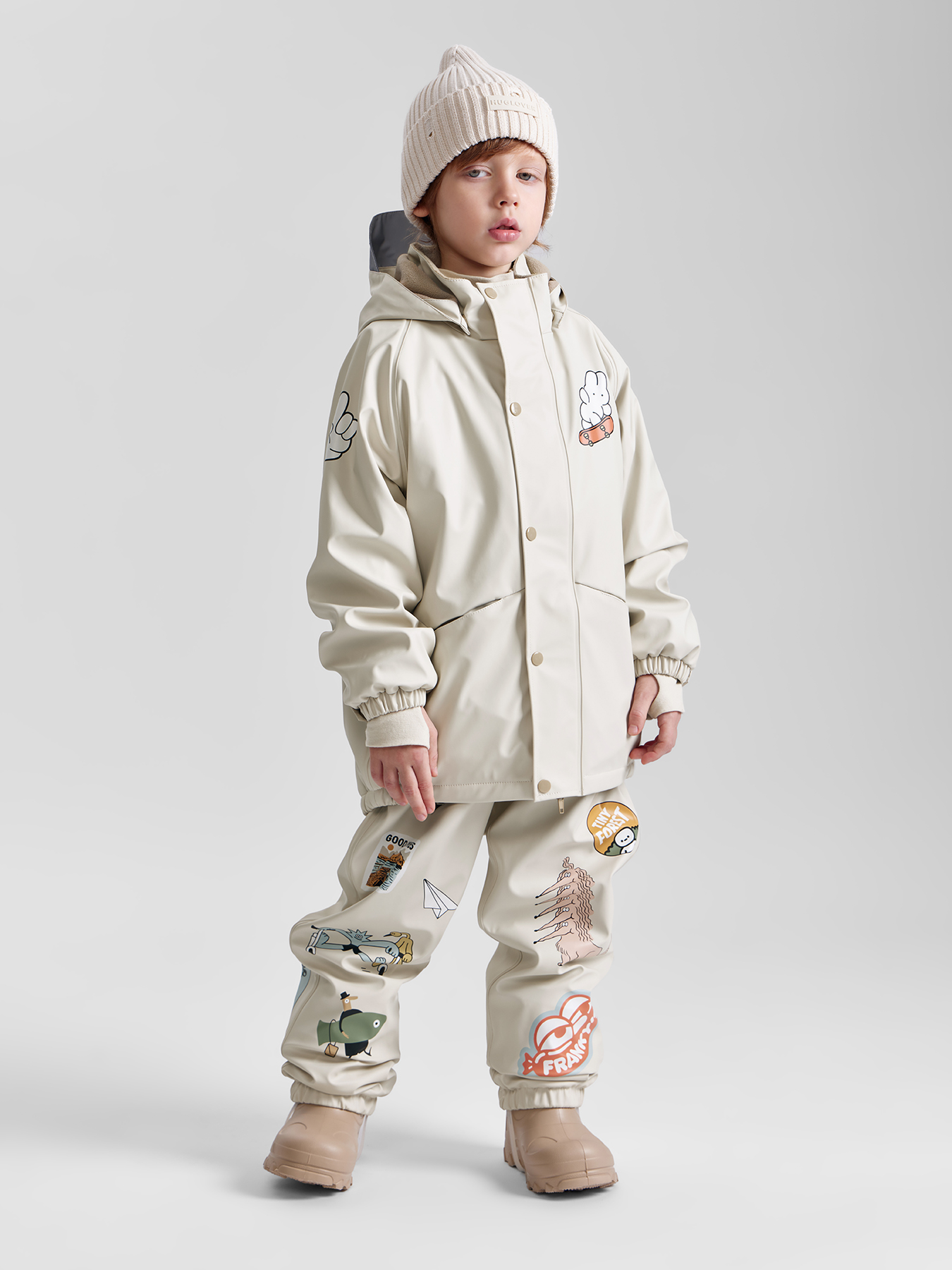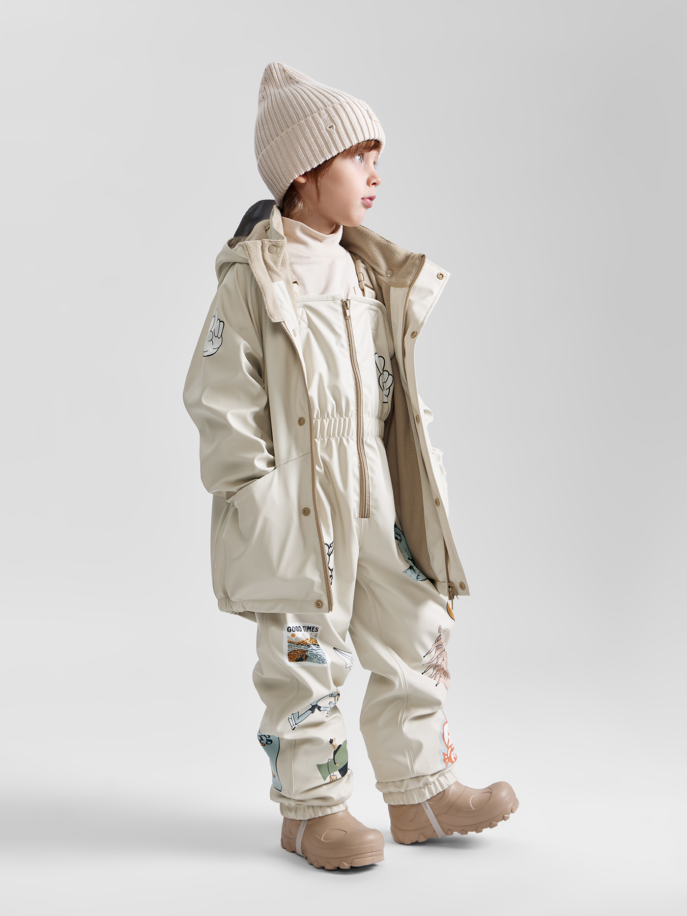 Непромокаемый комплект позволит весело гулять в любую погоду. Сверху – водонепроницаемая ткань с показателем 5000 мм, внутри – мягкий флис, который приятен коже и не даёт малышу вспотеть. На брюках и куртке есть светоотражатели для безопасности прогулок в вечернее время. У полукомбинезона регулируемые лямки. Удобная застёжка – молния спереди – позволяет быстро надевать и снимать брюки. Эластичная резинка на талии обеспечивает правильную посадку и дополнительную защиту от ветра. Куртка свободного кроя с капюшоном снабжена планкой, закрывающей молнию, и манжетами на резинке – чтобы гулять было тепло и комфортно. Материал, из которого изготовлен комплект, прост в уходе и быстро сохнет.