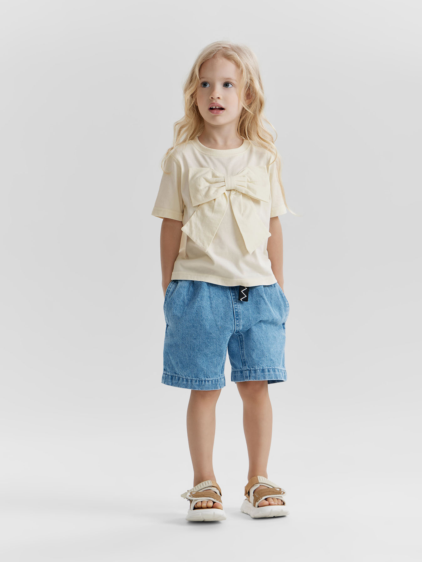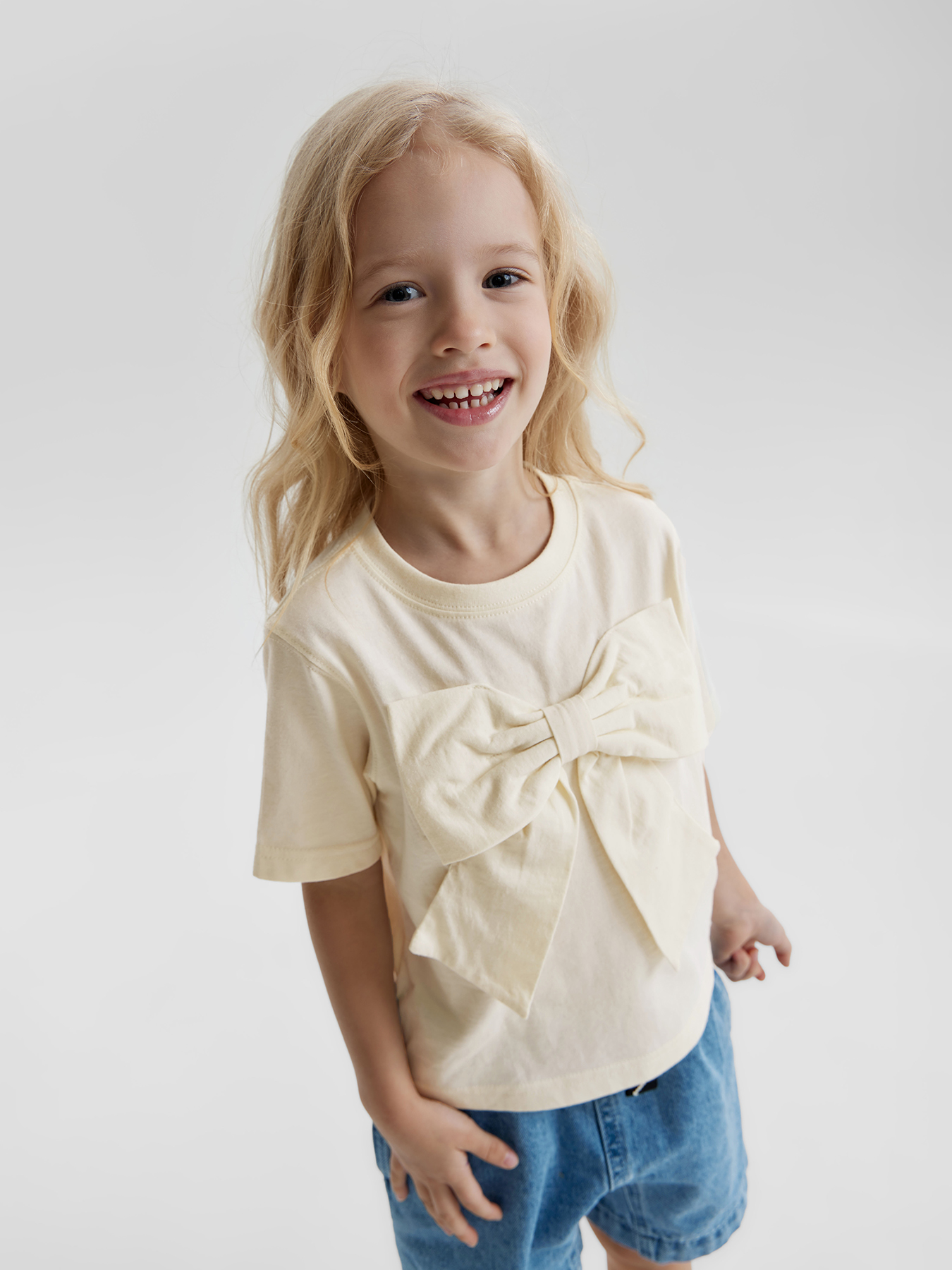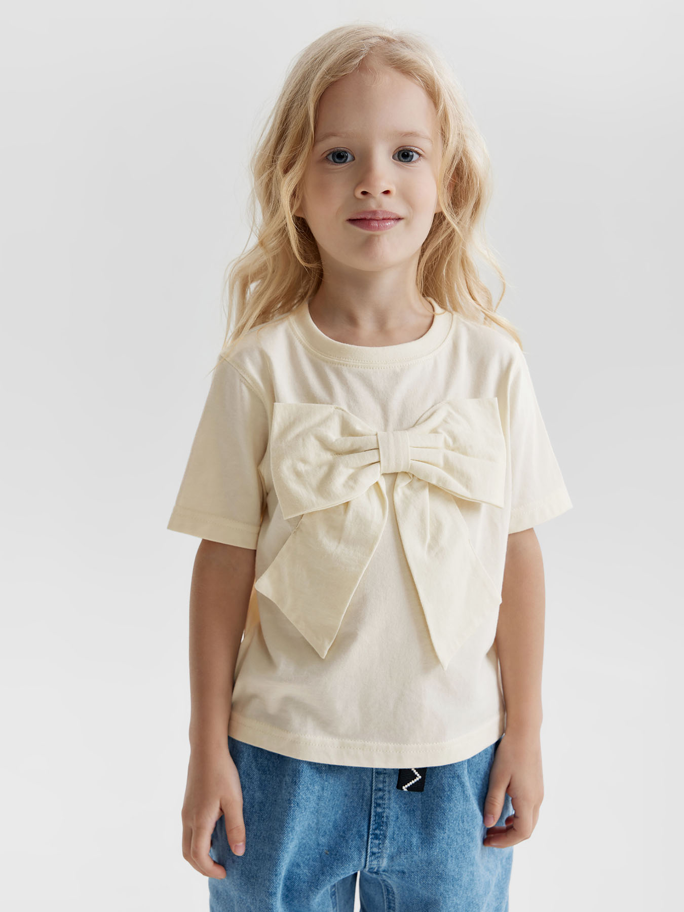 Классическая футболка становится акцентом в гардеробе благодаря украшению из банта в тон. Такой предмет легко вписать в гардероб, составляя комплекты в разных стилях. Сшита из 100% хлопка. Приятный материал дышит и дарит комфорт в течение всего дня. Горловина укреплена и не вытягивается. Футболка выдерживает множество стирок, сохраняя форму и цвет.