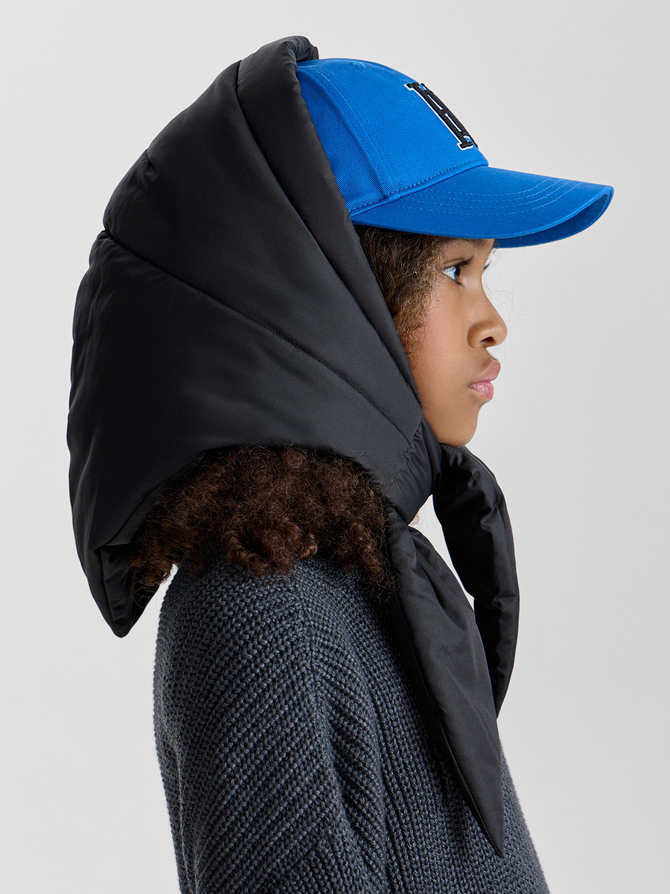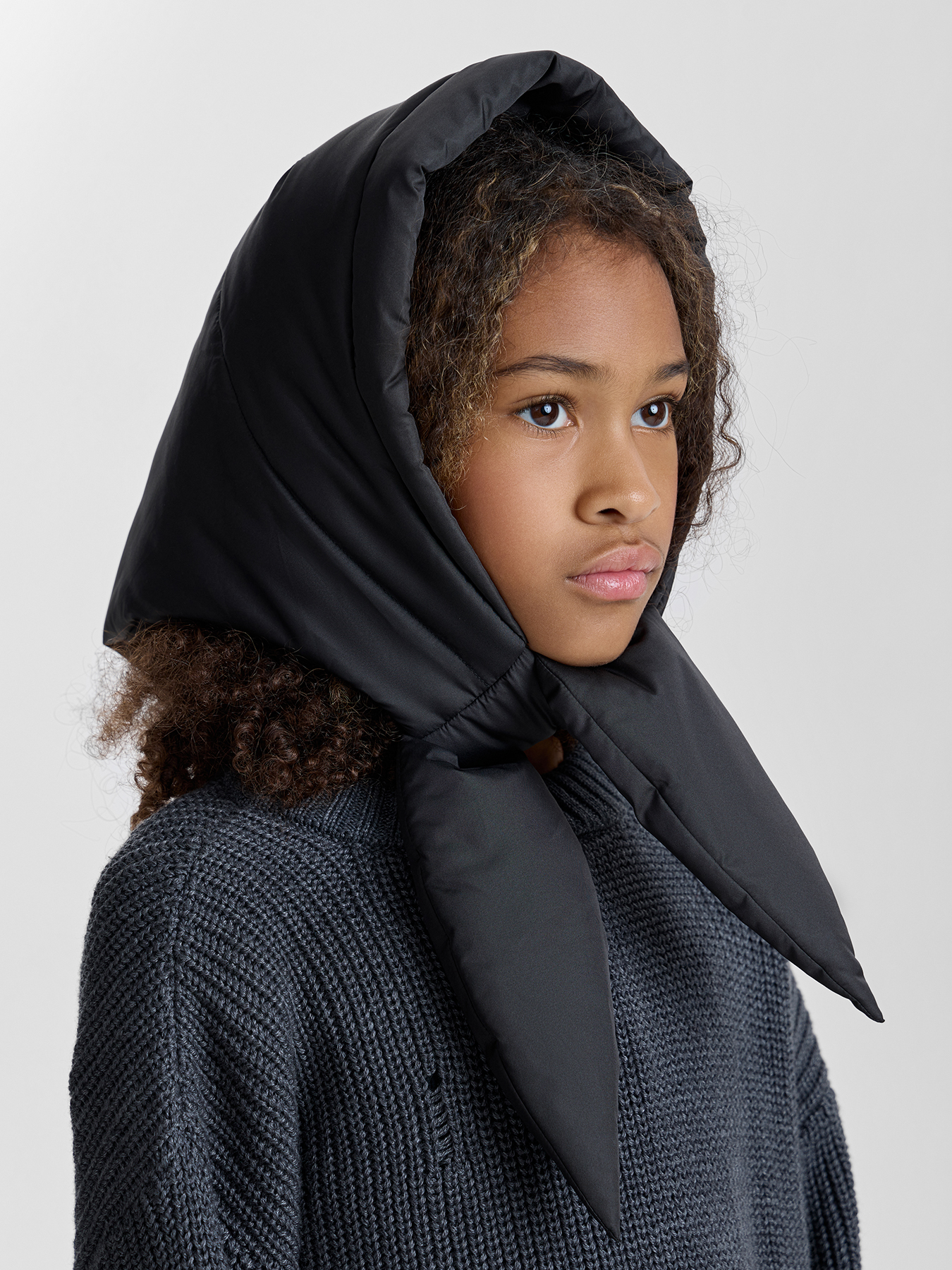 • Тёплая косынка с завязками — закрывает уши и шею ребёнка, удерживает тепло и надёжно защищает от ветра