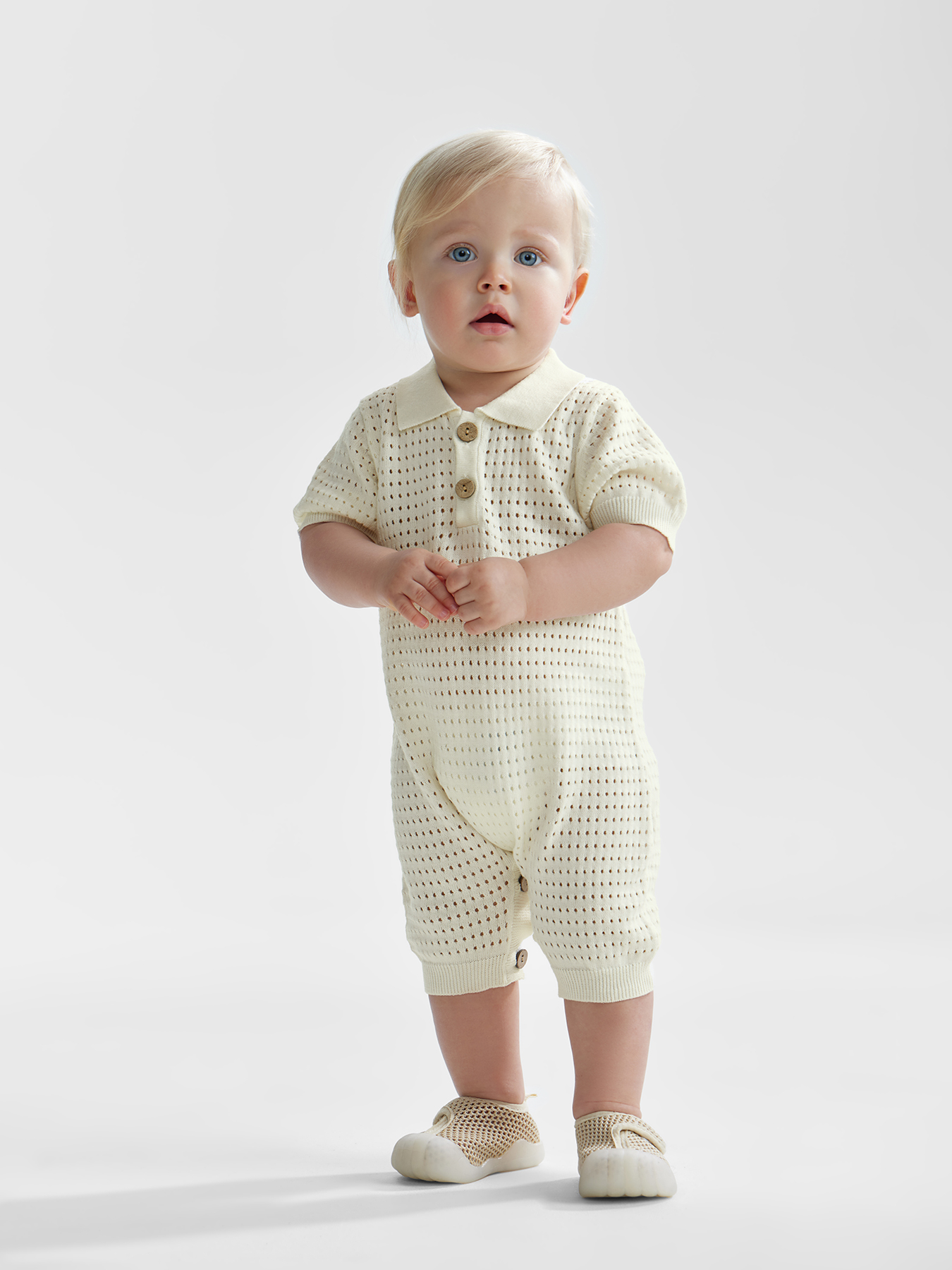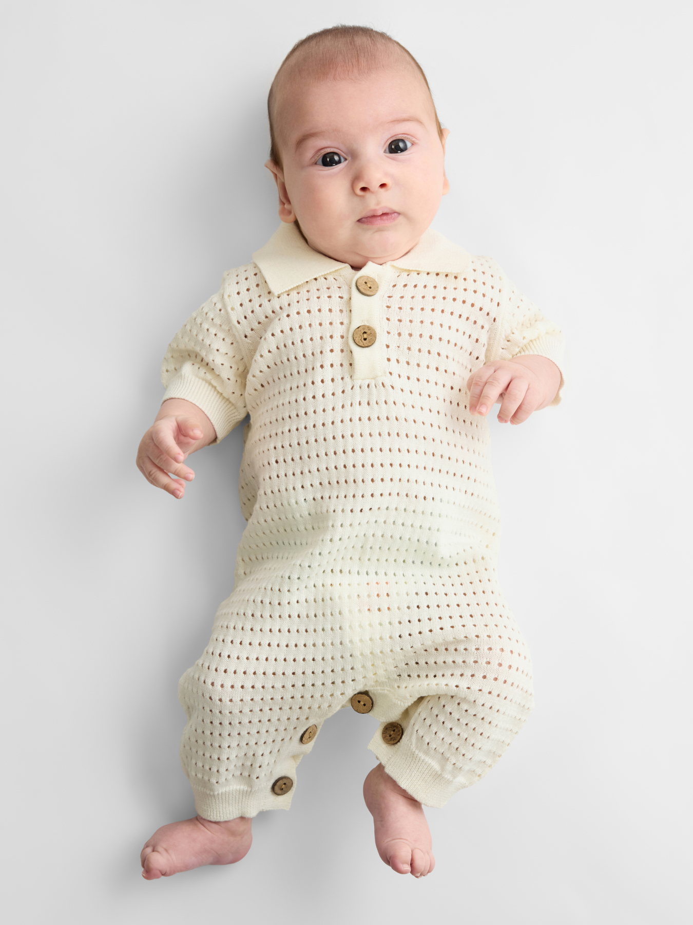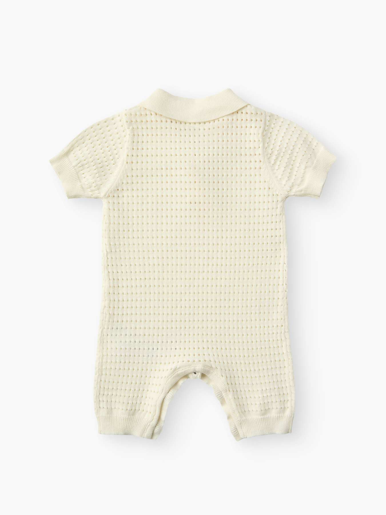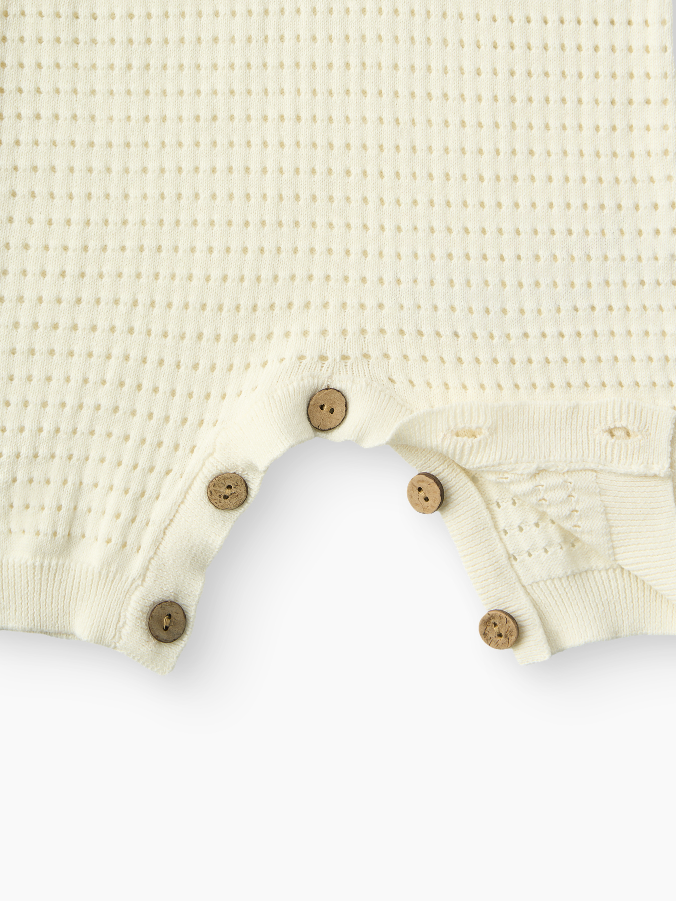Вязаный комбинезон-песочник с отложным воротничком и рукавами-фонариками обеспечивает стиль с самого рождения. Благодаря пуговицам у горловины комбинезон легко надевать и снимать. Кнопки снизу облегчают смену подгузника. Связан из 100% хлопка. Натуральный материал дарит комфорт в жаркую погоду, дышит, защищает от перегрева. Стильный песочник подходит для сладкого сна и активного бодрствования.