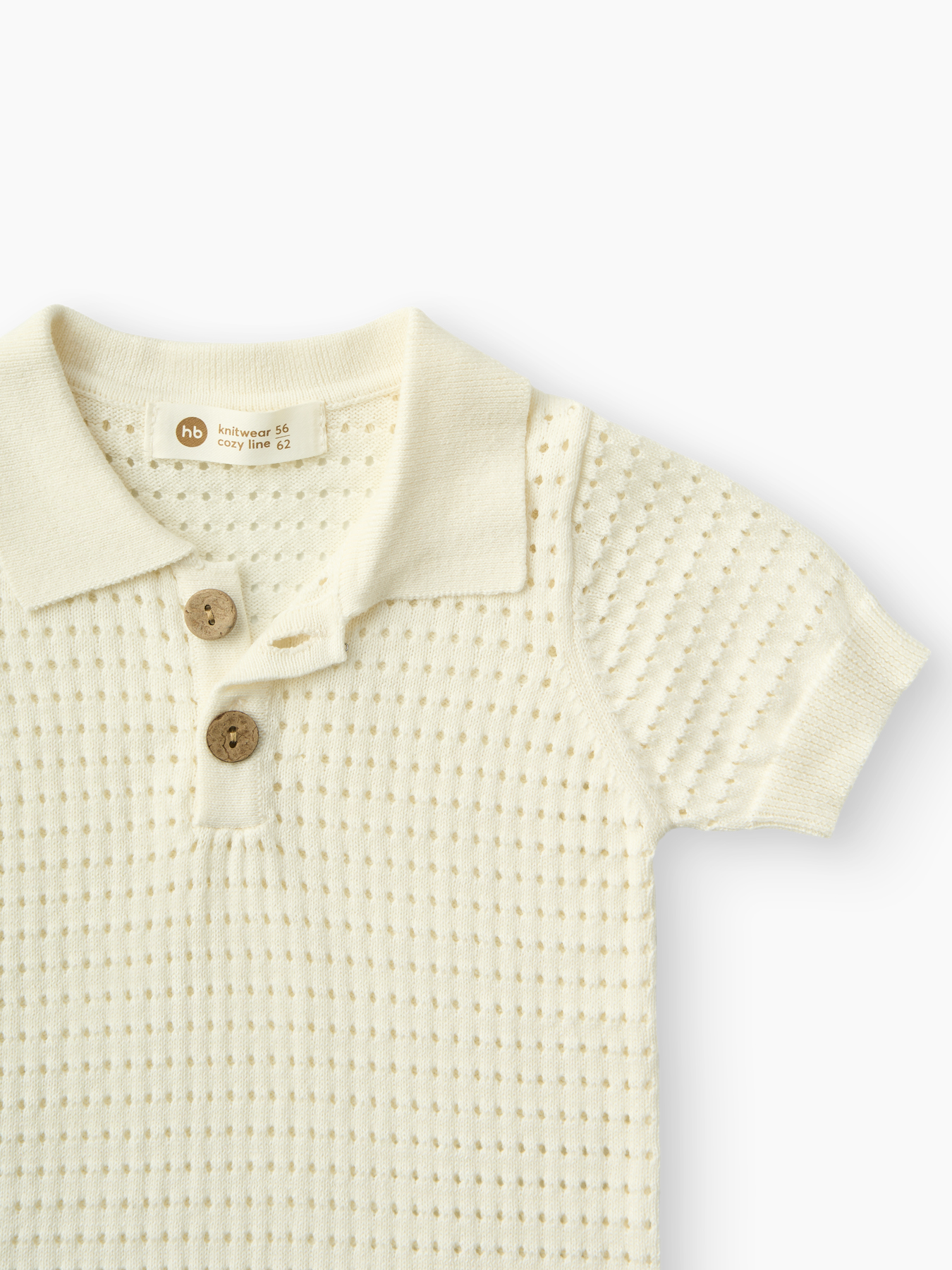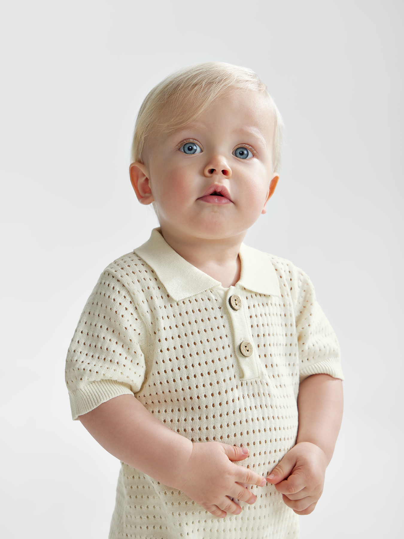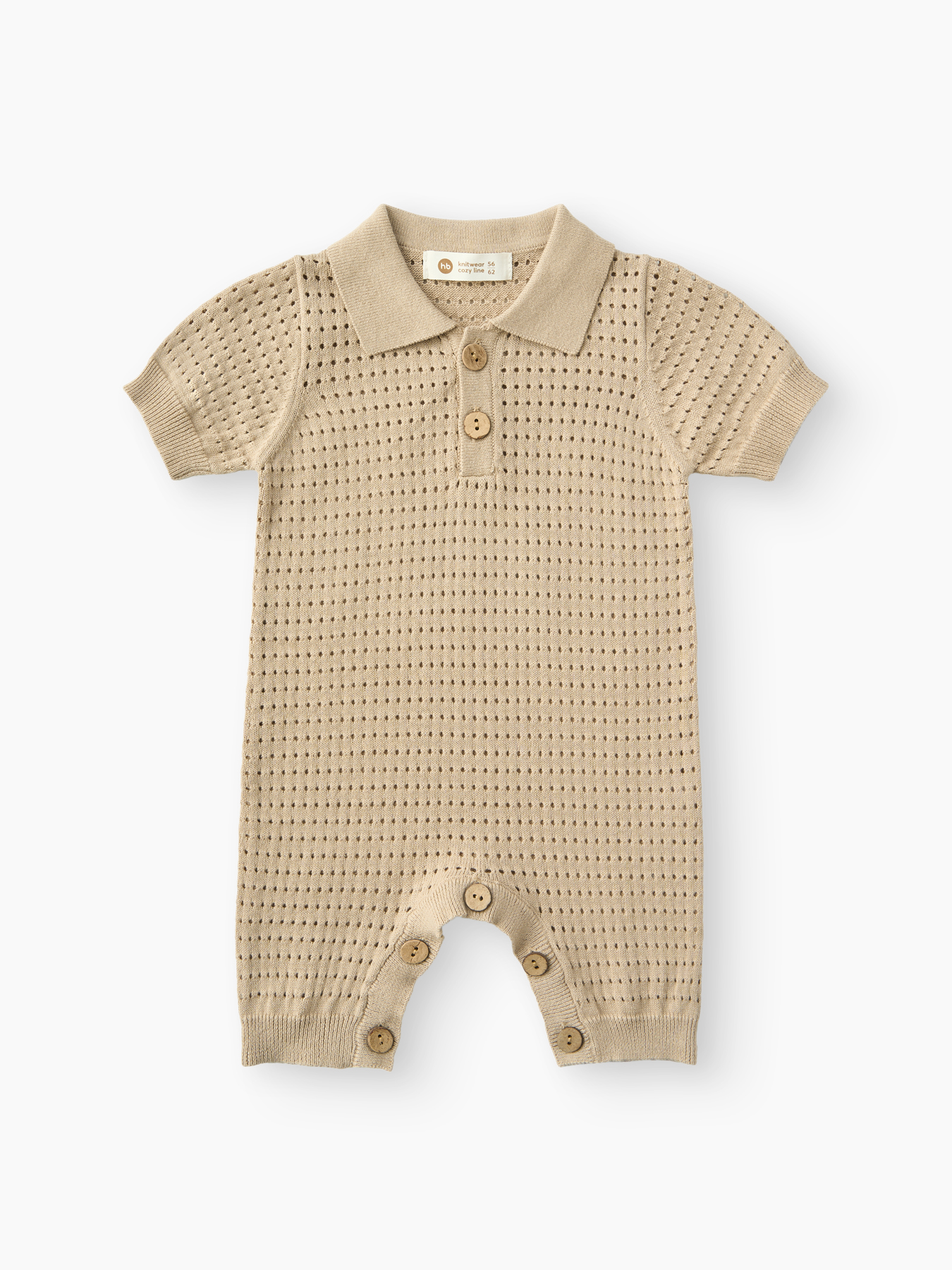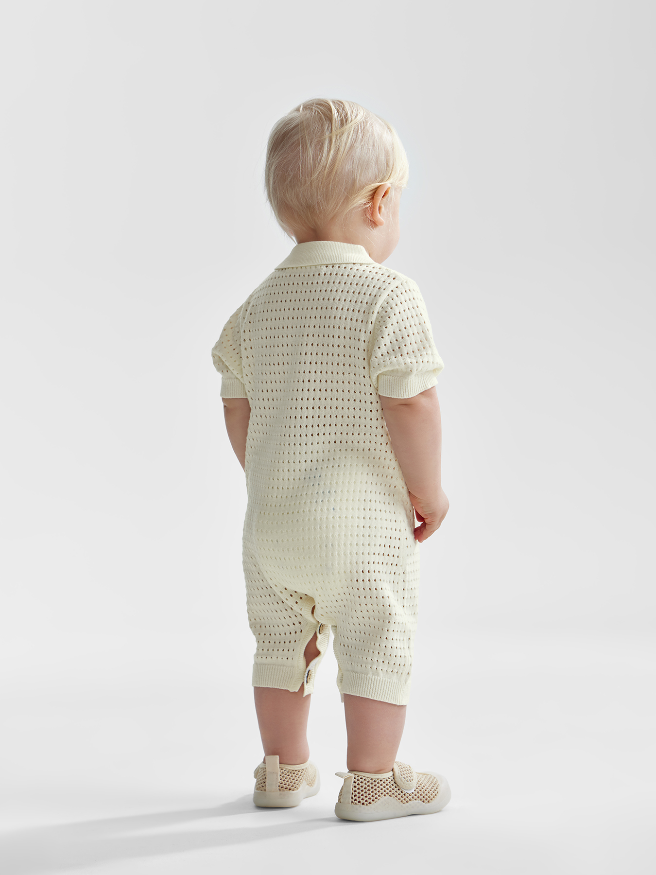 Вязаный комбинезон-песочник с отложным воротничком и рукавами-фонариками обеспечивает стиль с самого рождения. Благодаря пуговицам у горловины комбинезон легко надевать и снимать. Кнопки снизу облегчают смену подгузника. Связан из 100% хлопка. Натуральный материал дарит комфорт в жаркую погоду, дышит, защищает от перегрева. Стильный песочник подходит для сладкого сна и активного бодрствования.